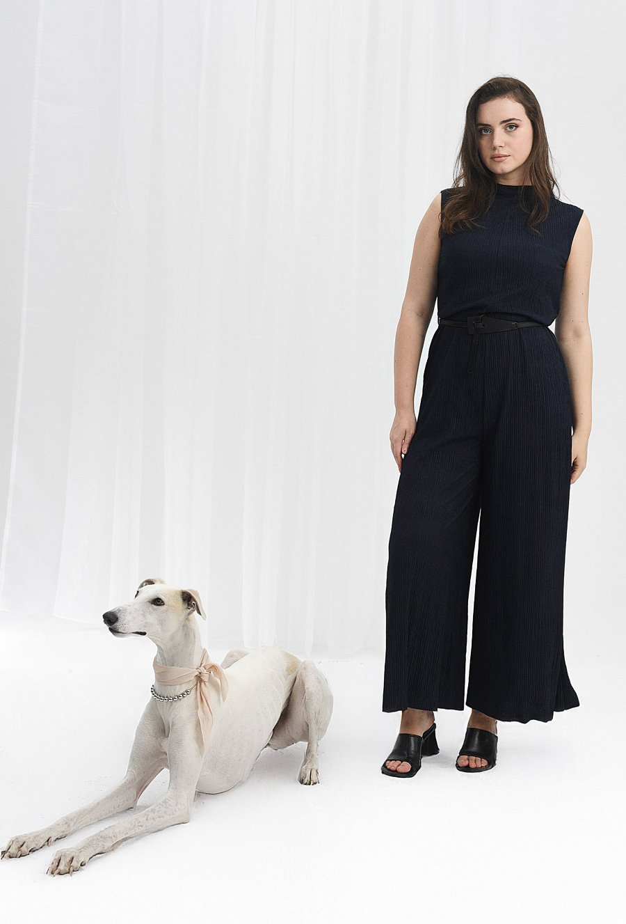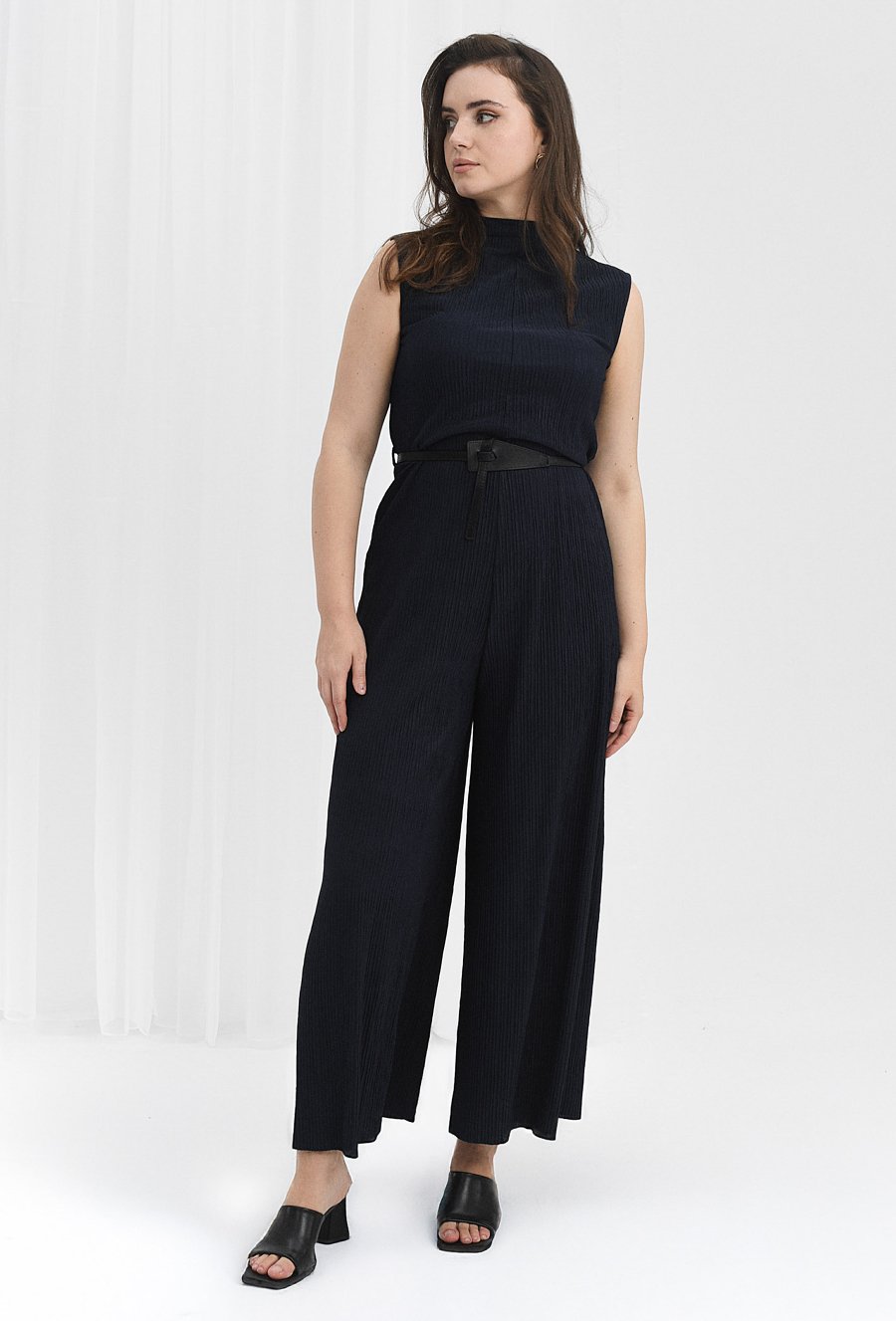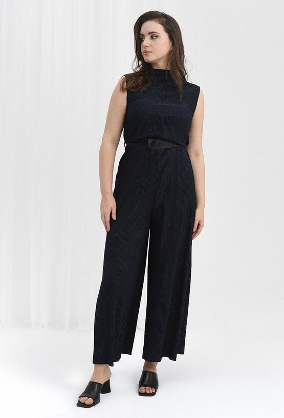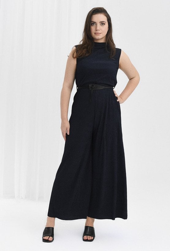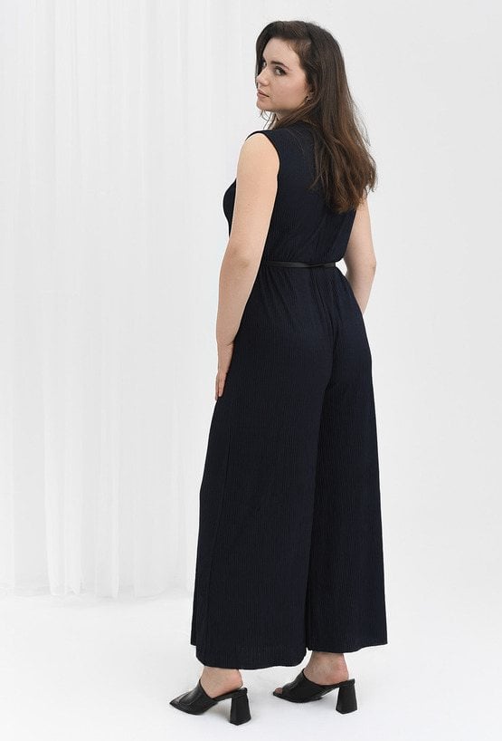 Elegancki kombinezon wykonany ze strukturalnej tkaniny, który dodaje wdzięku każdej stylizacji. Ma zabudowany dekolt i szerokie nogawki, a zapinany jest na zamek. W zestawie znajduje się czarny pasek, który dopełnia całość. Dzięki elastanowi kombinezon jest elastyczny co czyni go bardzo komfortowym. Modelka na zdjęciu ma 179 cm wzrostu i prezentuje rozmiar 40.