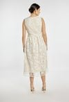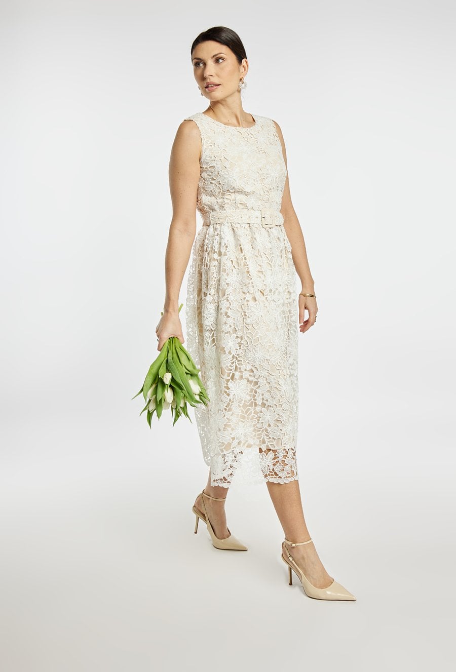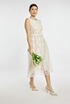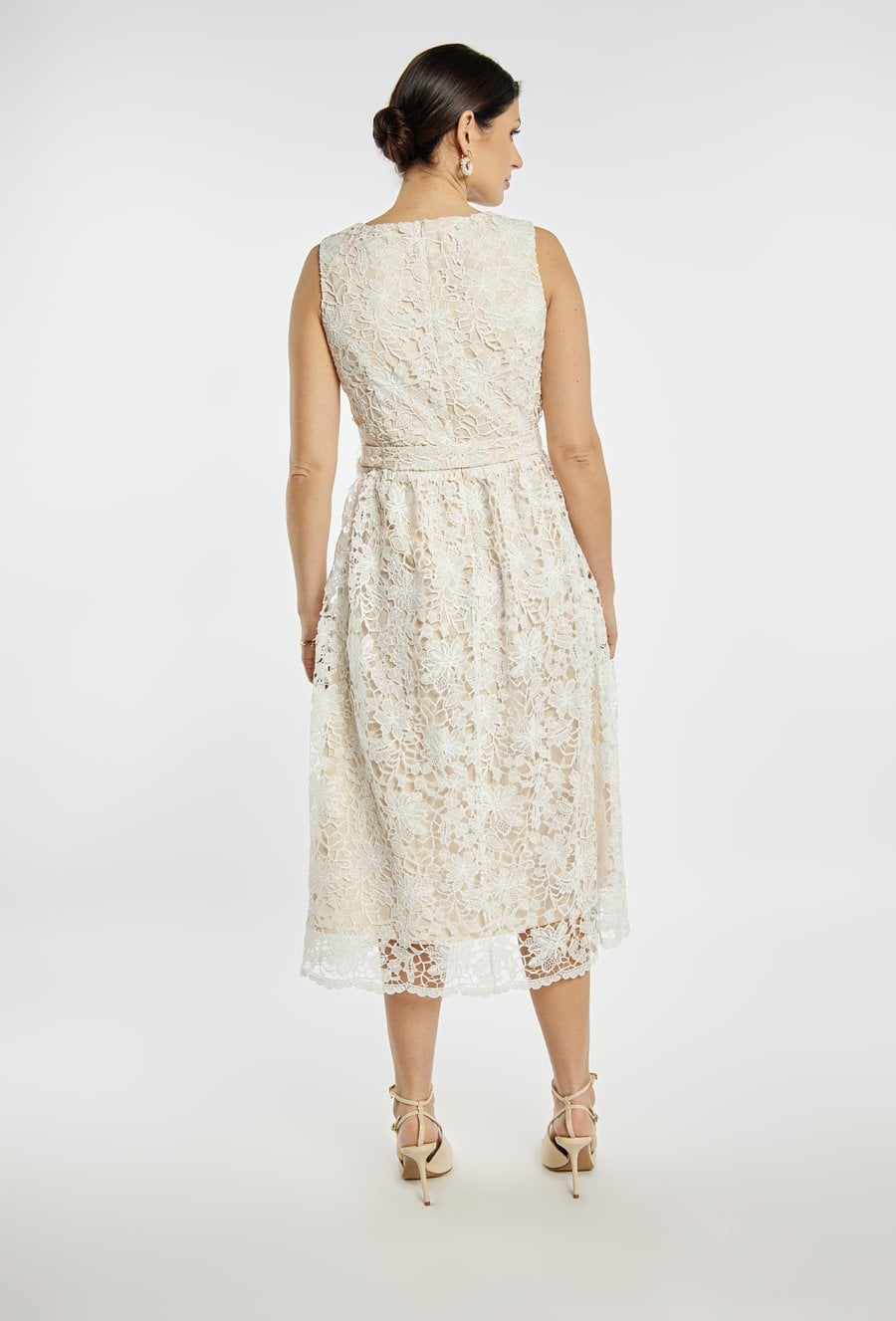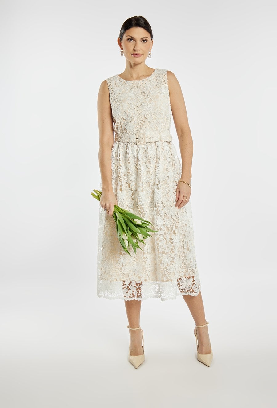 Elegancka sukienka damska o długości midi bez rękawów. Model wykonany z efektownej koronki, z paskiem w talii, który podkreśla sylwetkę i nadaje stylizacji klasycznego charakteru. Sukienka doskonale sprawdzi się na komunię, przyjęcia, wesele oraz inne uroczystości. Modelka na zdjęciu ma 177 cm wzrostu i prezentuje rozmiar 36