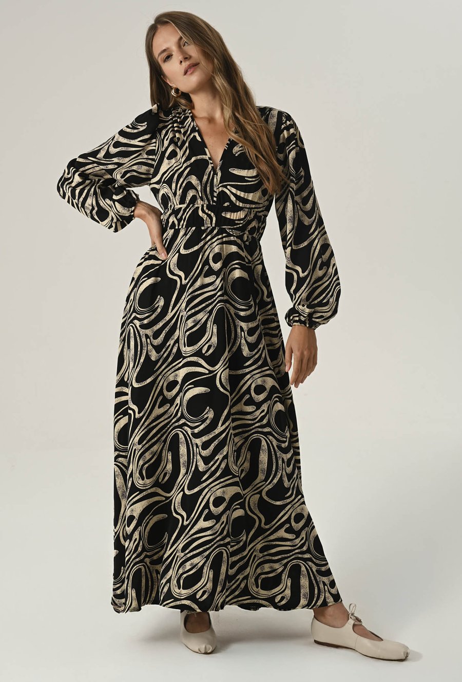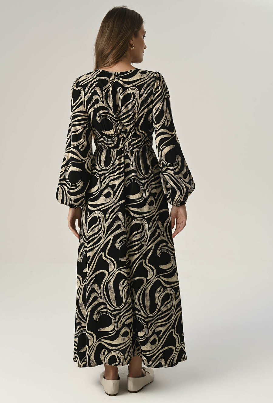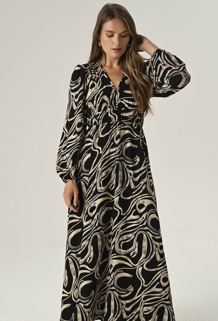 Długa, kobieca sukienka z dekoltem w literę V to połączenie wygody i stylu. Długi rękaw zakończony delikatną gumką oraz elastyczna talia podkreślają sylwetkę, zapewniając komfort noszenia. Stonowane, duże printy dodają sukience elegancji i uniwersalnego charakteru. Idealna na co dzień i wyjątkowe okazje. Modelka na zdjęciu ma 176 cm wzrostu i prezentuje rozmiar S
