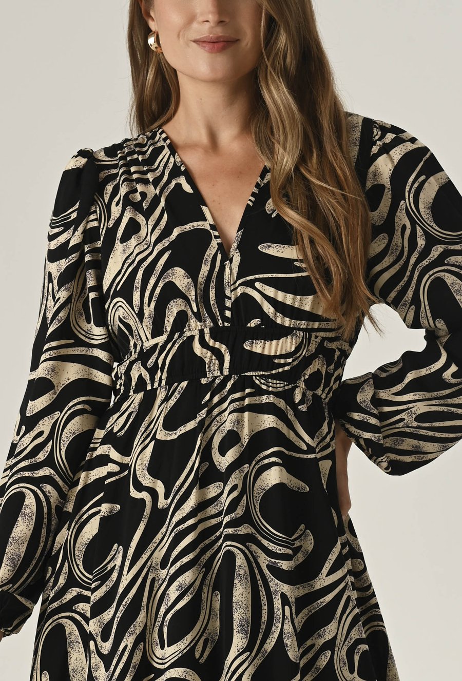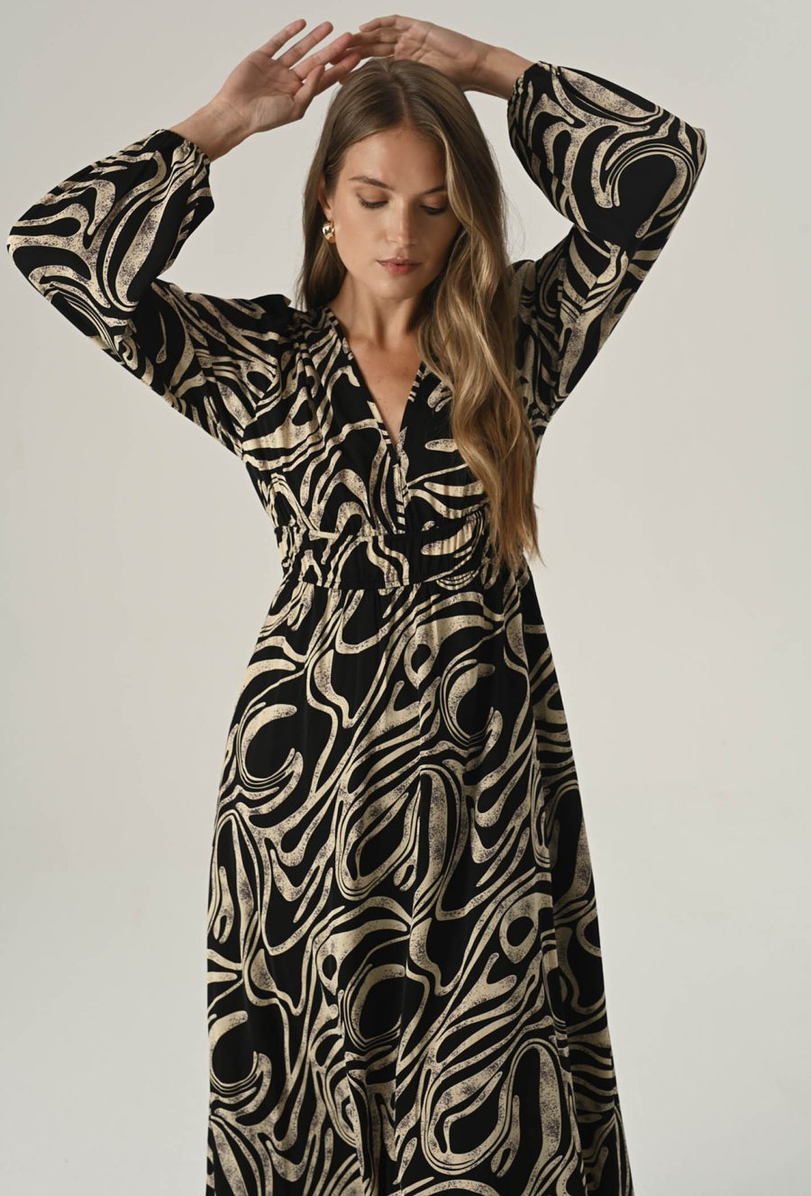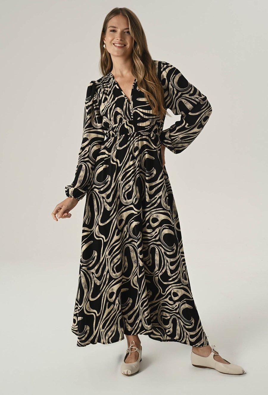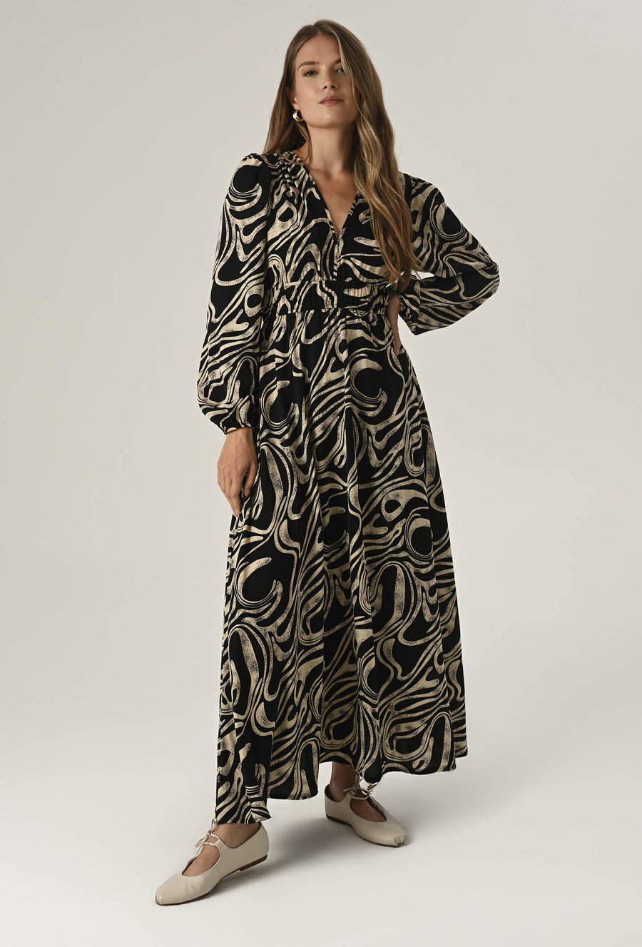 Długa, kobieca sukienka z dekoltem w literę V to połączenie wygody i stylu. Długi rękaw zakończony delikatną gumką oraz elastyczna talia podkreślają sylwetkę, zapewniając komfort noszenia. Stonowane, duże printy dodają sukience elegancji i uniwersalnego charakteru. Idealna na co dzień i wyjątkowe okazje. Modelka na zdjęciu ma 176 cm wzrostu i prezentuje rozmiar S