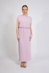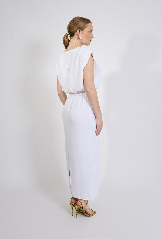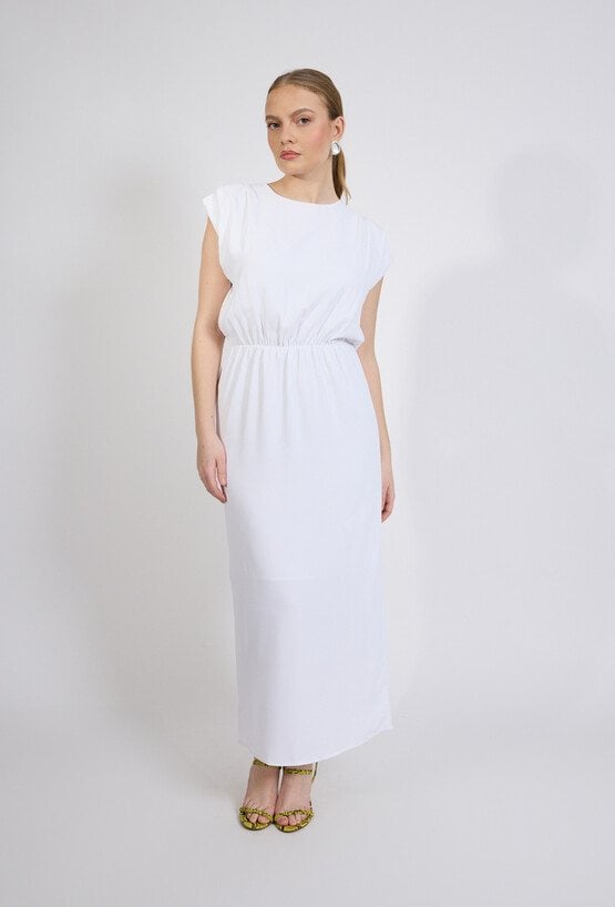 Sukienka damska o długości maxi w minimalistycznym, eleganckim stylu. Model z krótkim, lekko opadającym rękawem oraz klasycznym, zaokrąglonym dekoltem. W talii zastosowano elastyczne marszczenie, które subtelnie podkreśla sylwetkę i zapewnia komfort noszenia. Damska sukienka doskonale sprawdzi się zarówno na co dzień, jak i na bardziej eleganckie okazje. Modelka na zdjęciu ma 177 cm wzrostu i prezentuje rozmiar S.