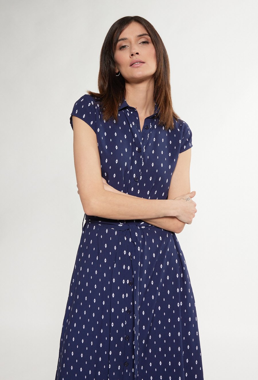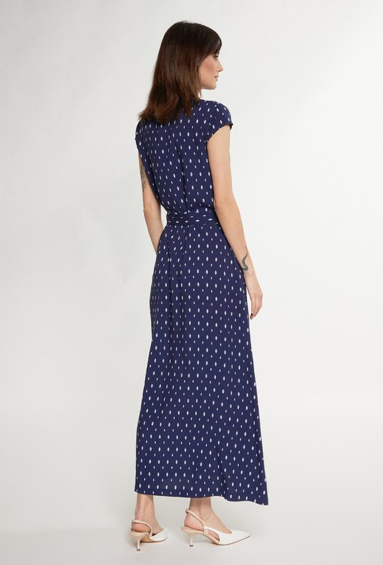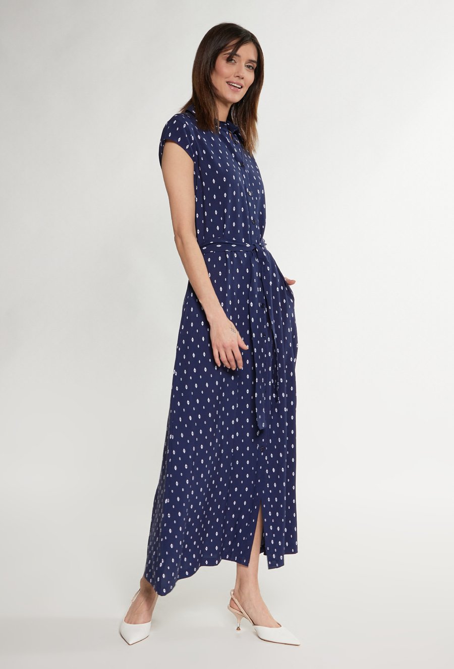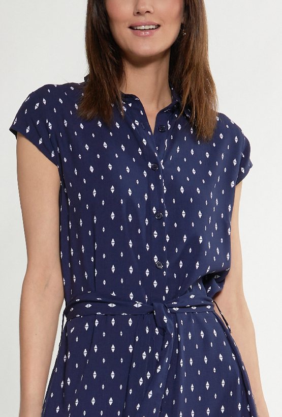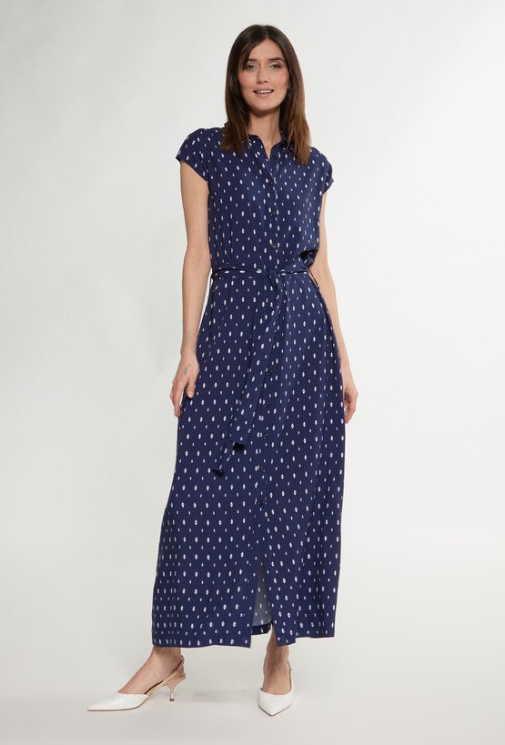 Sukienka damska z wzorem, krótkimi rękawami oraz kołnierzem przy dekolcie. Sukienka zapinana na guziki oraz z wiązaniem w pasie. Sukienka sięgająca za kolana. Model ten z pewnością sprawdzi się zarówno na co dzień, jak i wyjątkowe okazje. Modelka na zdjęciu ma 177 cm wzrostu i prezentuje rozmiar 36.