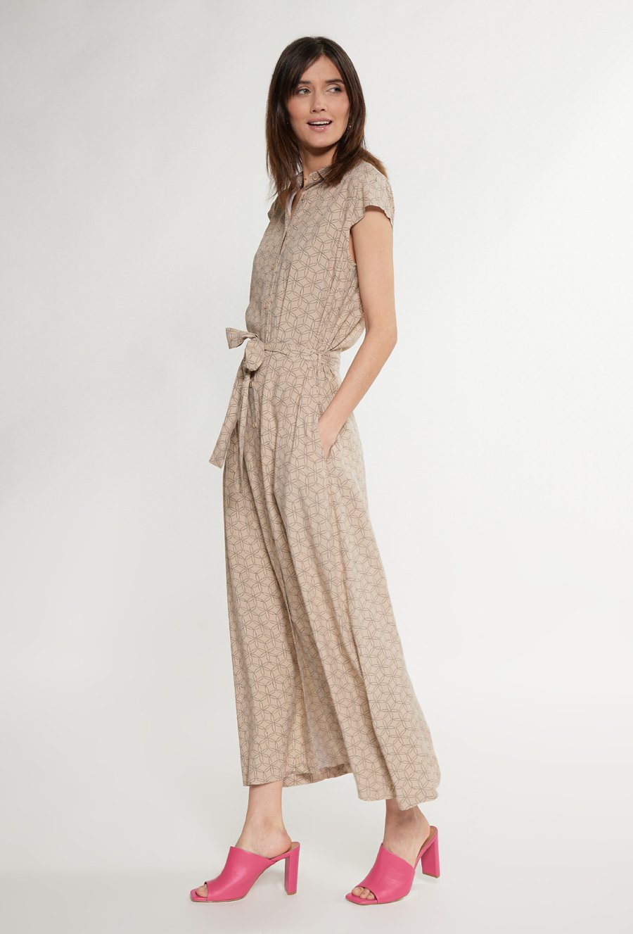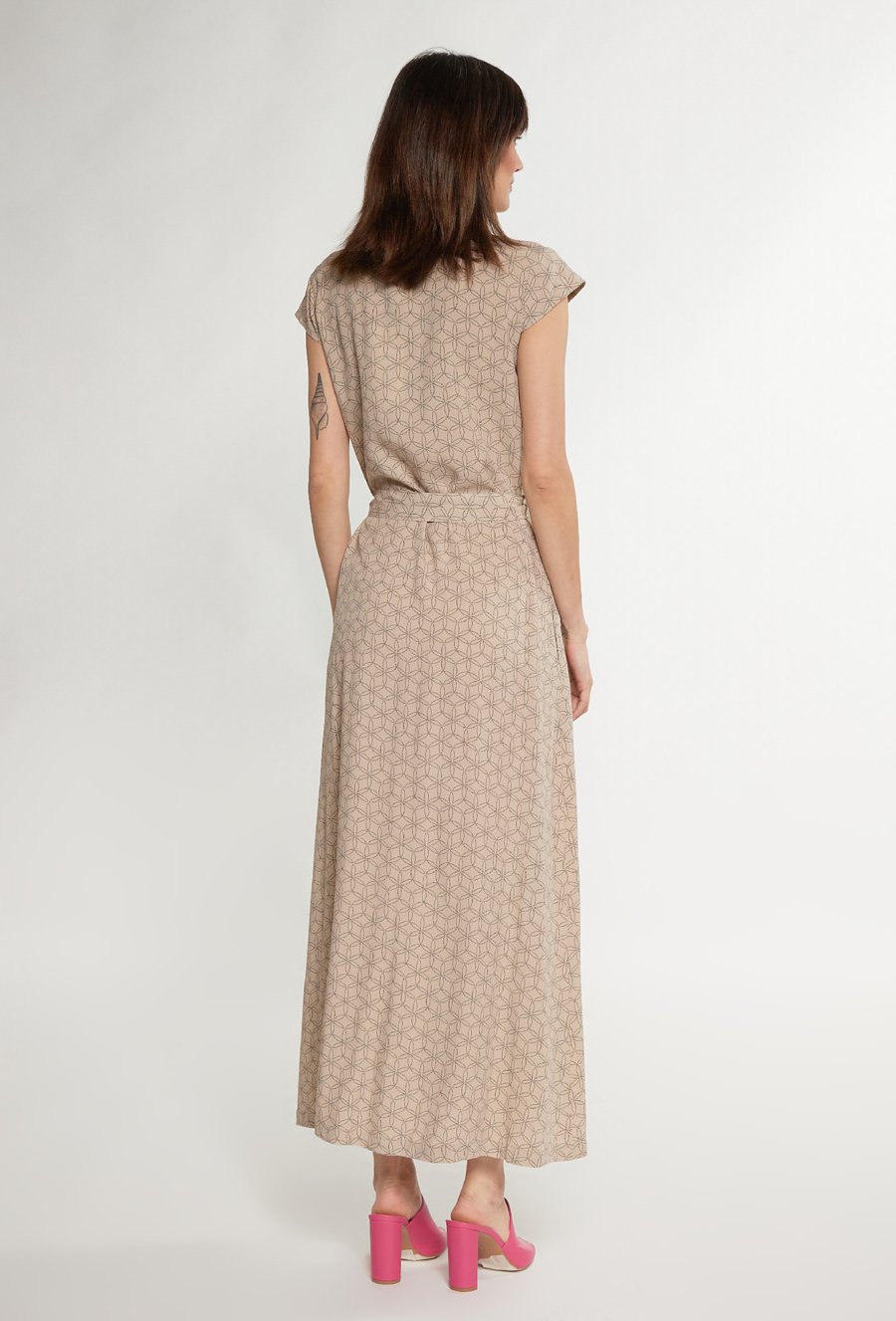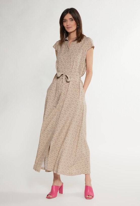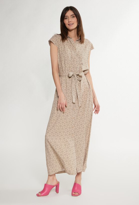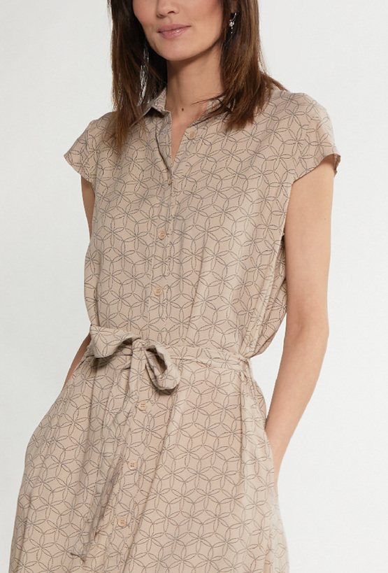 Sukienka damska z wzorem, krótkimi rękawami oraz kołnierzem przy dekolcie. Sukienka zapinana na guziki oraz z wiązaniem w pasie. Sukienka sięgająca za kolana. Model ten z pewnością sprawdzi się zarówno na co dzień, jak i wyjątkowe okazje. Modelka na zdjęciu ma 177 cm wzrostu i prezentuje rozmiar 36.