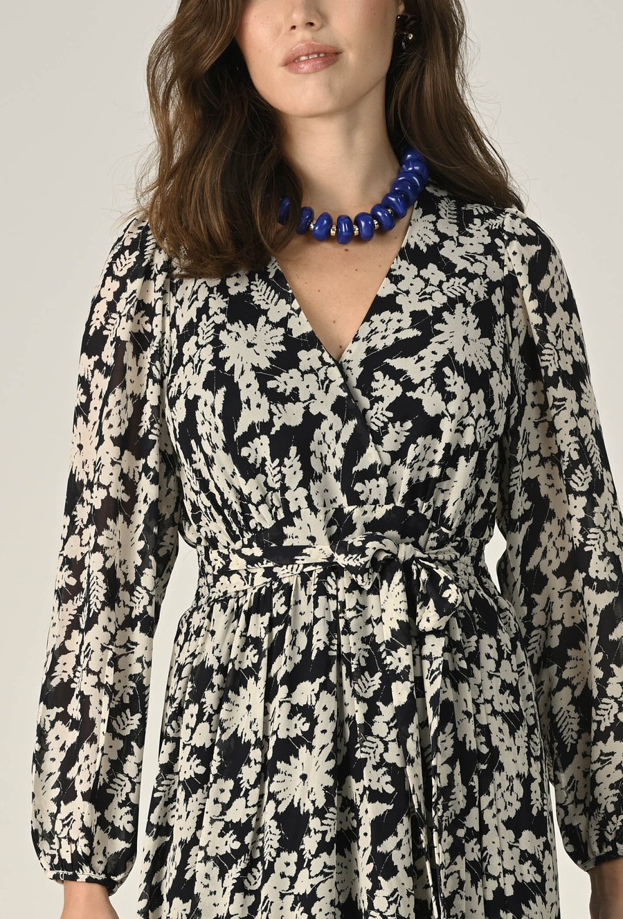 Długa sukienka wykonana z szyfonu w unikalnym princie, z elastyczną gumą w pasie, która subtelnie modeluje sylwetkę. Zapięcie na guzik z tyłu dodaje funkcjonalności i wygody. Perfekcyjna na eleganckie wyjścia, łącząc styl z komfortem. Modelka na zdjęciu ma 174 cm wzrostu i prezentuje rozmiar 36.