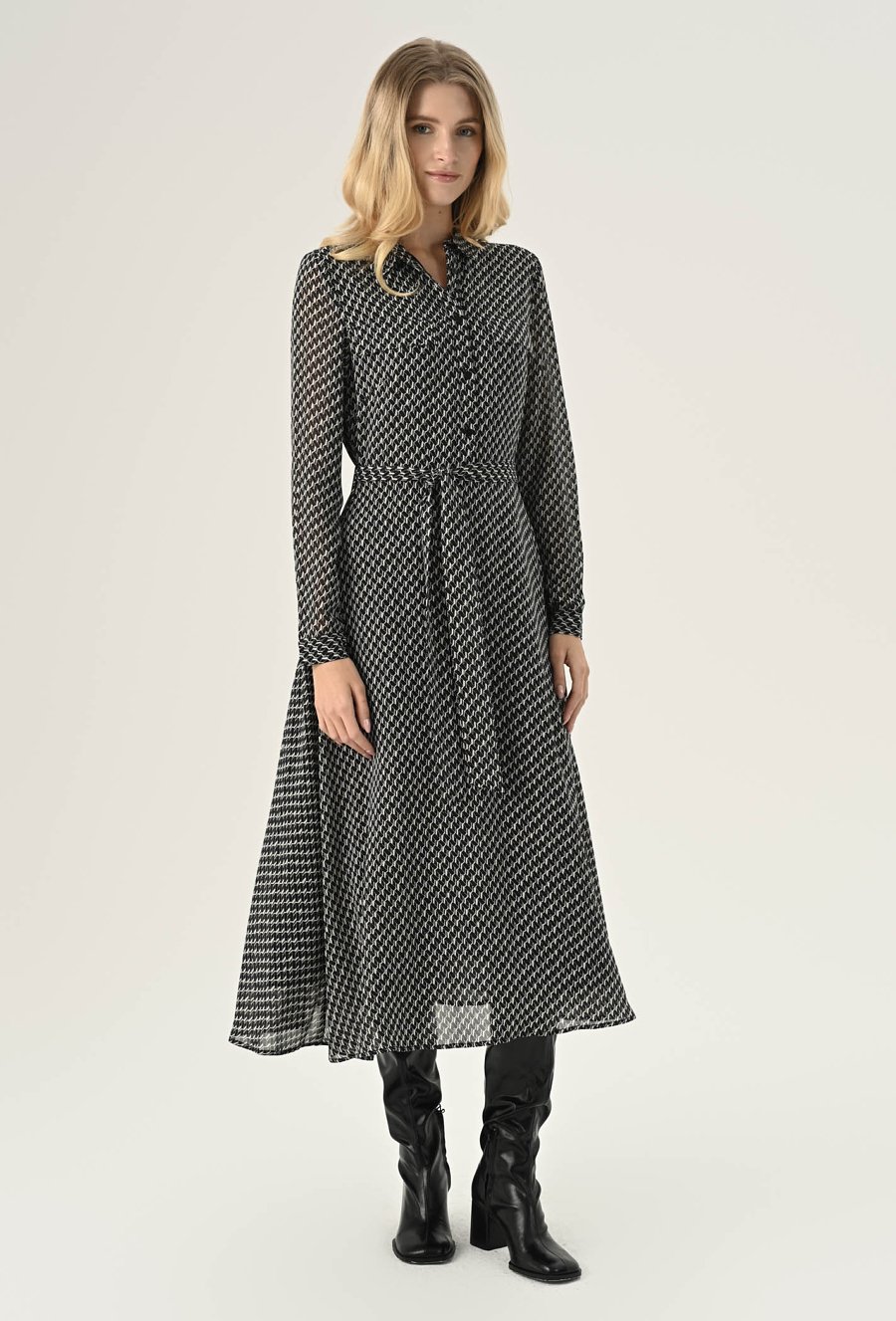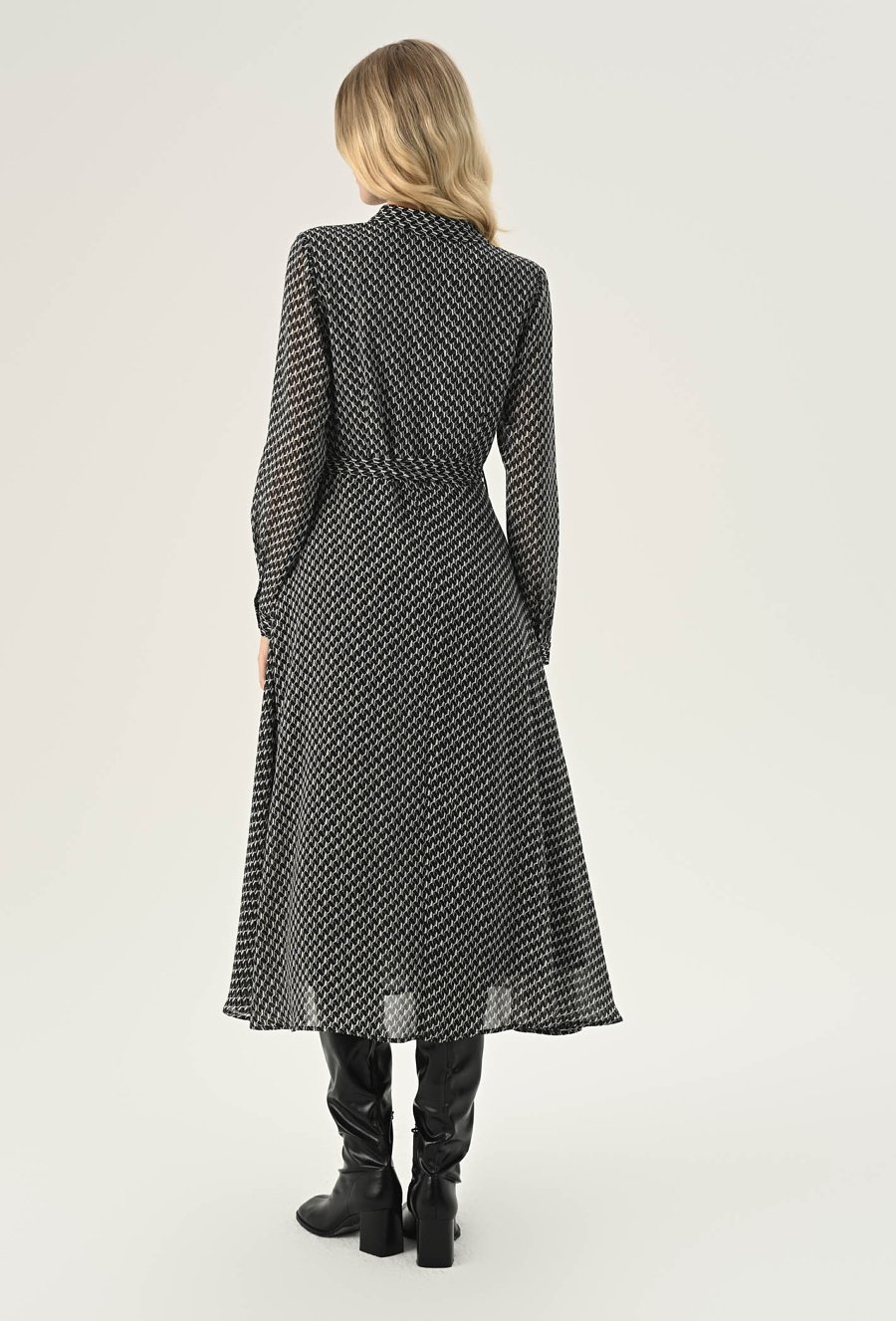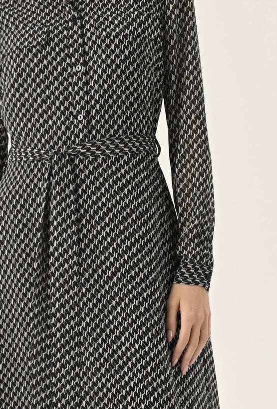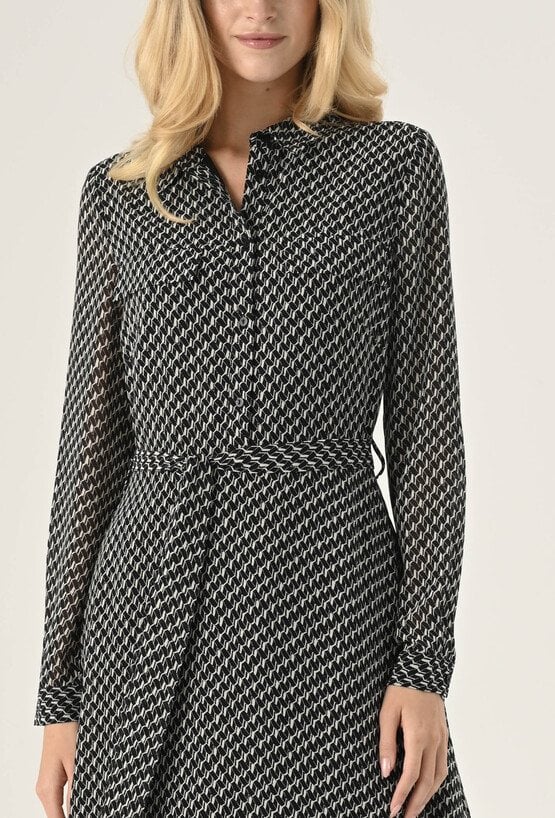 Stylowa sukienka damska o kobiecym kroju, ozdobiona modnym geometrycznym wzorem. Model posiada praktyczne kieszenie oraz subtelny zamek kryty z boku, który zapewnia wygodne zakładanie i estetyczny wygląd. Talia została podkreślona paskiem, który pięknie modeluje sylwetkę. Idealna propozycja zarówno na co dzień, jak i na bardziej formalne okazje. Modelka na zdjęciu ma 174 cm wzrostu i nosi rozmiar 36/S.