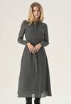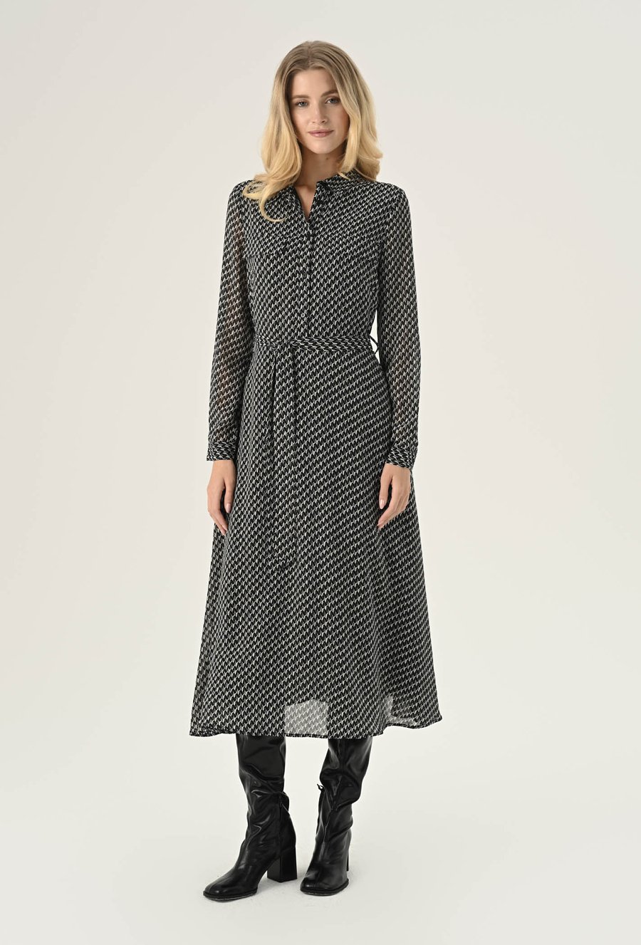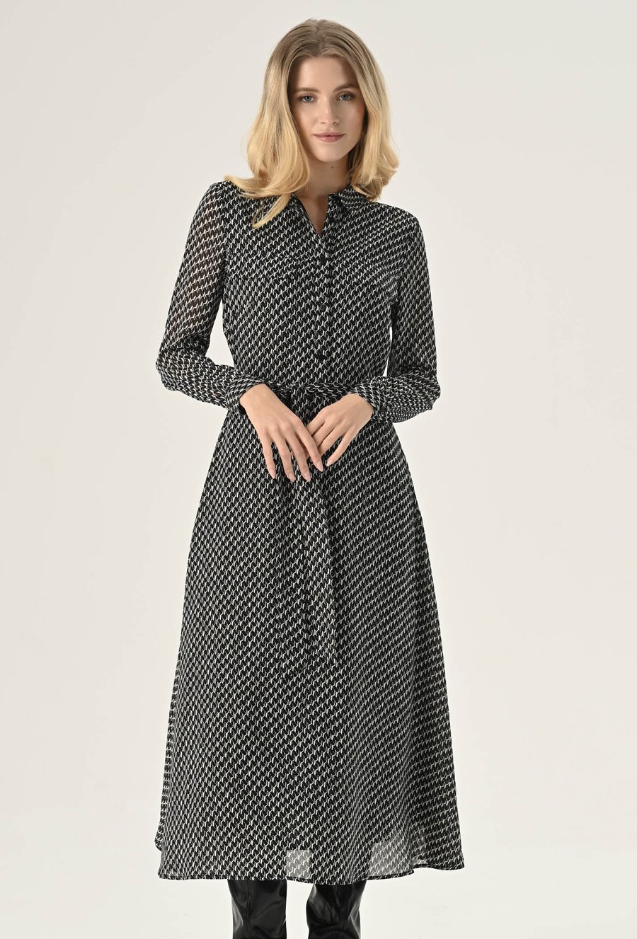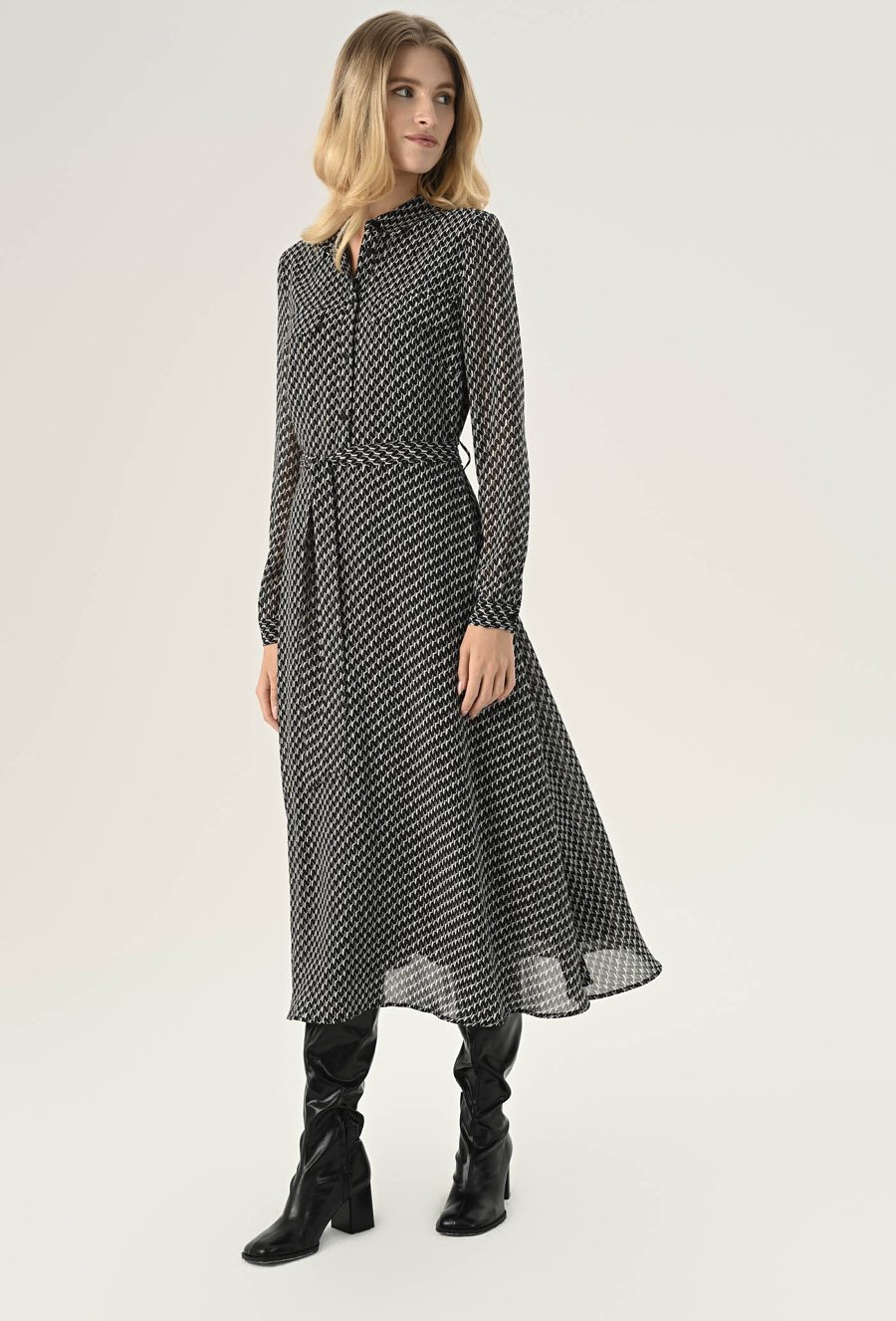 Stylowa sukienka damska o kobiecym kroju, ozdobiona modnym geometrycznym wzorem. Model posiada praktyczne kieszenie oraz subtelny zamek kryty z boku, który zapewnia wygodne zakładanie i estetyczny wygląd. Talia została podkreślona paskiem, który pięknie modeluje sylwetkę. Idealna propozycja zarówno na co dzień, jak i na bardziej formalne okazje. Modelka na zdjęciu ma 174 cm wzrostu i nosi rozmiar 36/S.