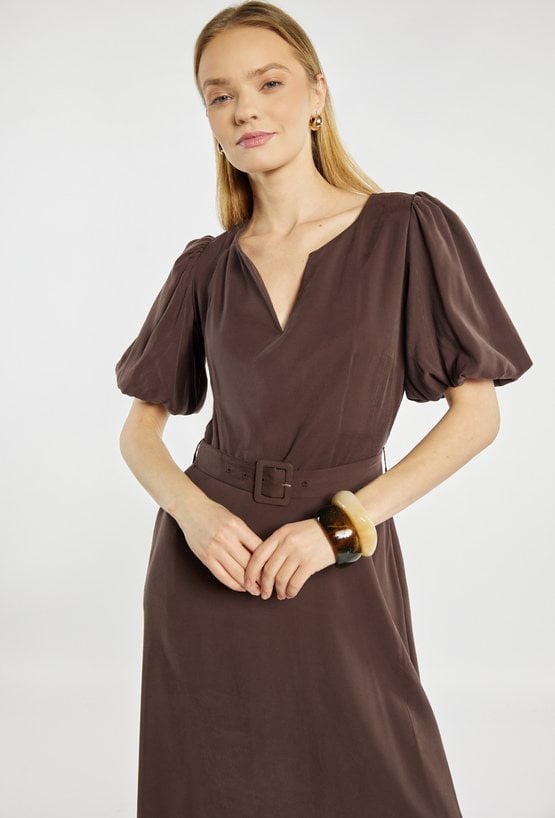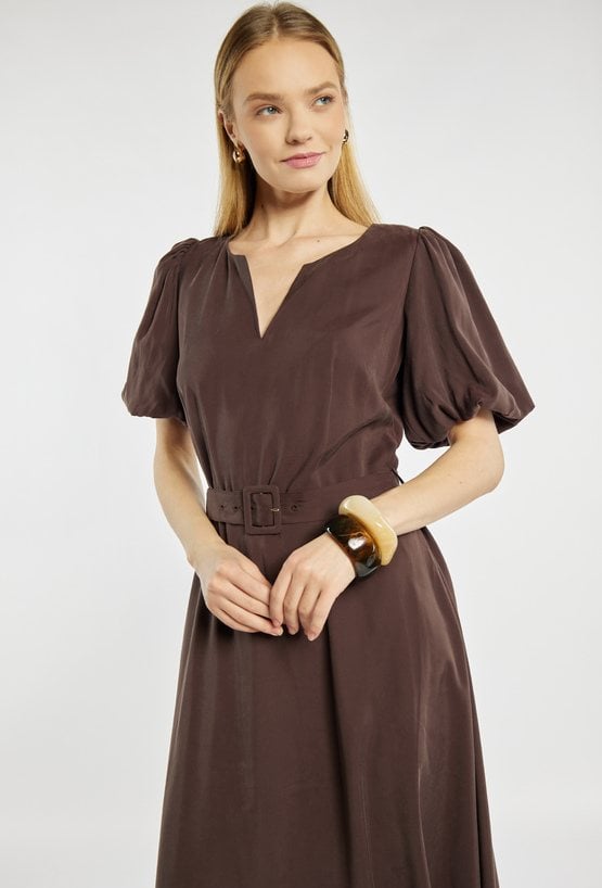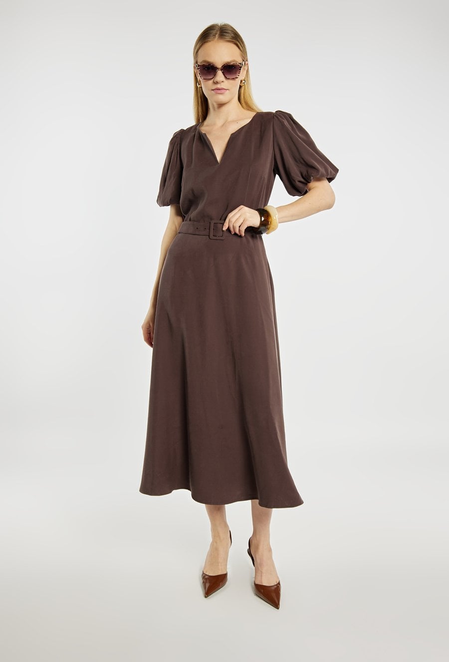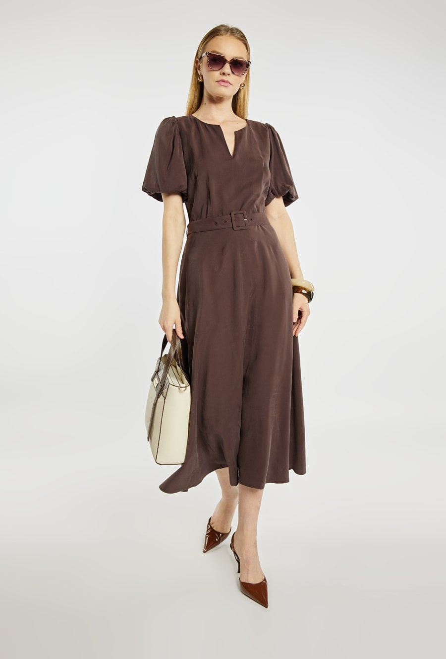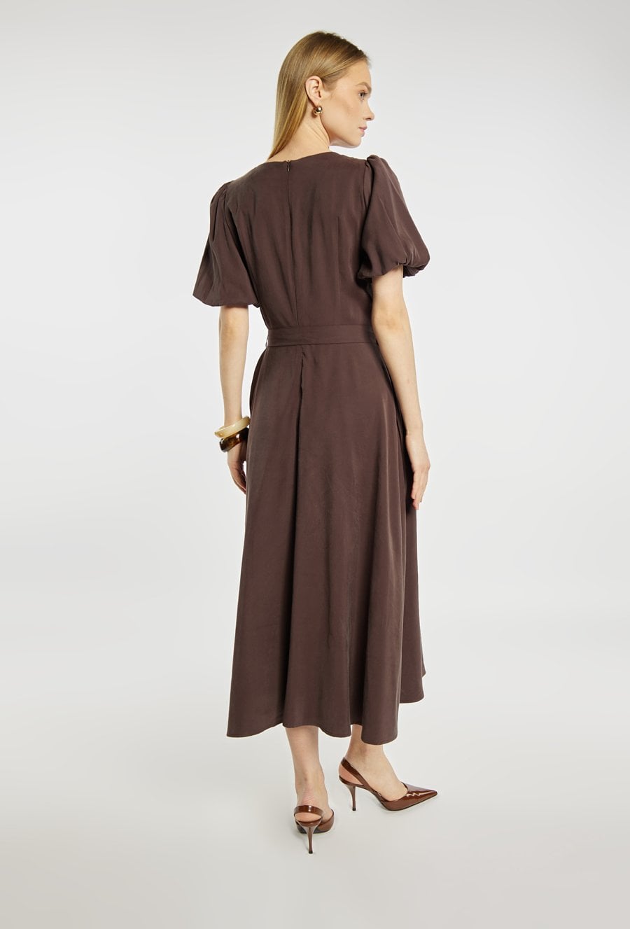 Sukienka midi o eleganckim, kobiecym fasonie. Sukienka z dekoltem w serek, krótkimi rękawami o lekko bufiastej formie oraz paskiem w talii, który pięknie podkreśla sylwetkę. Długość za kolano nadaje całości klasy i ponadczasowego charakteru. Idealna propozycja na eleganckie wyjścia, spotkania oraz uroczystości. Modelka na zdjęciu ma 177 cm wzrostu i prezentuje rozmiar 36.