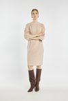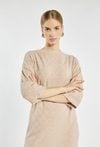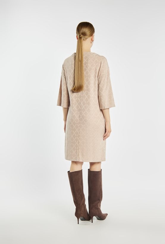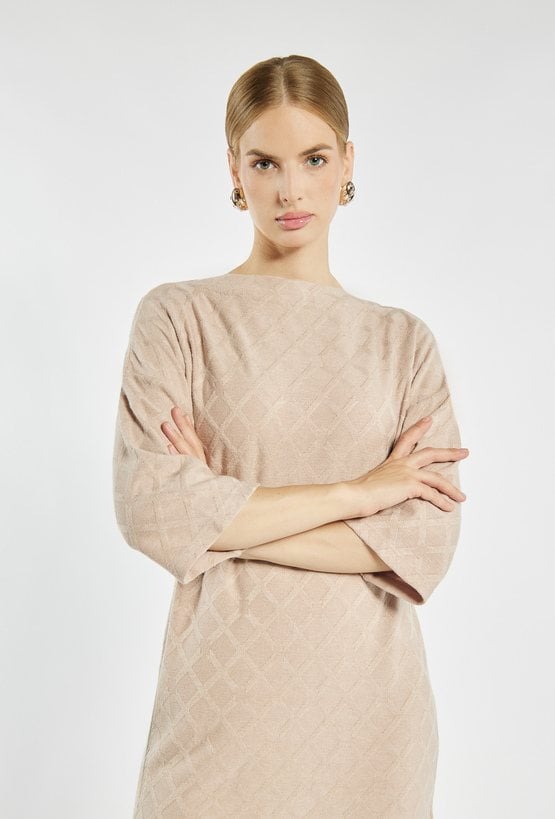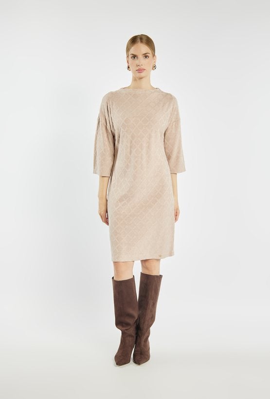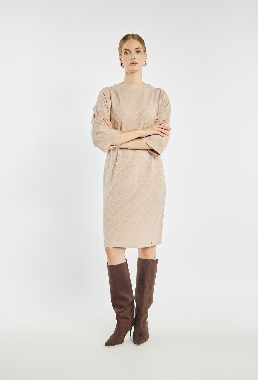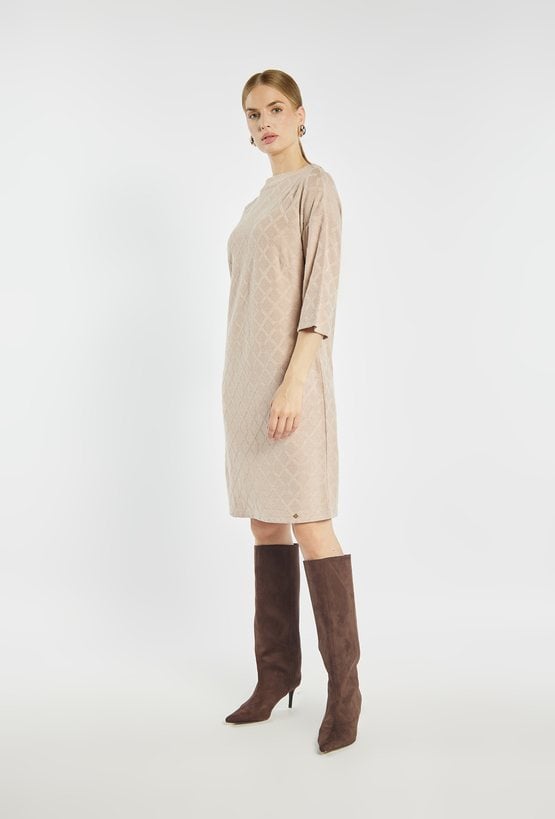 Sukienka o prostym, klasycznym kroju z długością do kolan. Model z lekko podniesionym dekoltem i rękawem 3/4. Wykonana z dzianiny o subtelnym, geometrycznym wzorze. Minimalistyczna i elegancka, sprawdzi się zarówno na co dzień, jak i w bardziej formalnych stylizacjach. Modelka na zdjęciu ma 177 cm wzrostu i prezentuje rozmiar 36.