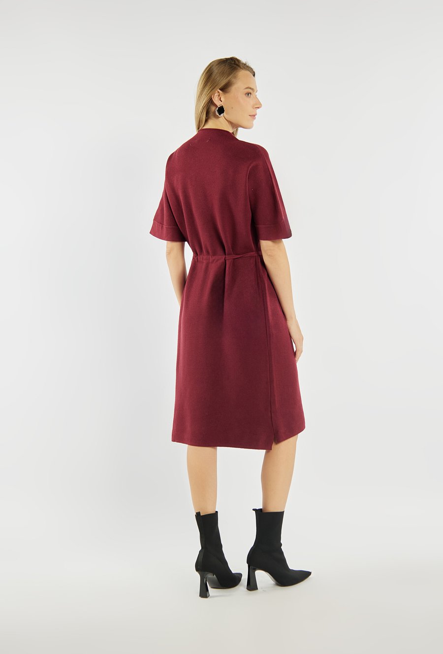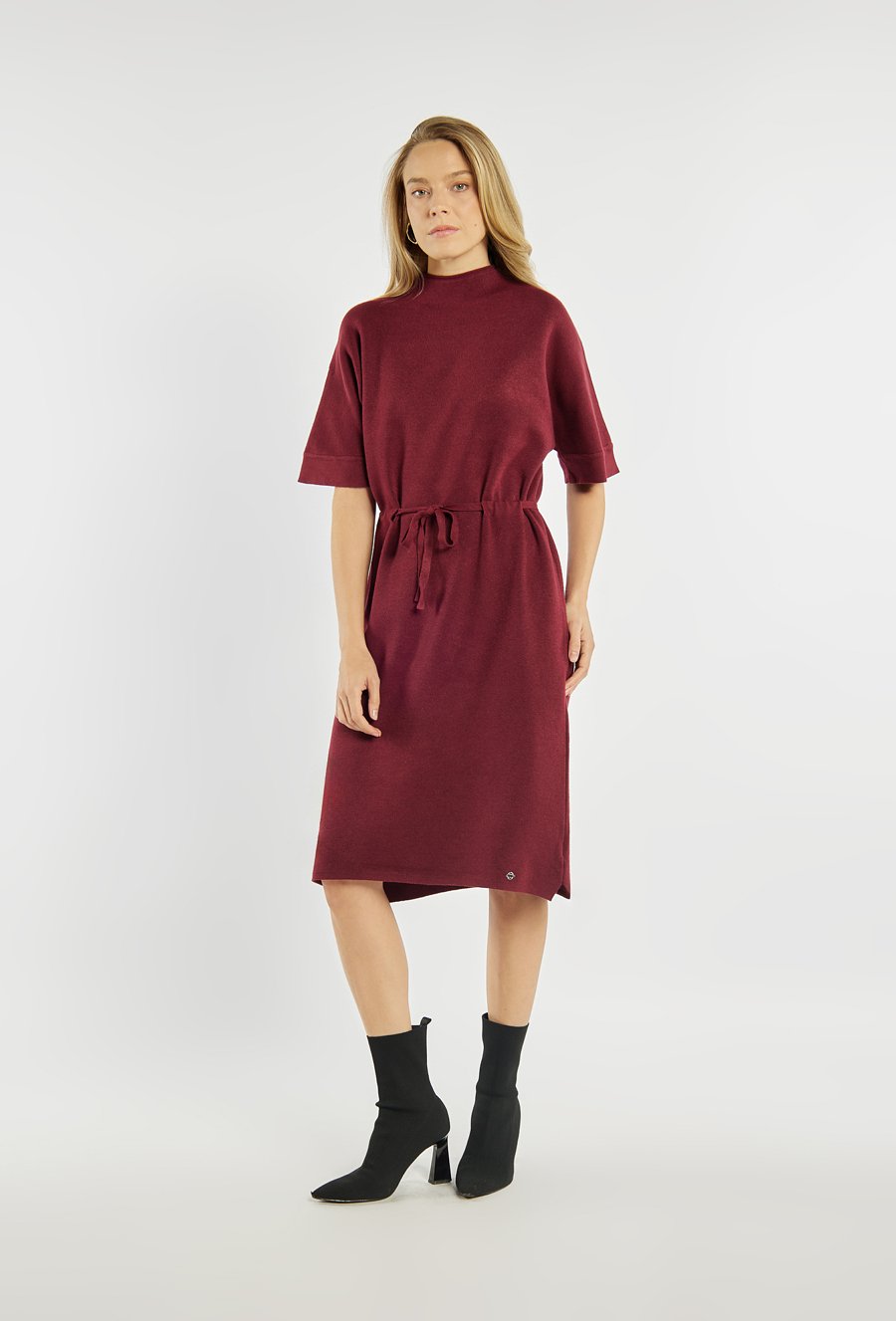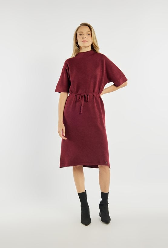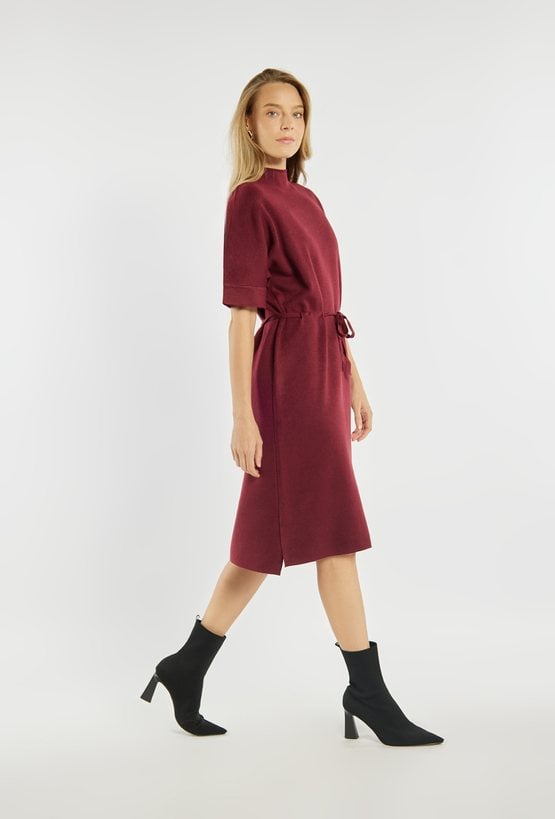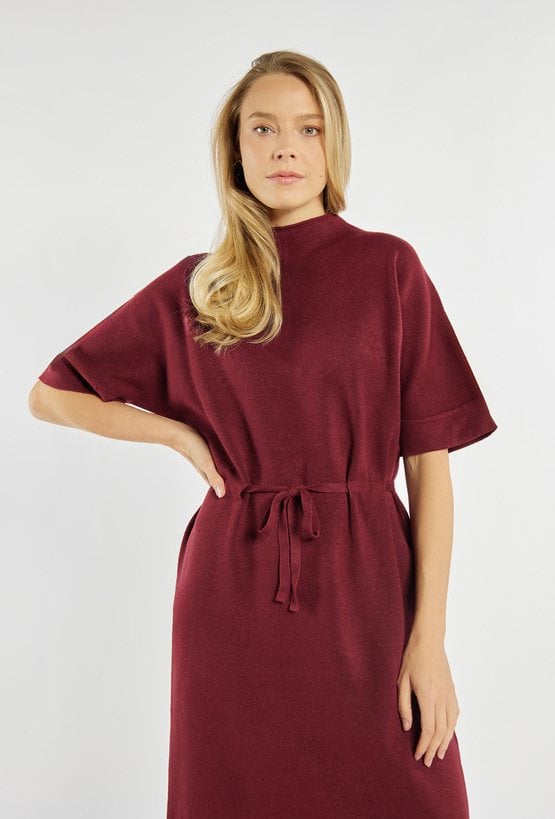 Dzianinowa sukienka o prostym kroju z delikatnie opuszczoną linią ramion i krótkimi rękawami. W talii wiązany pasek, który subtelnie podkreśla sylwetkę. Idealna na co dzień, do pracy lub na spotkania w eleganckim, a zarazem swobodnym stylu. Modelka na zdjęciu ma 177 cm wzrostu i prezentuje rozmiar S/M.
