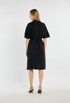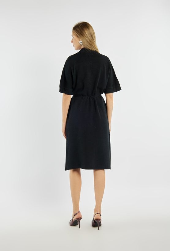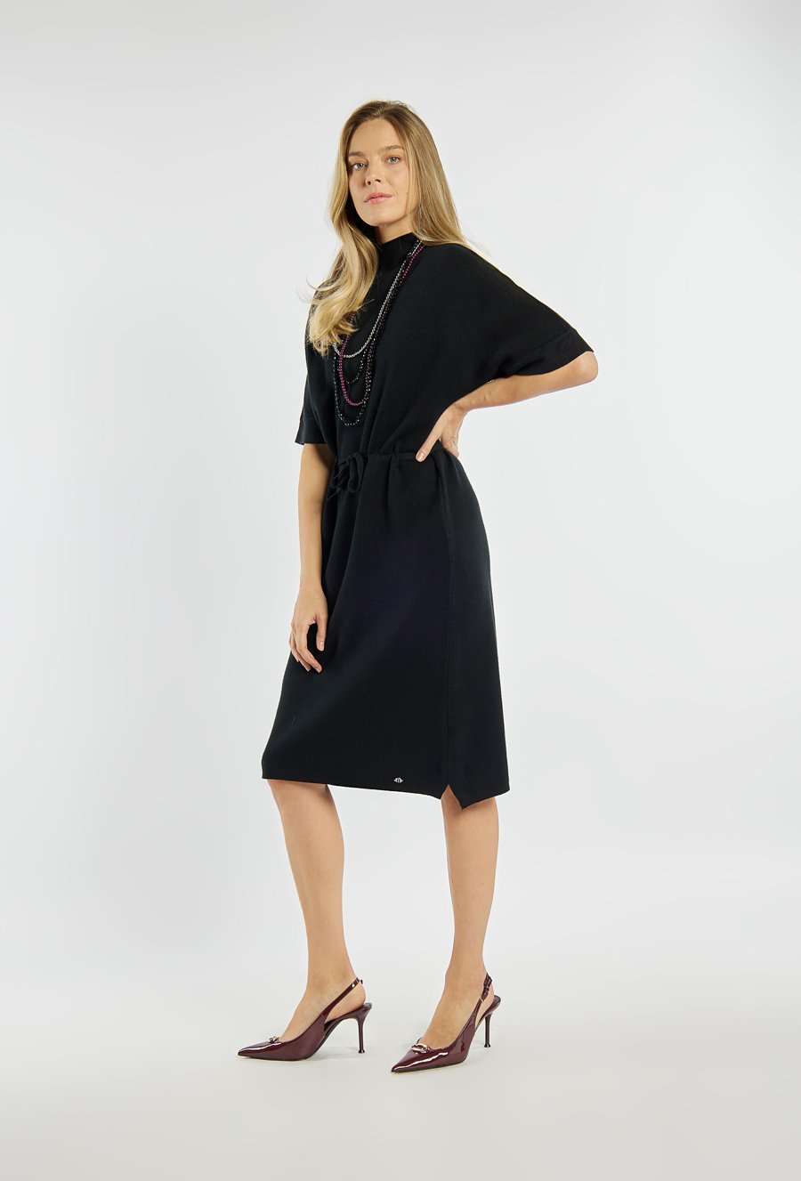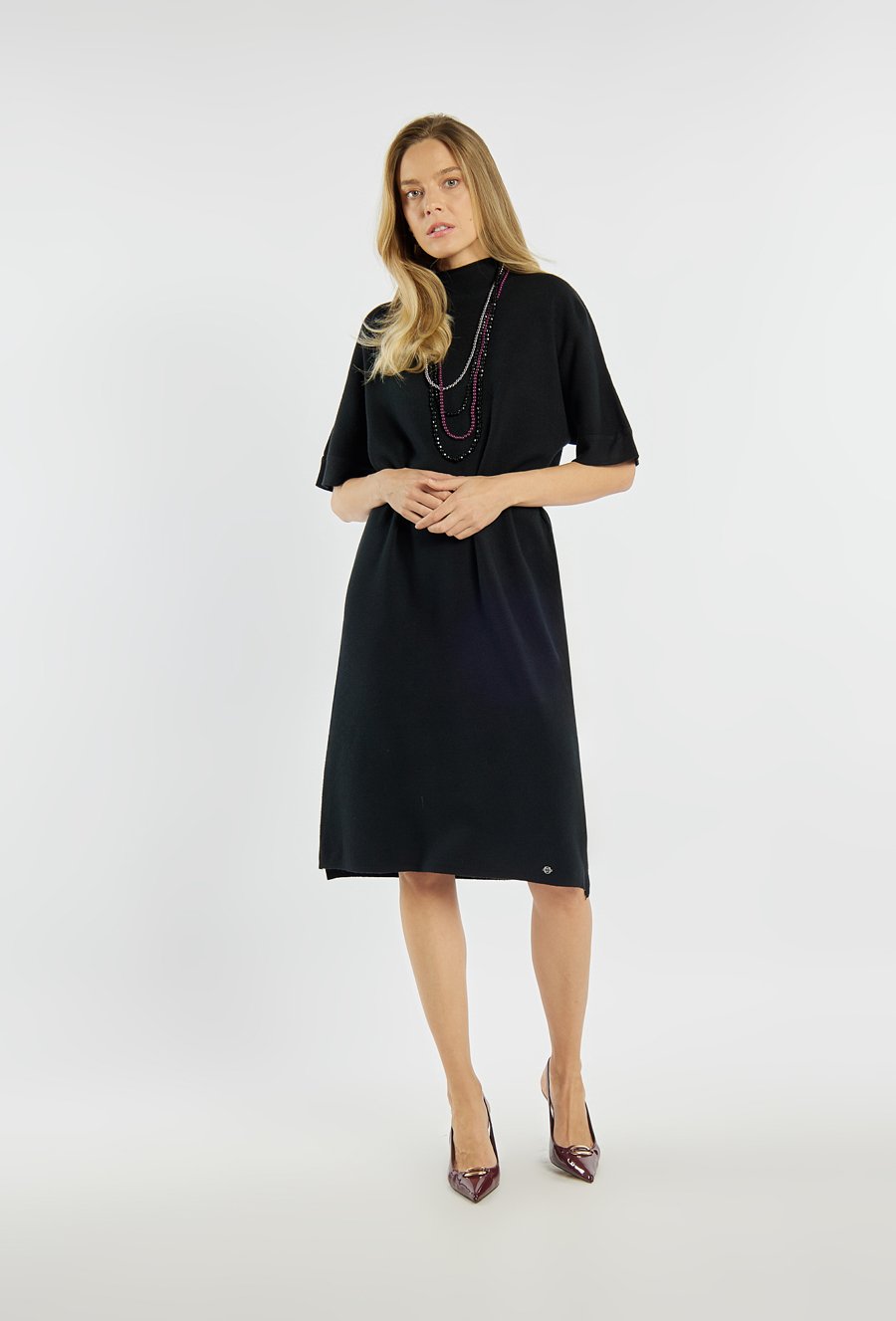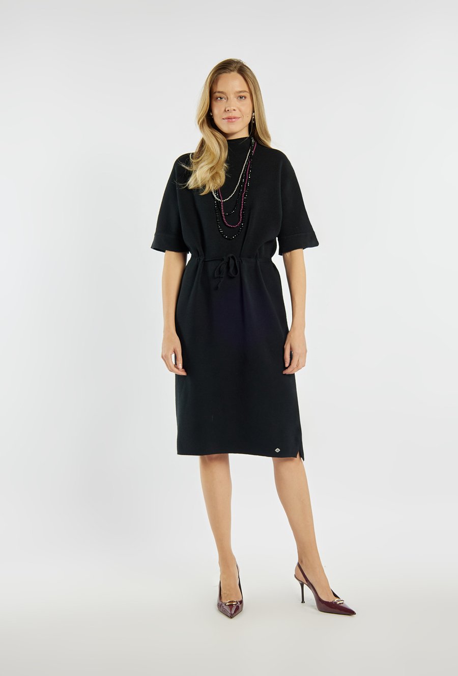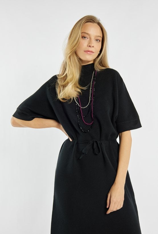 Dzianinowa sukienka o prostym kroju z delikatnie opuszczoną linią ramion i krótkimi rękawami. W talii wiązany pasek, który subtelnie podkreśla sylwetkę. Idealna na co dzień, do pracy lub na spotkania w eleganckim, a zarazem swobodnym stylu. Modelka na zdjęciu ma 177 cm wzrostu i prezentuje rozmiar S/M.