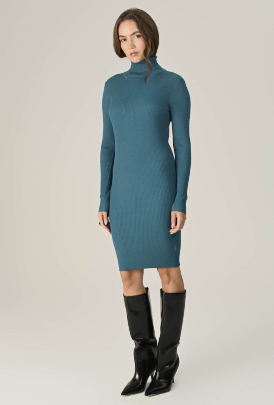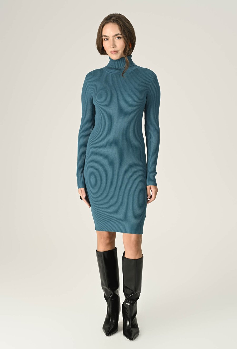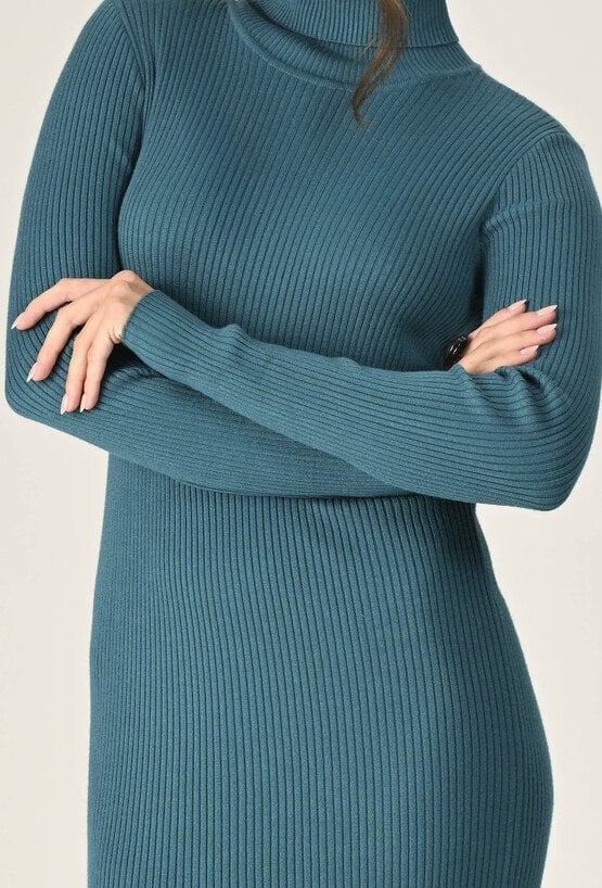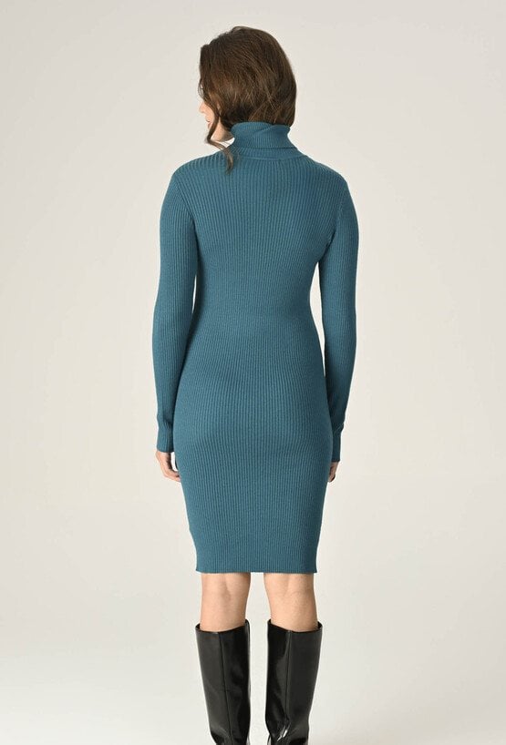 Stylowa i wygodna sukienka z miękkiej dzianiny z przewagą wiskozy. Lekki rib, długi rękaw i golf nadają jej elegancki, a zarazem swobodny charakter. Turkusowy kolor ożywi Twoje stylizacje i podkreśli urodę. Idealna na chłodniejsze dni – na co dzień i na wyjątkowe okazje. Modelka na zdjęciu ma 174 cm wzrostu i prezentuje rozmiar 36.