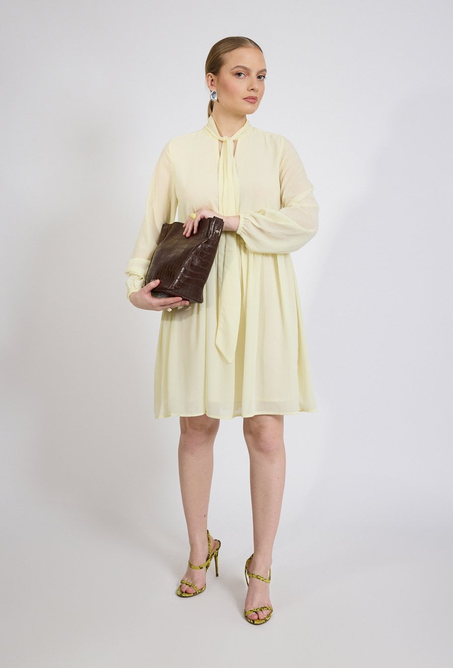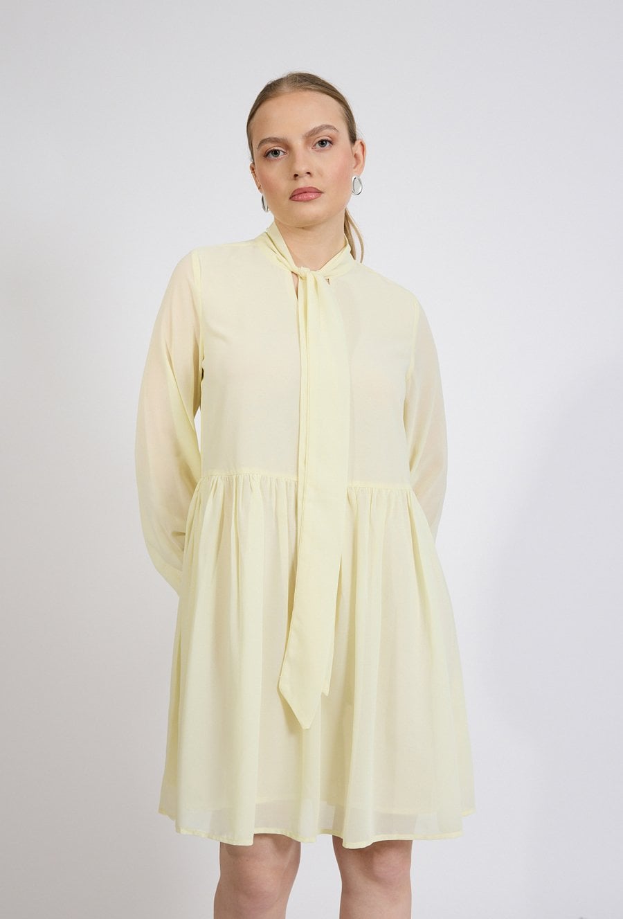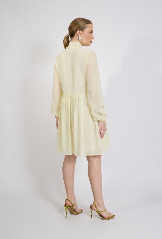 Sukienka damska o lekkim, rozkloszowanym kroju. Model o długości przed kolano z długim rękawem zakończonym elastycznym mankietem oraz stójką z dekoracyjnym wiązaniem przy dekolcie. Damska sukienka doskonale sprawdzi się w stylizacjach codziennych oraz na wyjątkowe okazje. Modelka na zdjęciu ma 177 cm wzrostu i prezentuje rozmiar 36.