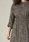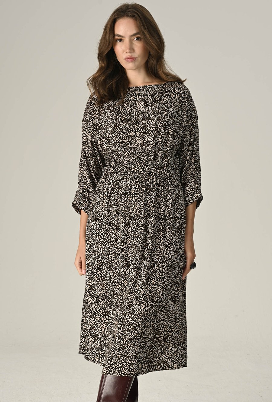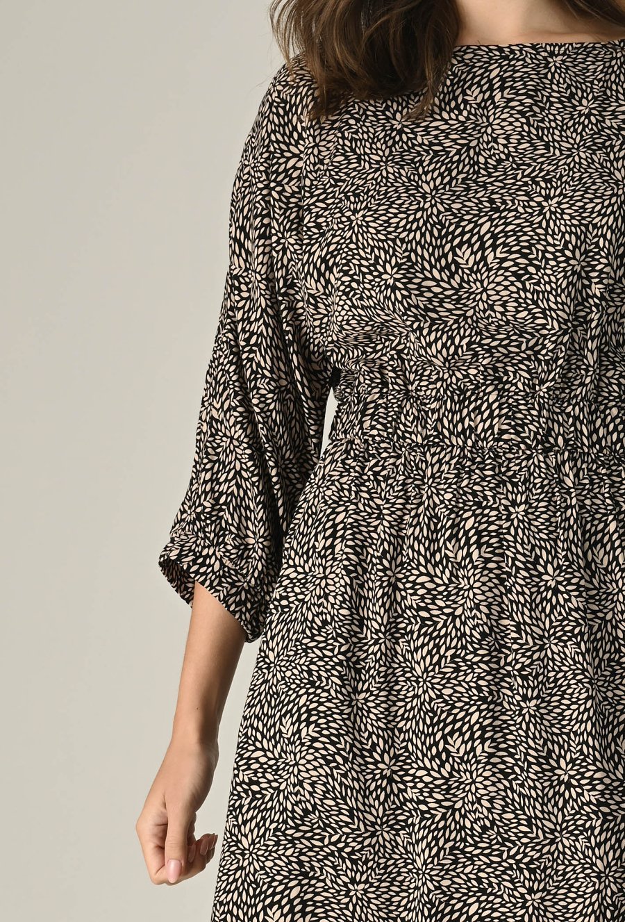Lekka i kobieca sukienka z przyjemnej wiskozy to idealna propozycja na cieplejsze dni. Półokrągły dekolt i rękawy zakończone gumką dodają jej subtelnego uroku, a elastyczna talia pięknie podkreśla sylwetkę i zapewnia wygodę noszenia. Prosty, a zarazem efektowny fason sprawdzi się zarówno na co dzień, jak i przy wyjątkowych okazjach. Modelka na zdjęciu ma 176 cm wzrostu i prezentuje rozmiar S