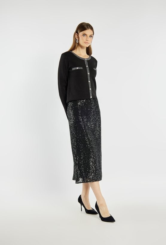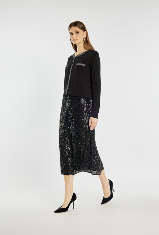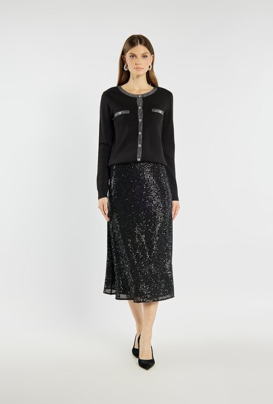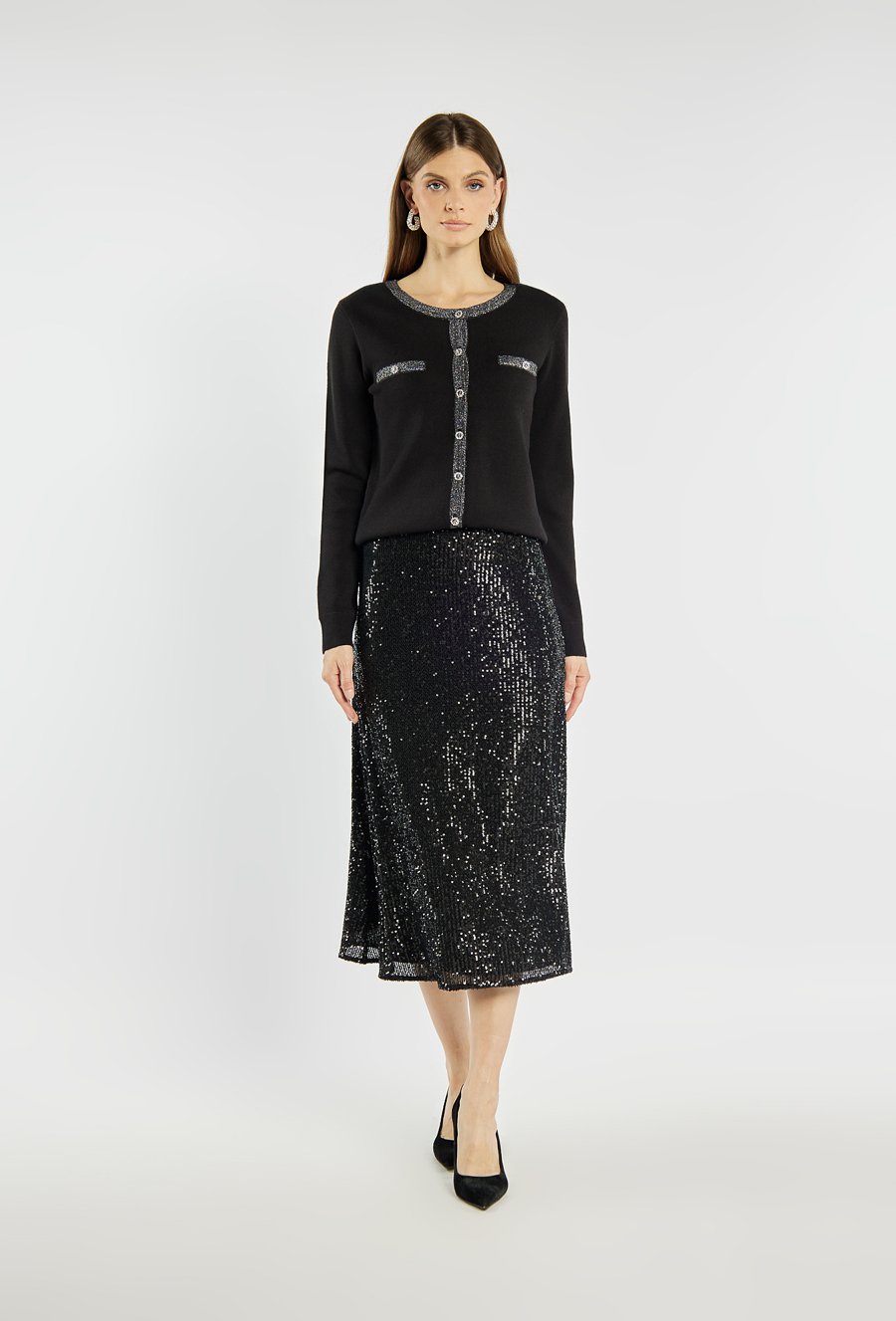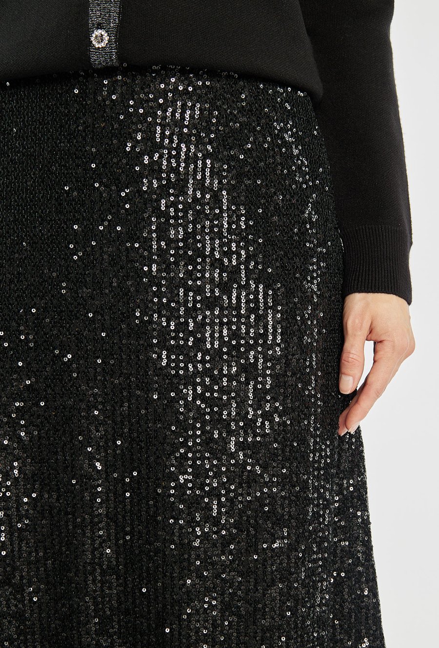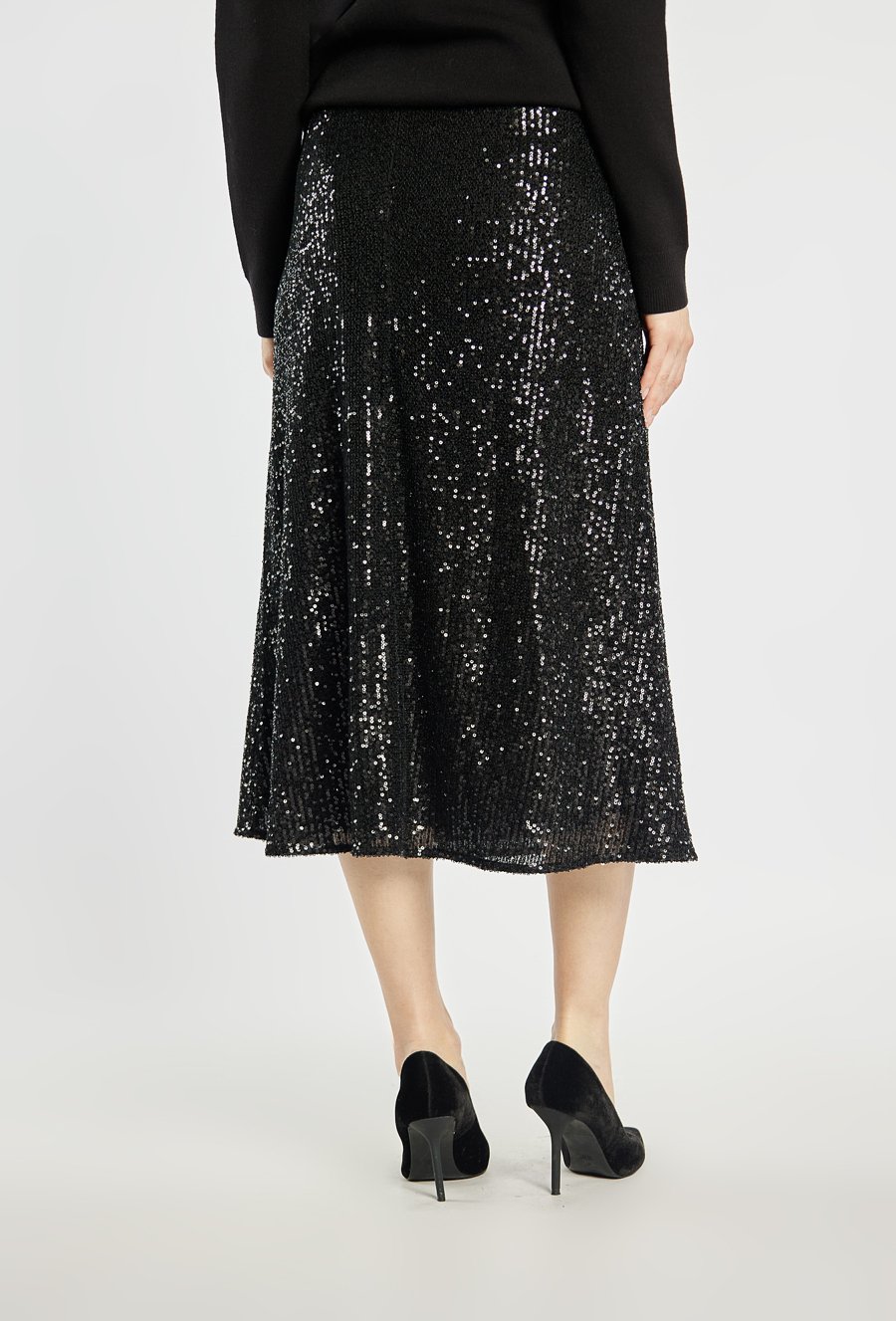 Połyskująca spódnica midi z delikatnych cekinów, zapinana z tyłu na kryty suwak. Jej elegancki krój subtelnie podkreśla sylwetkę, a błyszczące wykończenie dodaje szyku i wyjątkowego charakteru. Idealna na świąteczne przyjęcia, sylwestra czy inne wyjątkowe okazje. Modelka na zdjęciu ma 177 cm wzrostu i prezentuje rozmiar 36.