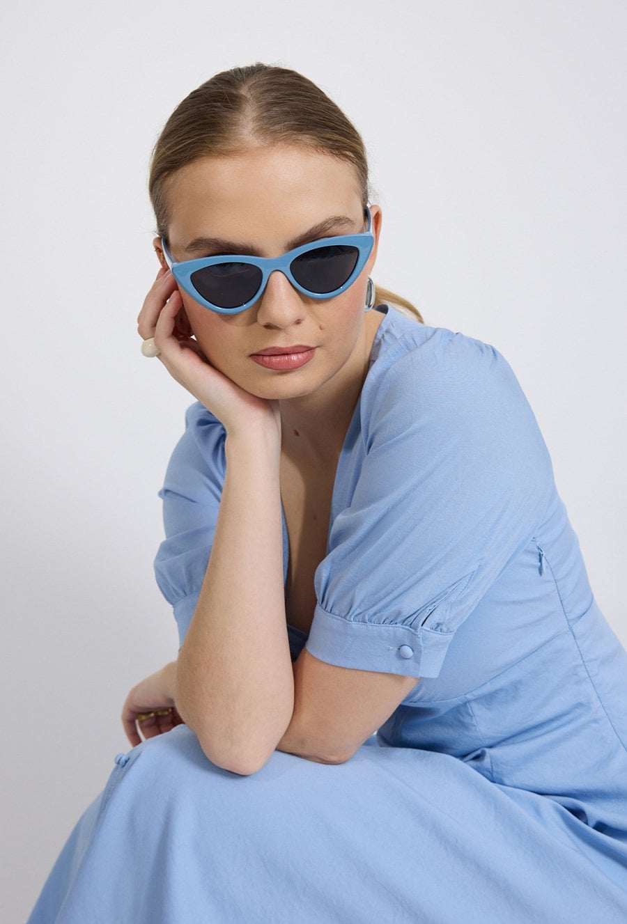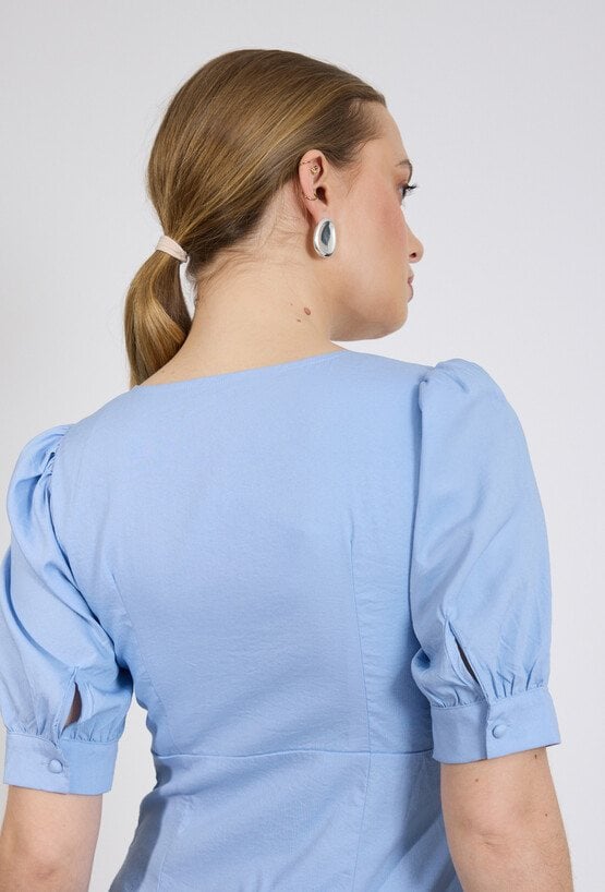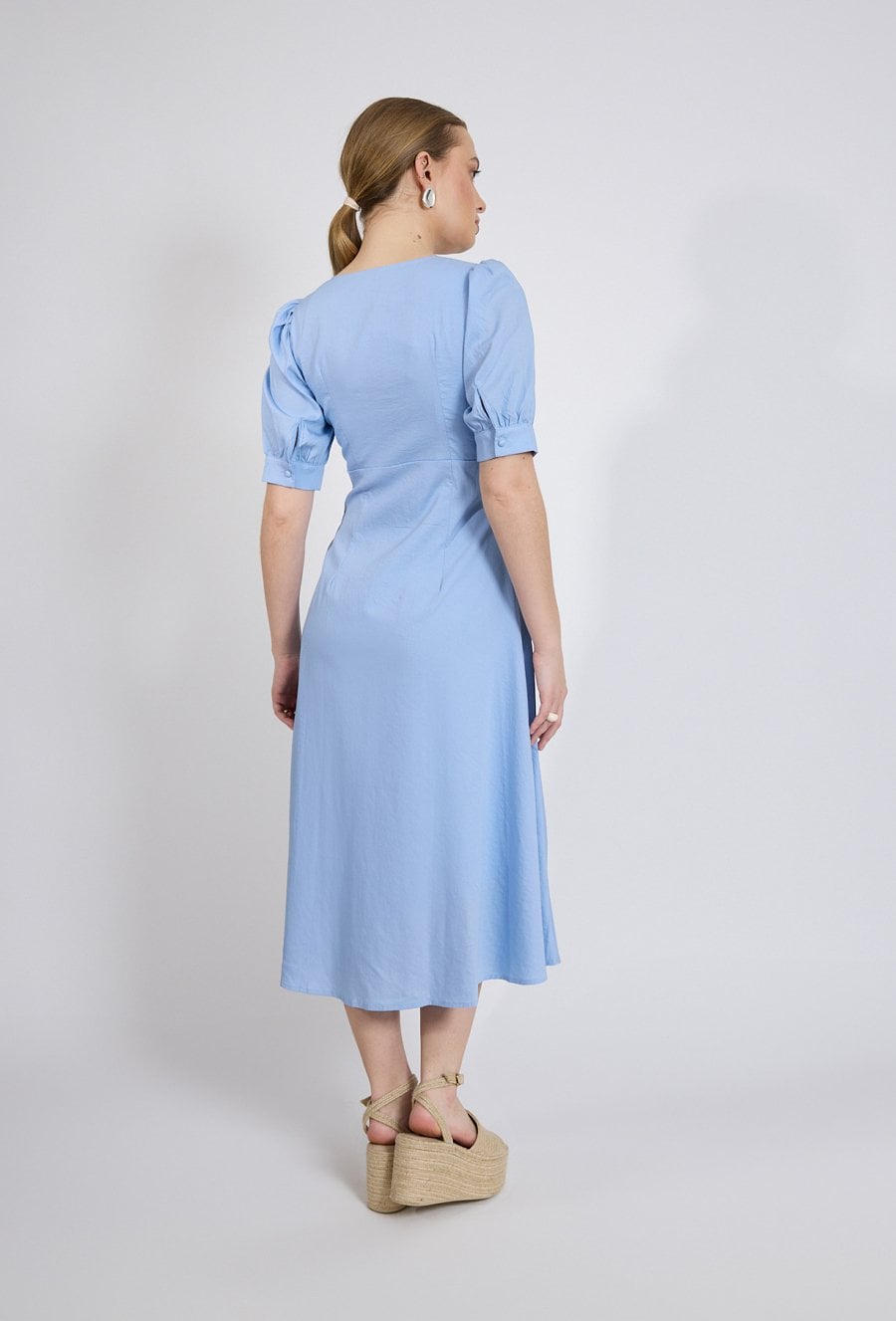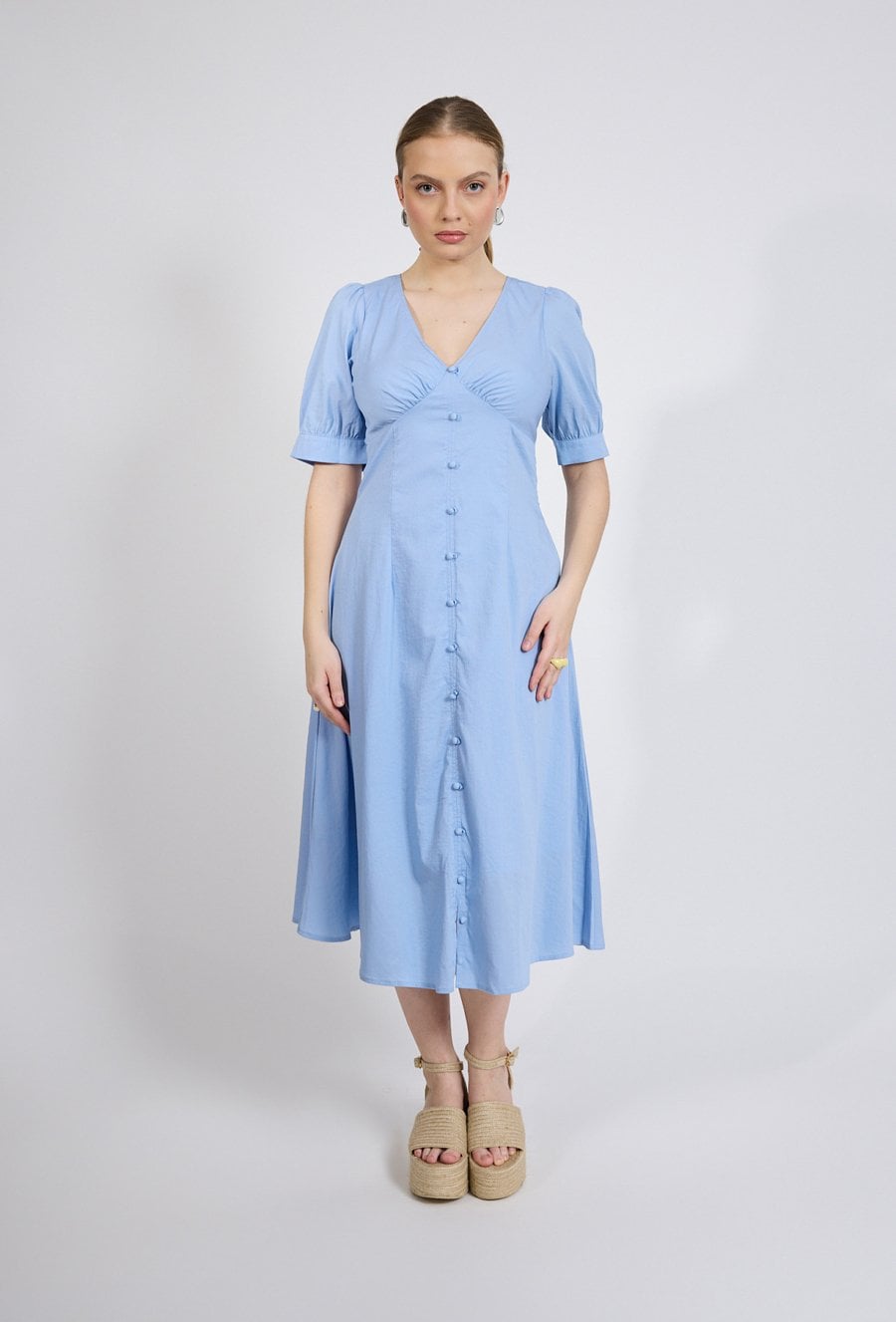 Sukienka damska o kobiecym, dopasowanym kroju z lekko rozkloszowanym dołem. Model o długości midi z krótkim rękawem oraz dekoltem w kształcie litery V, który subtelnie podkreśla linię szyi. Przód ozdobiony jest rzędem dekoracyjnych guzików. Modelka na zdjęciu ma 177 cm wzrostu i prezentuje rozmiar 36.