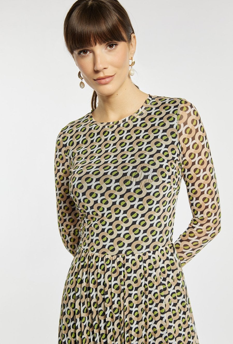 Sukienka damska wykonana z lekkiego tiulu. Sukienka ma długie, półtransparentne rękawy, półokrągły dekolt oraz plisowany dół. Model ten doskonale sprawdzi się zarówno na co dzień, jak i podczas formalnych spotkań. Modelka na zdjęciu ma 177 cm wzrostu i prezentuje rozmiar S.