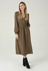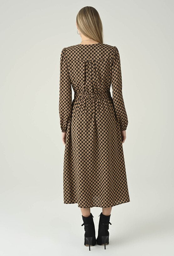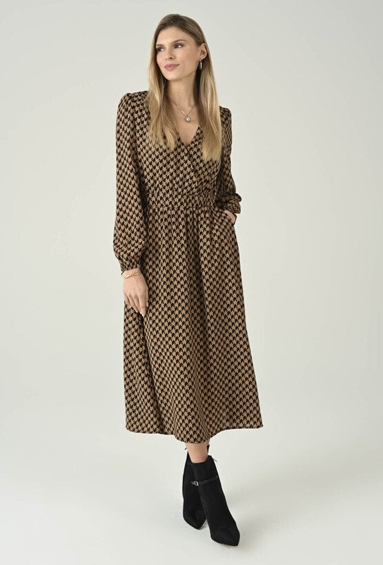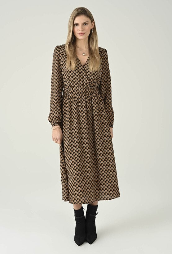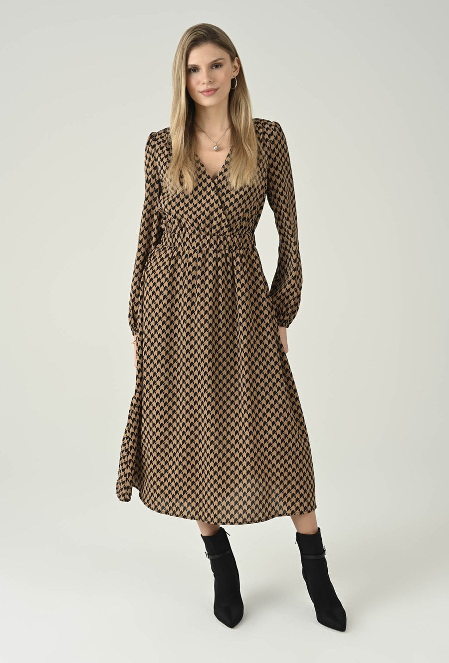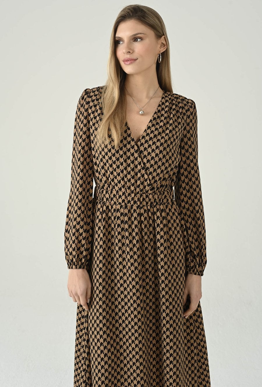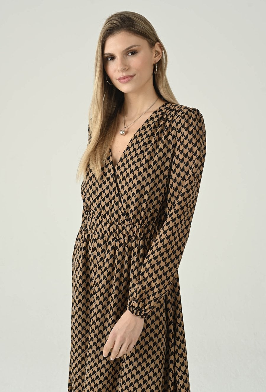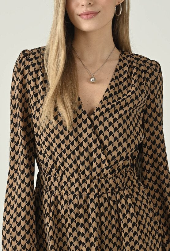 Kobieca sukienka za kolano w brązowo-czarny drobny wzór, która łączy elegancję z wygodą noszenia. Kopertowy dekolt w kształcie litery V subtelnie podkreśla szyję i dodaje lekkości, a zaznaczona talia pięknie modeluje sylwetkę. Zwiewny dół miękko układa się w ruchu, tworząc stylowy, dopracowany efekt, a długie rękawy dodają całości szyku i sprawiają, że model świetnie sprawdzi się również w chłodniejsze dni. To idealna propozycja do pracy, na spotkania i wyjątkowe wyjścia — wystarczy dobrać botki, czółenka lub szpilki, by uzyskać elegancki look.