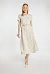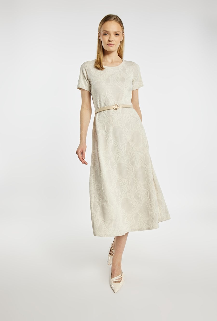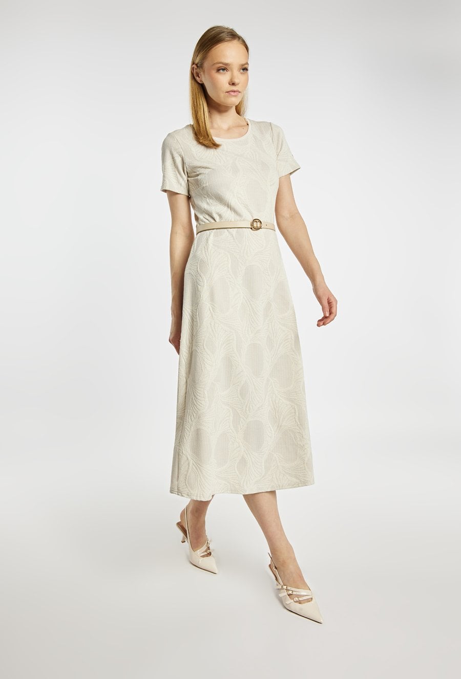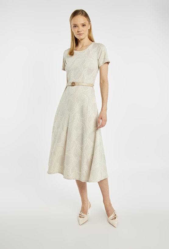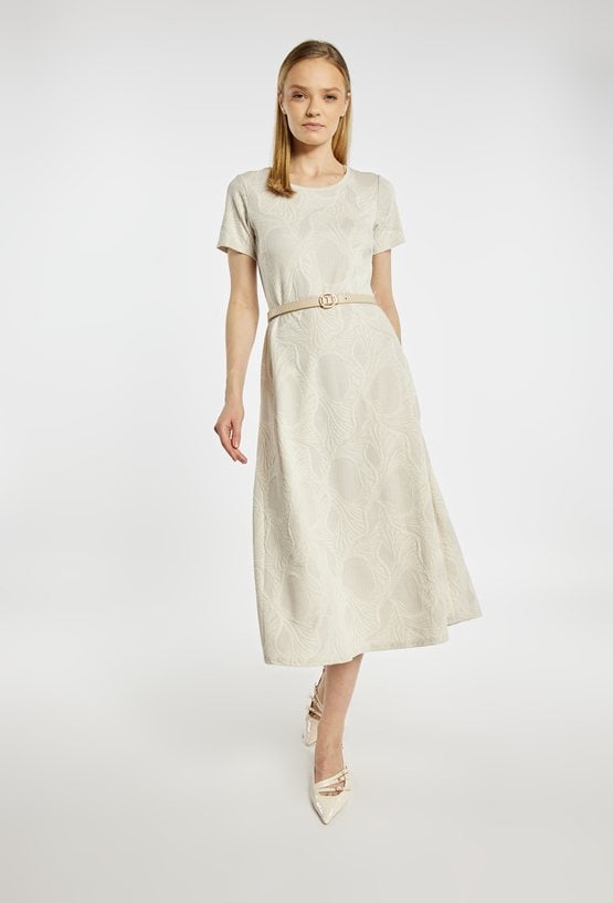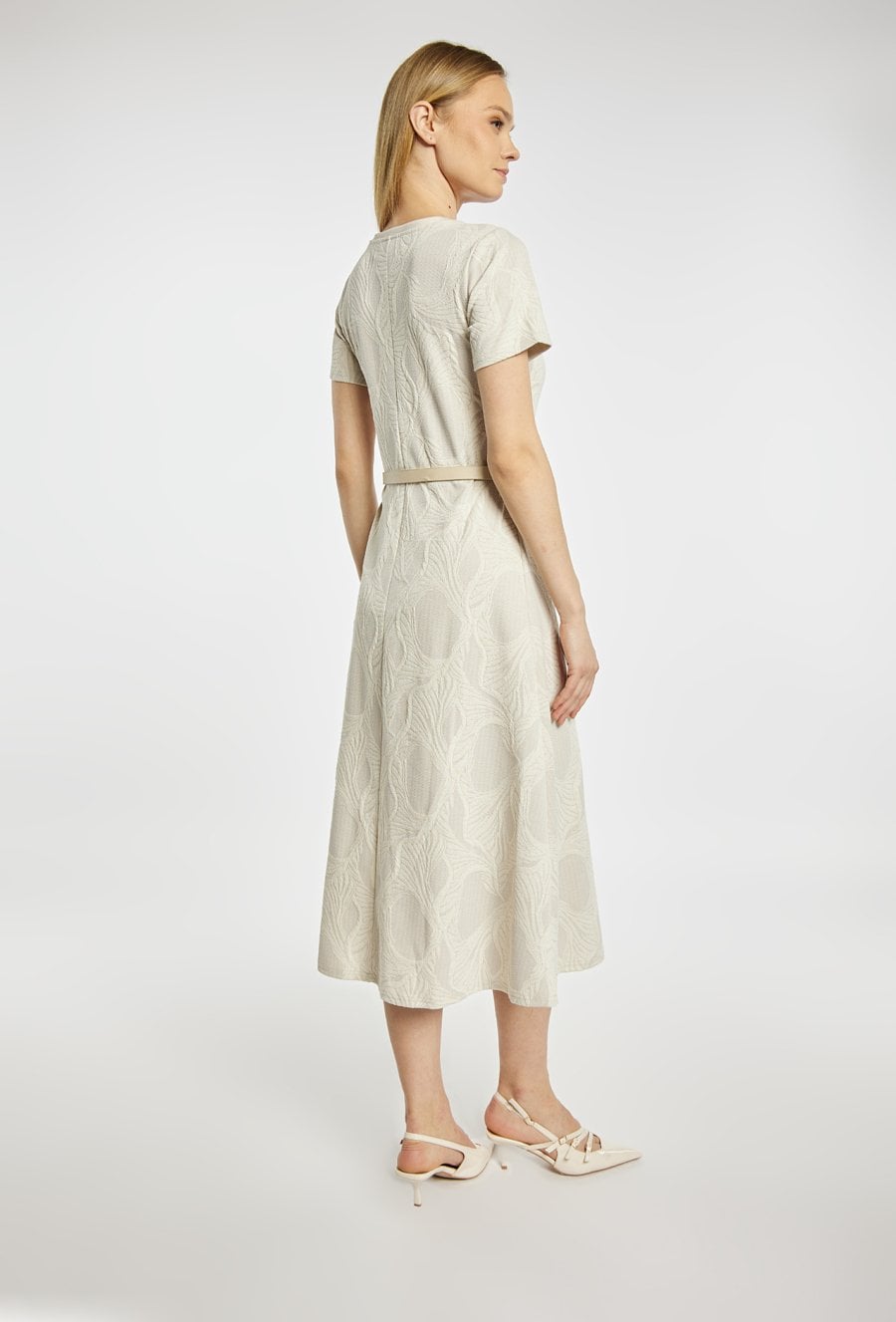 Sukienka midi o eleganckim, rozkloszowanym fasonie. Model z okrągłym dekoltem oraz krótkimi rękawami, subtelnie podkreślający sylwetkę dzięki dołączonemu paskowi w talii. Idealna propozycja na eleganckie wyjścia, uroczystości oraz letnie spotkania. Modelka na zdjęciu ma 177 cm wzrostu i prezentuje rozmiar S.
