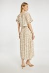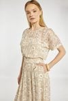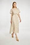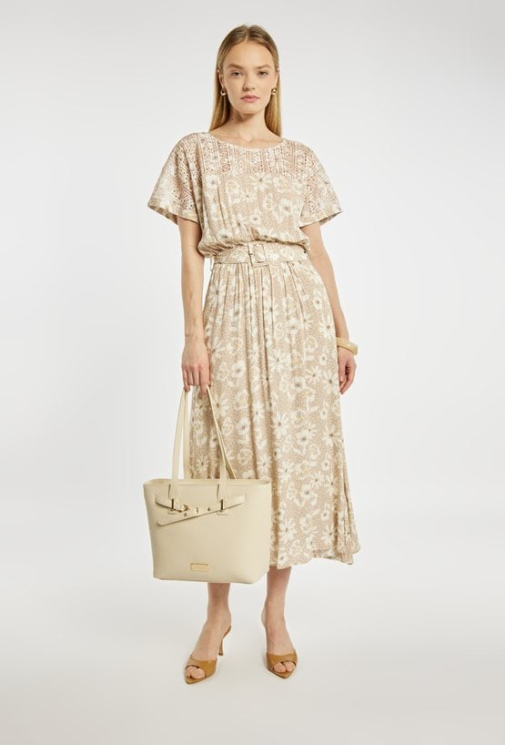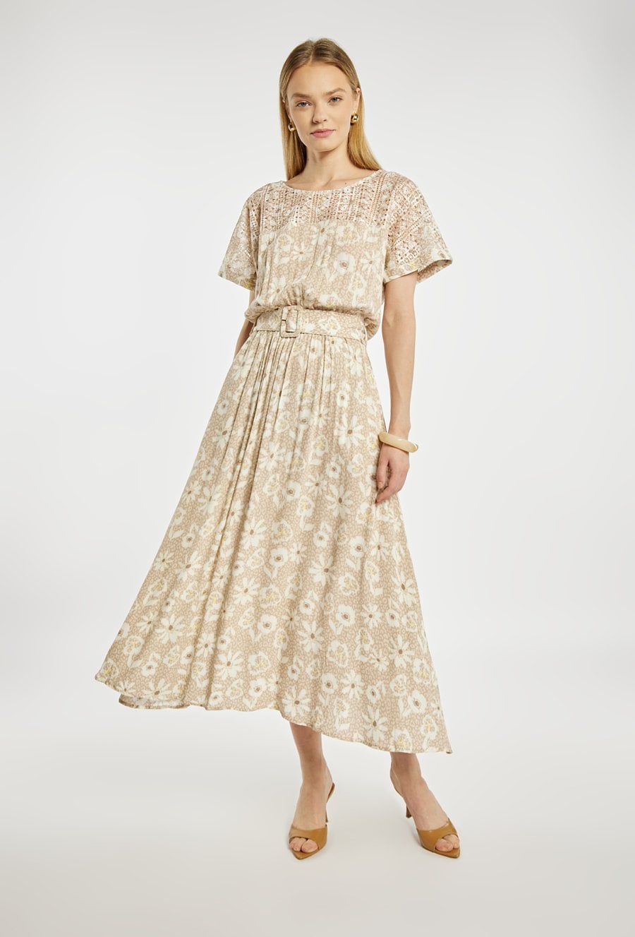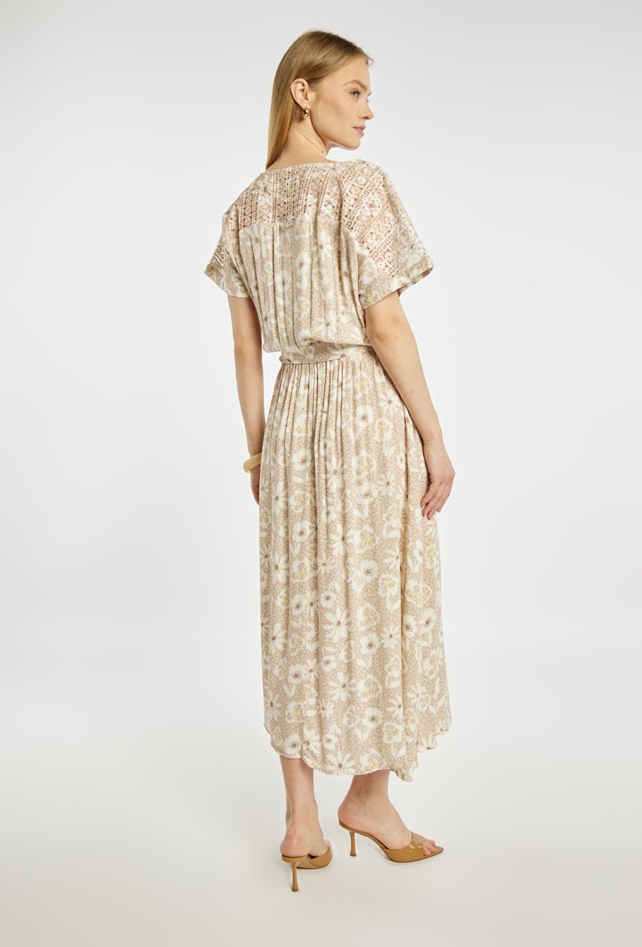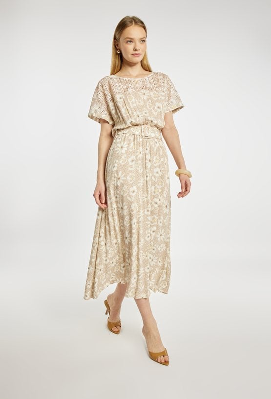 Sukienka midi o lekkim, zwiewnym fasonie. Model z okrągłym dekoltem, krótkimi rękawami oraz paskiem w talii, który podkreśla sylwetkę. Sukienka delikatnego materiału w subtelny, kwiatowy wzór. Idealna propozycja na co dzień, letnie spotkania oraz półeleganckie okazje. Modelka na zdjęciu ma 177 cm wzrostu i prezentuje rozmiar 36.