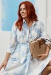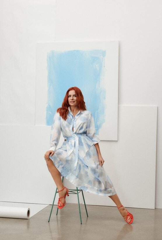 Sukienka damska o eleganckim, rozkloszowanym kroju midi z krótkim rękawem. Model zapinany na guziki, z klasycznym kołnierzykiem, który nadaje całości szykownego charakteru. W talii znajduje się pasek z klamrą, podkreślający sylwetkę i zapewniający idealne dopasowanie.