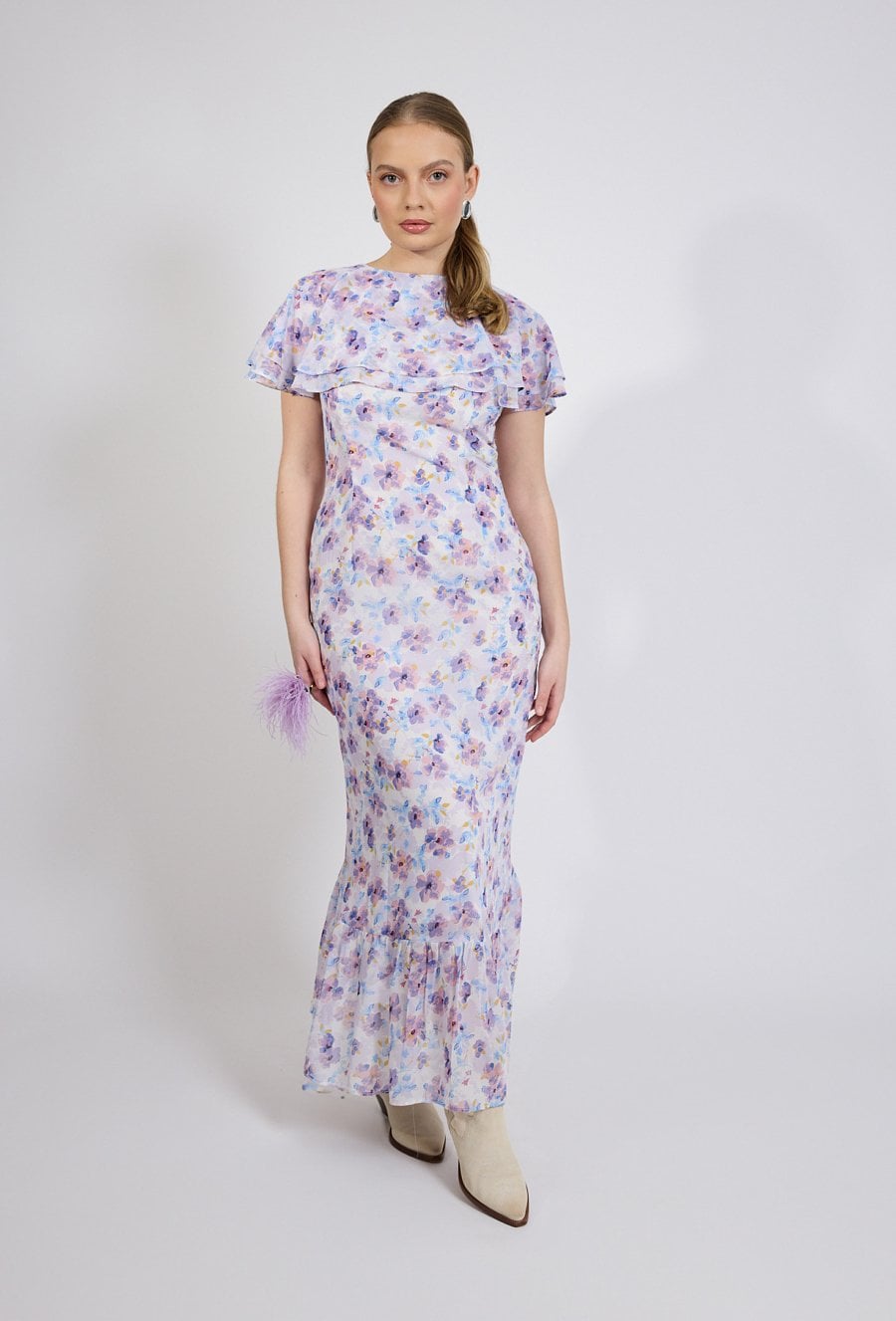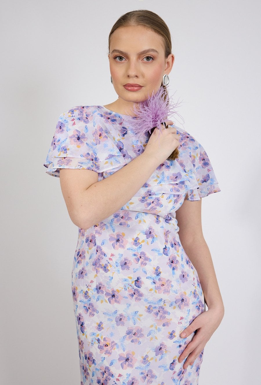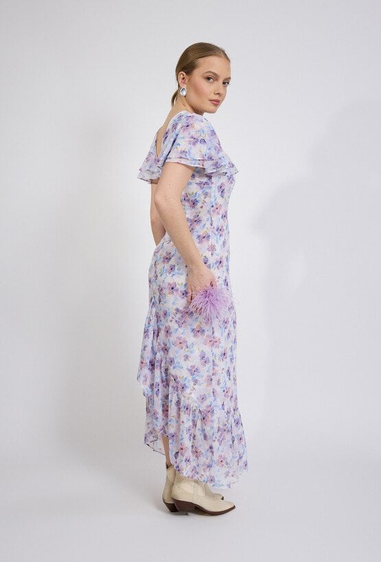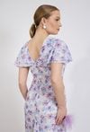 Sukienka damska o dopasowanym, kobiecym kroju. Model o długości maxi z krótkim, falbaniastym rękawem oraz klasycznym, półokrągłym dekoltem. Talię podkreśla dopasowany fason, który pięknie modeluje sylwetkę. Sukienka damska doskonale sprawdzi się w stylizacjach na wyjątkowe okazje oraz w bardziej wyrazistych zestawach na co dzień. Modelka na zdjęciu ma 177 cm wzrostu i prezentuje rozmiar 36.