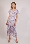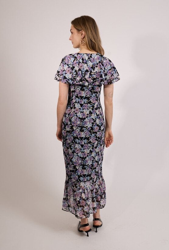 Sukienka damska o dopasowanym, kobiecym kroju. Model o długości maxi z krótkim, falbaniastym rękawem oraz klasycznym dekoltem w serek. Talię podkreśla dopasowany fason, który pięknie modeluje sylwetkę. Sukienka damska doskonale sprawdzi się w stylizacjach na wyjątkowe okazje oraz w bardziej wyrazistych zestawach na co dzień. Modelka na zdjęciu ma 177 cm wzrostu i prezentuje rozmiar 36.