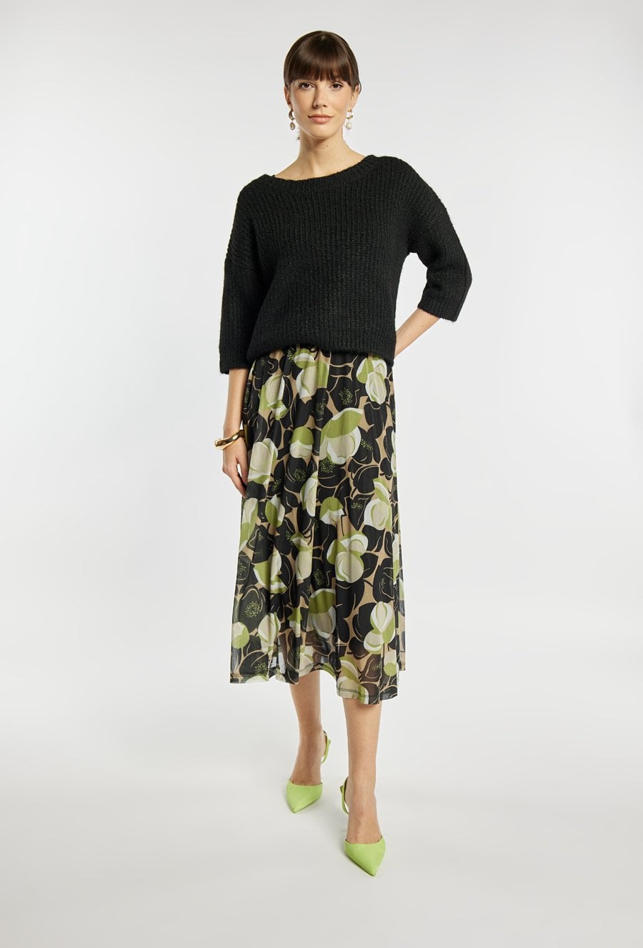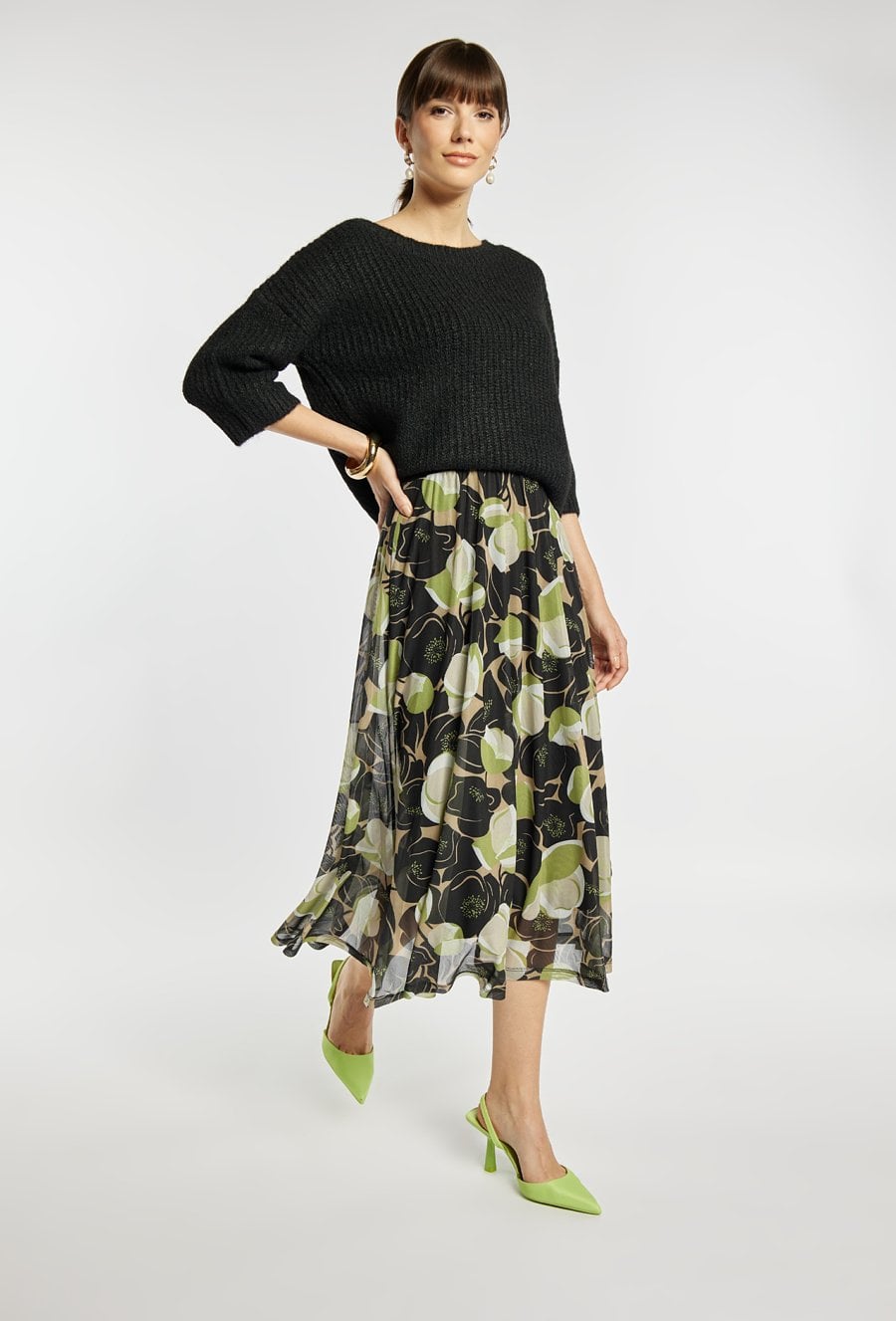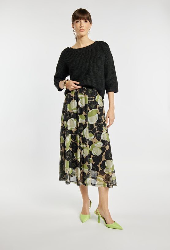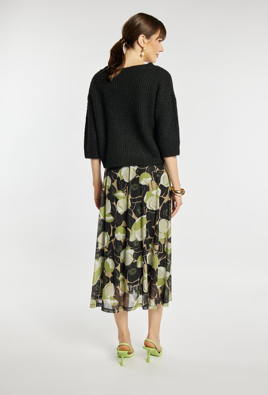 Sukienka o długości midi z lekką, zwiewną warstwą tiulu tworzy subtelny, delikatnie rozkloszowany efekt przy każdym ruchu. Prosta, wygodna góra na ramiączkach ładnie układa się na sylwetce i dodaje całości lekkości. Sukienka ma dołączony sweter o miękkim, wyrazistym splocie, który tworzy gotowy, spójny zestaw. Sweter można nosić osobno lub razem z sukienką, dzięki czemu stylizacja jest uniwersalna. Modelka na zdjęciu ma 177 cm wzrostu i prezentuje rozmiar S.