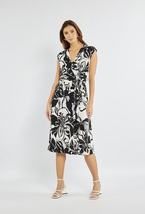 Letnia sukienka midi z dodatkiem lnu, idealna na ciepłe dni. Sukienka o kopertowym fasonie pięknie podkreśla sylwetkę, a wiązanie w talii pozwala na idealne dopasowanie. Modelka na zdjęciu ma 177 cm wzrostu i prezentuje rozmiar 36