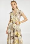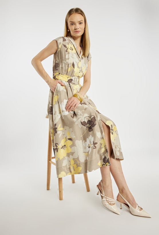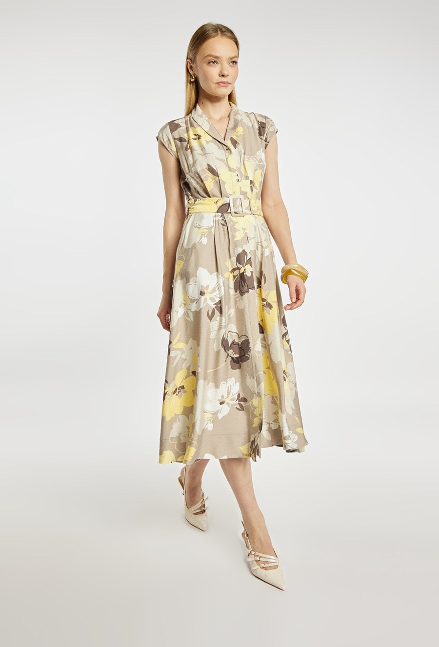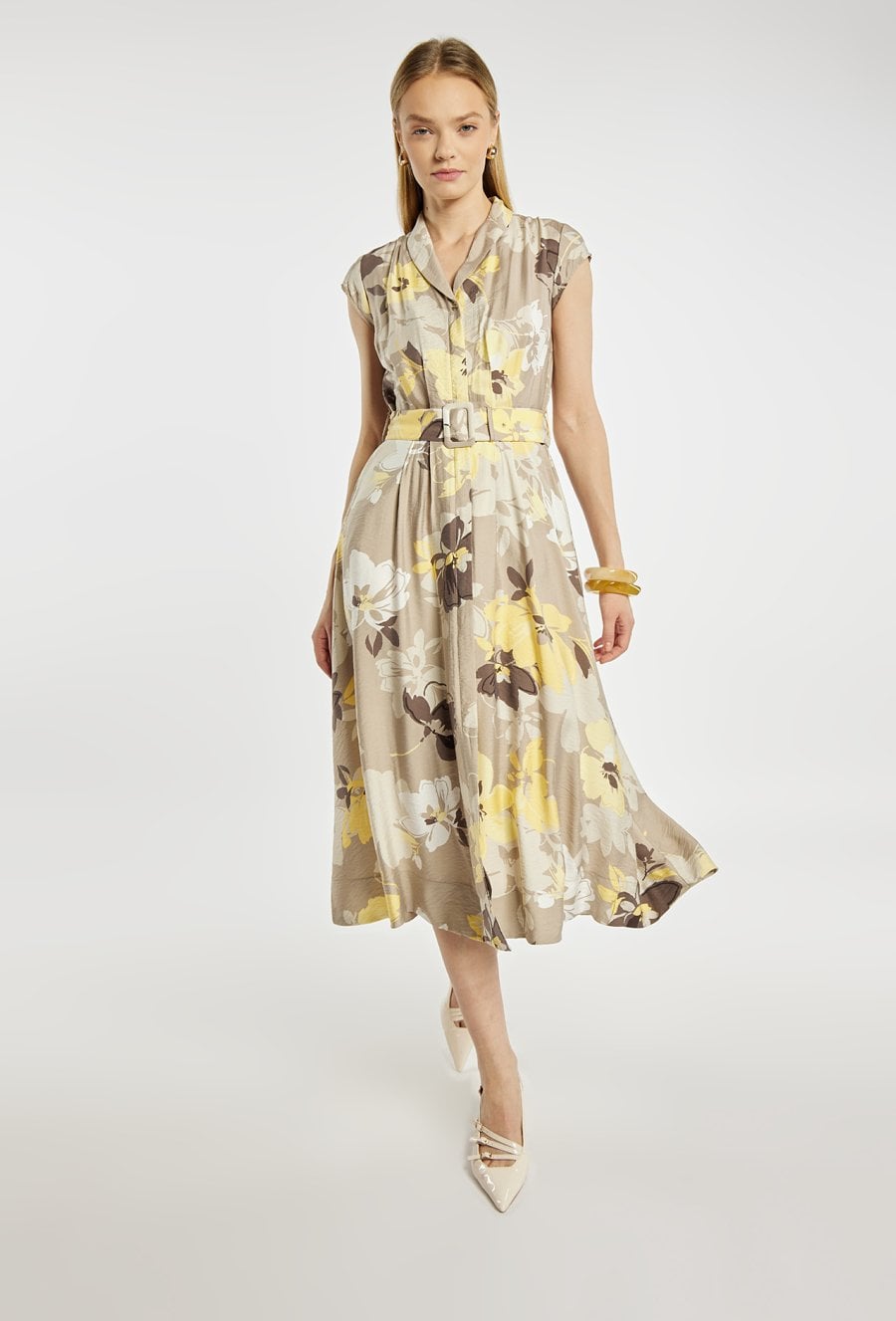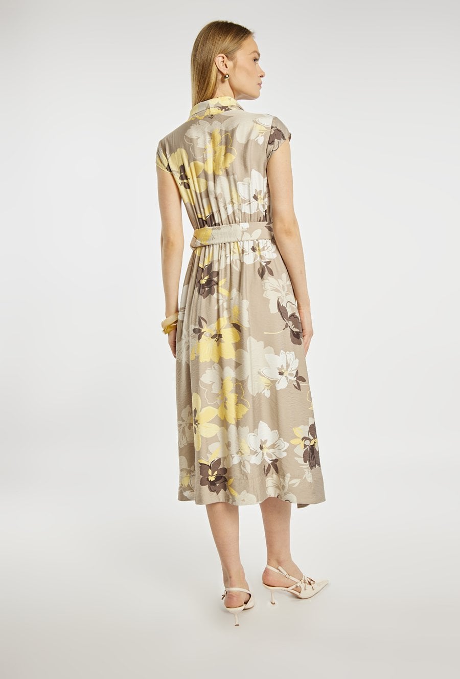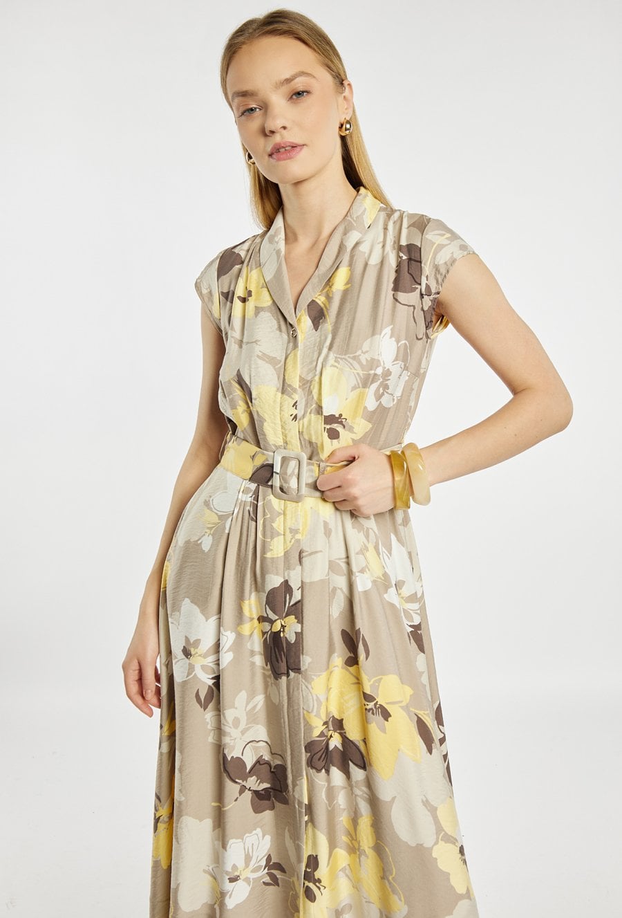Sukienka o kobiecym, wiosennym charakterze, wykonana z lekkiego materiału. Sukienka zapinana na guziki na całej długości, z delikatnym kołnierzem i krótkim rękawem. Sukienka ma długość midi oraz pasek w talii, które pozwala ładnie podkreślić sylwetkę. Model ten sprawdzi się na co dzień, do pracy, jak i na wiosenne spotkania. Modelka na zdjęciu ma 177cm wzrostu i prezentuje rozmiar 36.