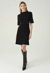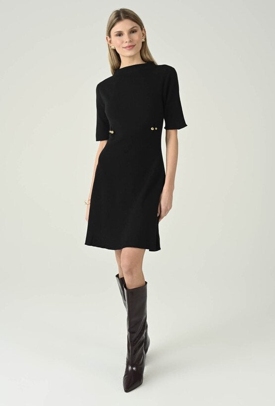 Elegancka krótka dzianinowa sukienka z dodatkiem wiskozy, która łączy wygodę z kobiecym stylem. Lekka stójka i rękawy do łokcia nadają całości subtelnej lekkości, a ozdobne detale na przodzie przyciągają wzrok i dodają charakteru. Idealna propozycja na co dzień i na wyjątkowe okazje, gdy chcesz wyglądać stylowo i komfortowo. Modelka na zdjęciu ma 177 cm wzrostu i prezentuje rozmiar 36.