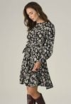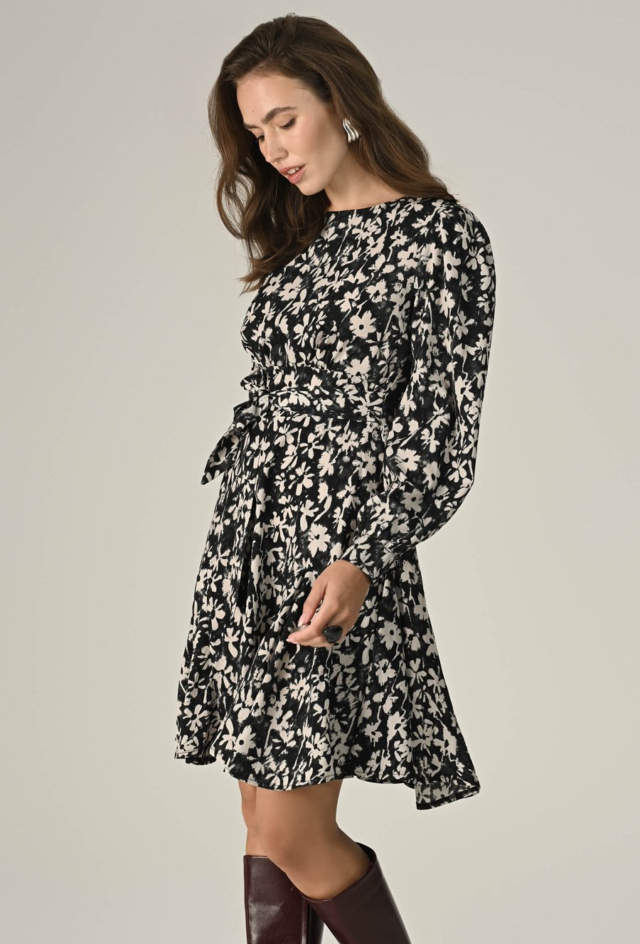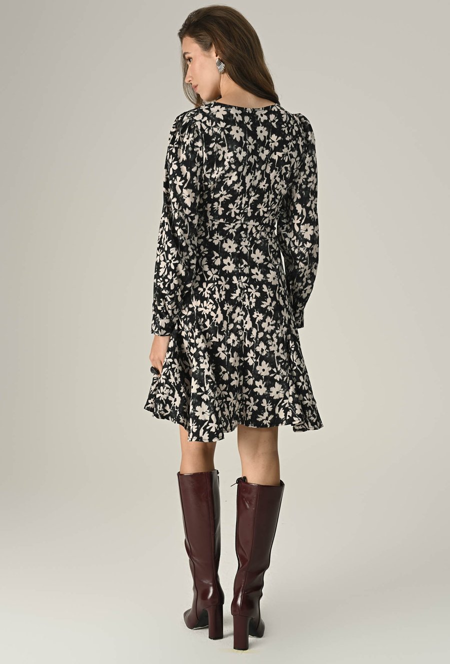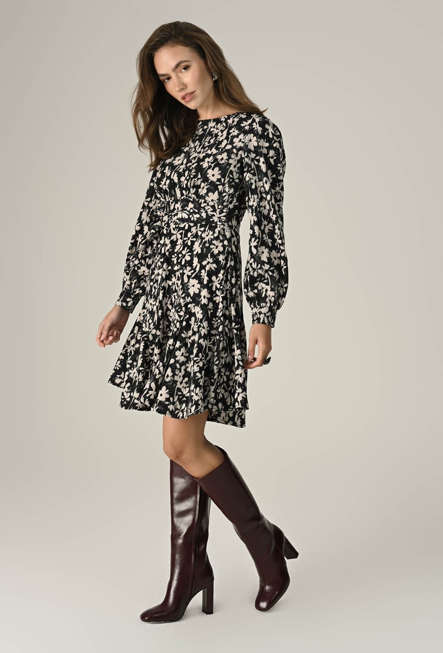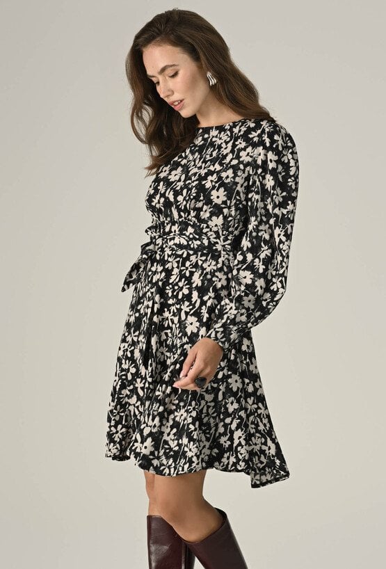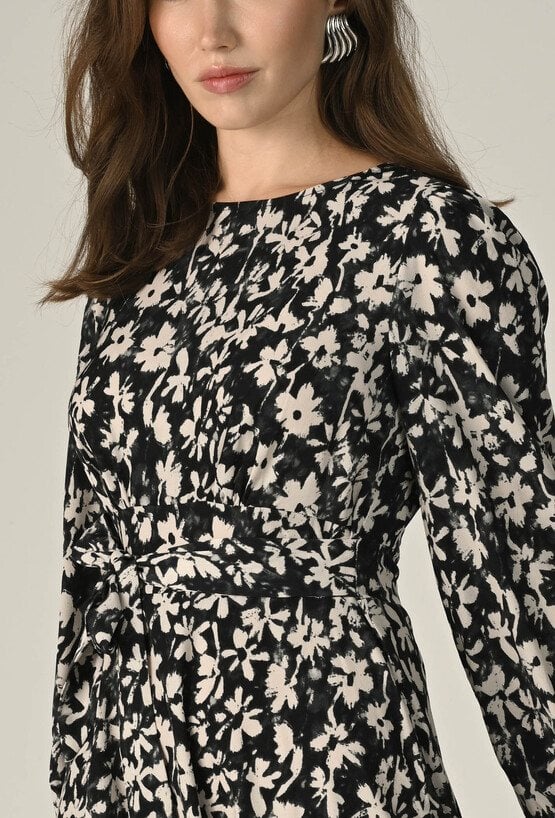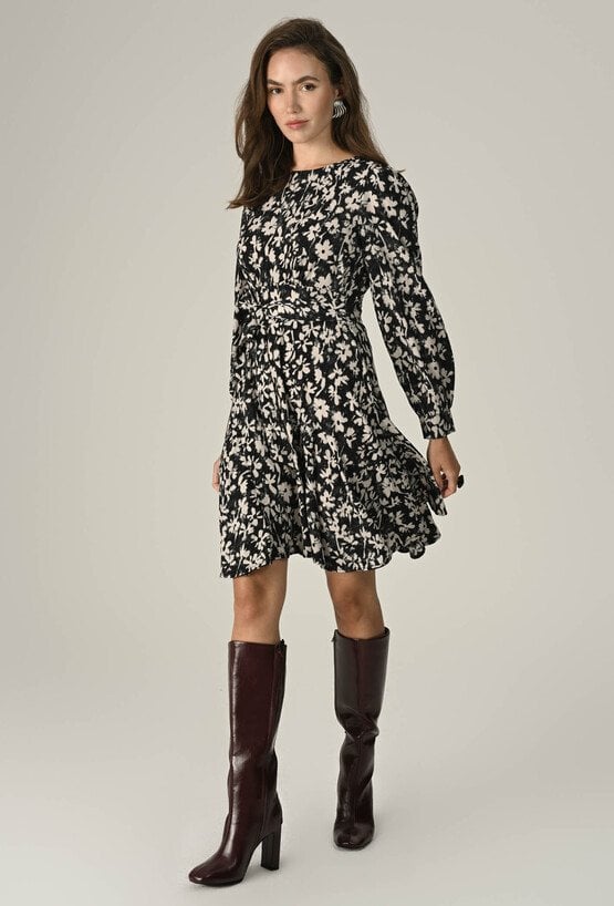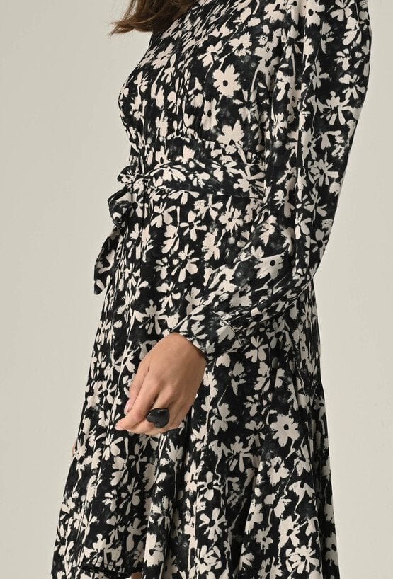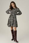 Sukienka wykonana z przyjemnego w dotyku materiału w oryginalnym princie. Długie rękawy zakończone mankietami i praktyczny zamek z tyłu sprawiają, że jest to idealny wybór na eleganckie, ale wygodne stylizacje na co dzień. Modelka na zdjęciu ma 173 cm wzrostu i prezentuje rozmiar 36.
