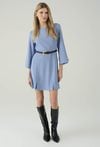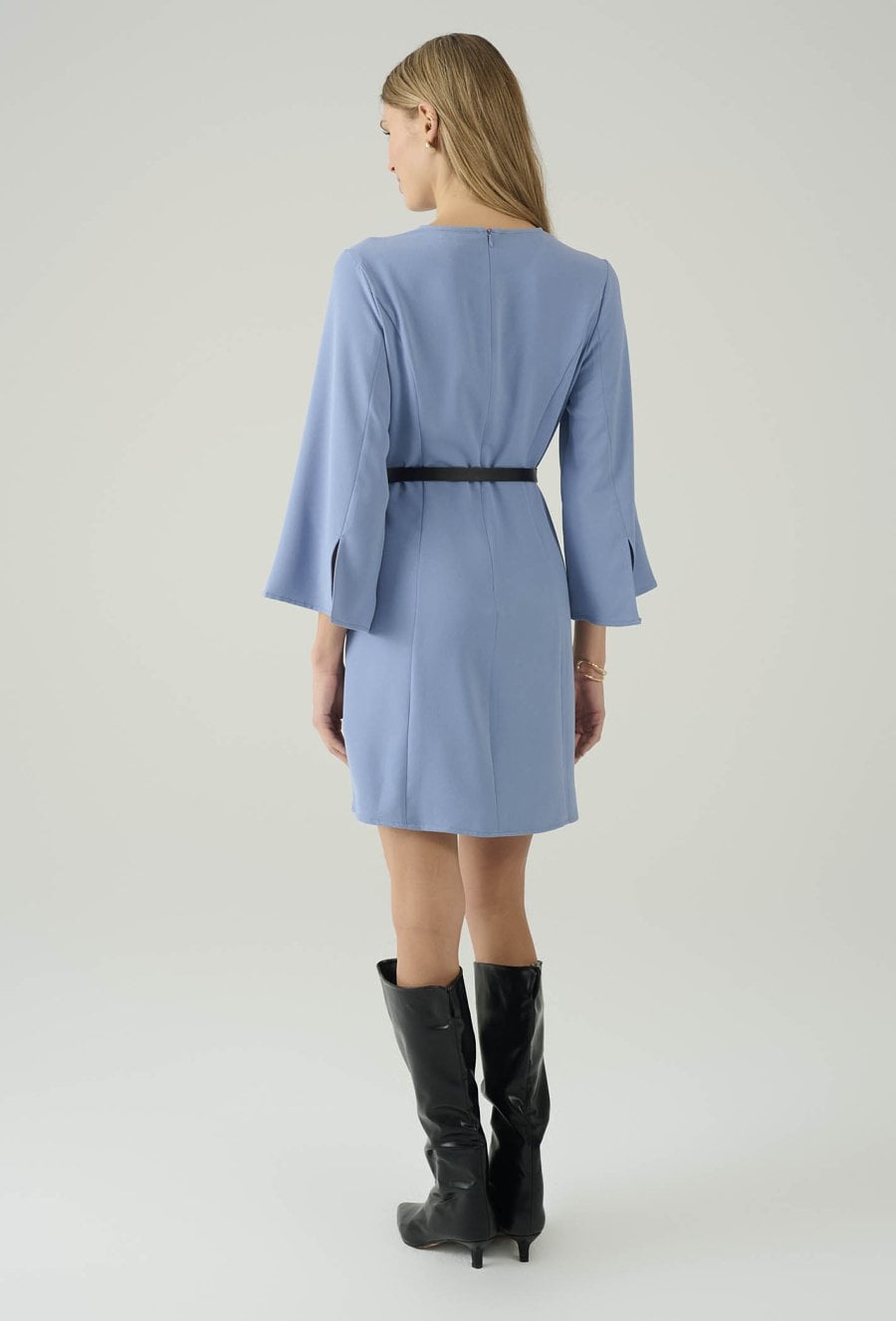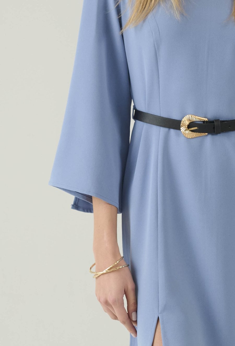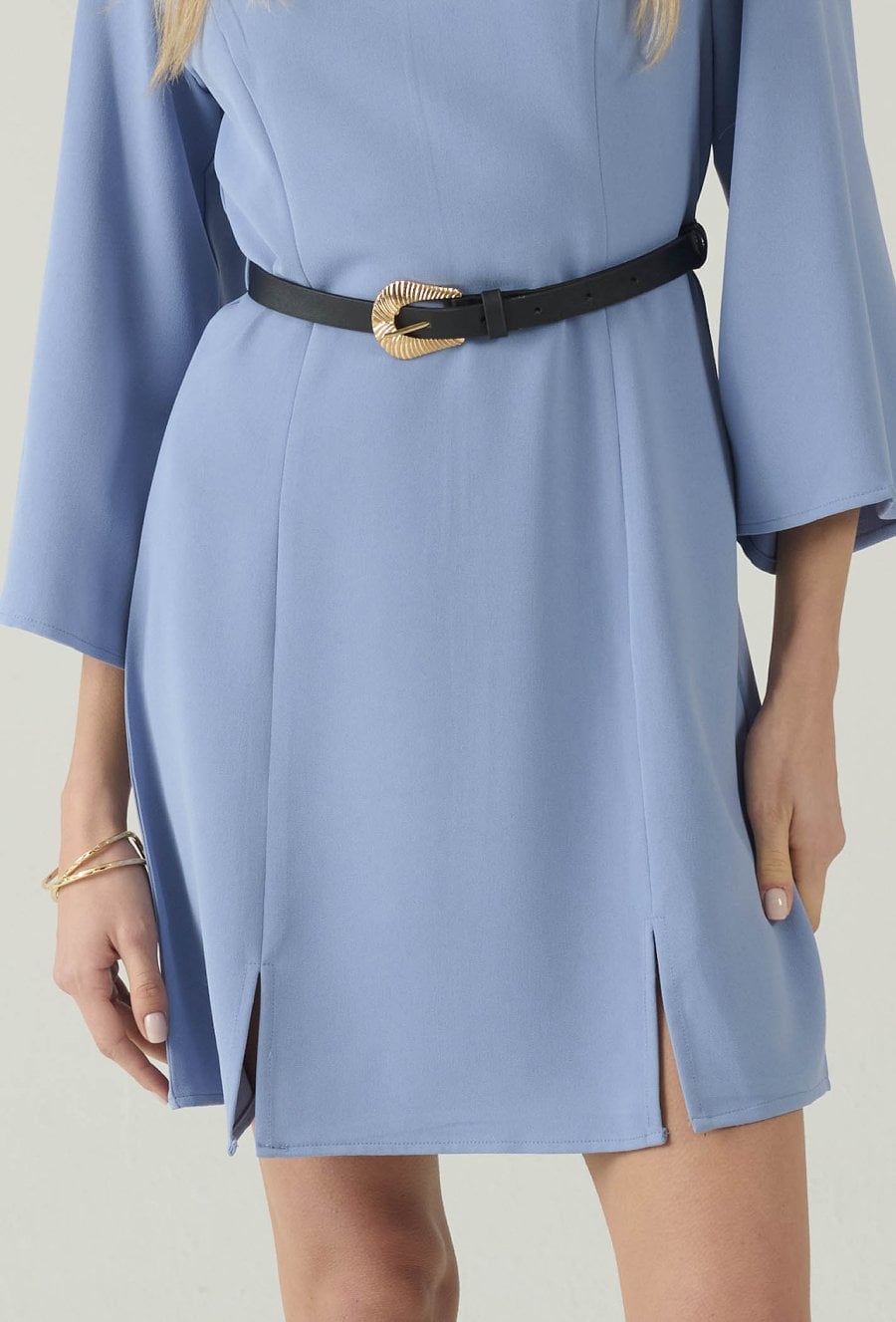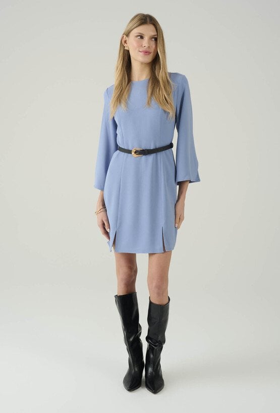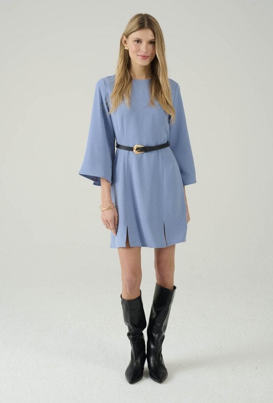 Stylowa sukienka w niebieskim odcieniu, która łączy minimalizm z kobiecą elegancją. Prosty fason pięknie układa się na sylwetce, a pasek w talii pozwala podkreślić proporcje i nadać całości bardziej dopracowany charakter. Rękawy o długości 3/4 z delikatnie rozkloszowanym wykończeniem dodają lekkości i subtelnego efektu „wow”. Dodatkowe rozcięcia u dołu zapewniają swobodę ruchów i sprawiają, że model świetnie sprawdza się zarówno w codziennych stylizacjach, jak i na spotkania czy wyjścia. Noś ją z kozakami, botkami lub szpilkami – w zależności od okazji.