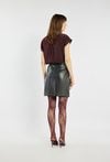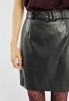 Spódnica mini o prostym kroju. Wyposażona w szeroki pasek z klamrą, który podkreśla talię i dodaje całości nowoczesnego charakteru. Gładka faktura i klasyczna linia sprawiają, że to model idealny zarówno do eleganckich stylizacji, jak i codziennych zestawów z nutą rockowego stylu. Modelka na zdjęciu ma 177 cm wzrostu i prezentuje rozmiar 36.