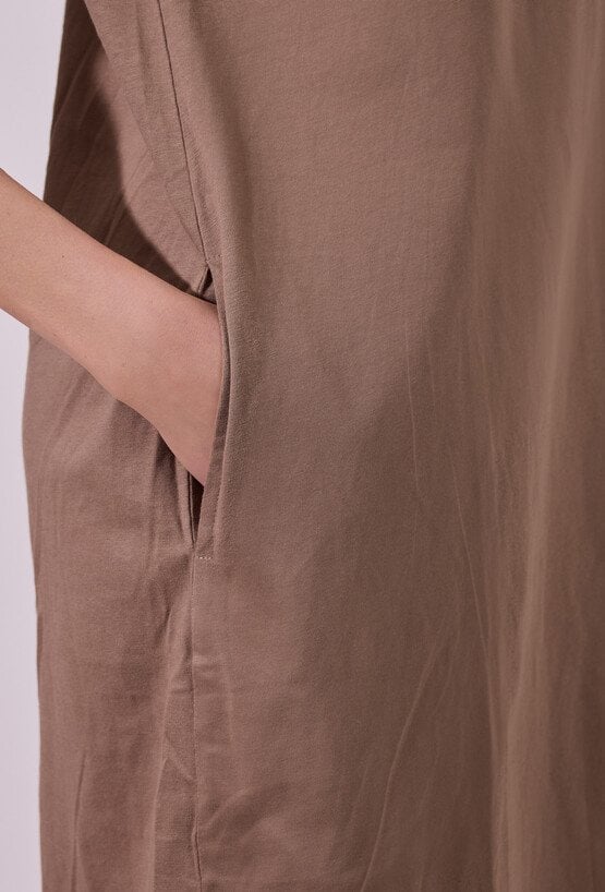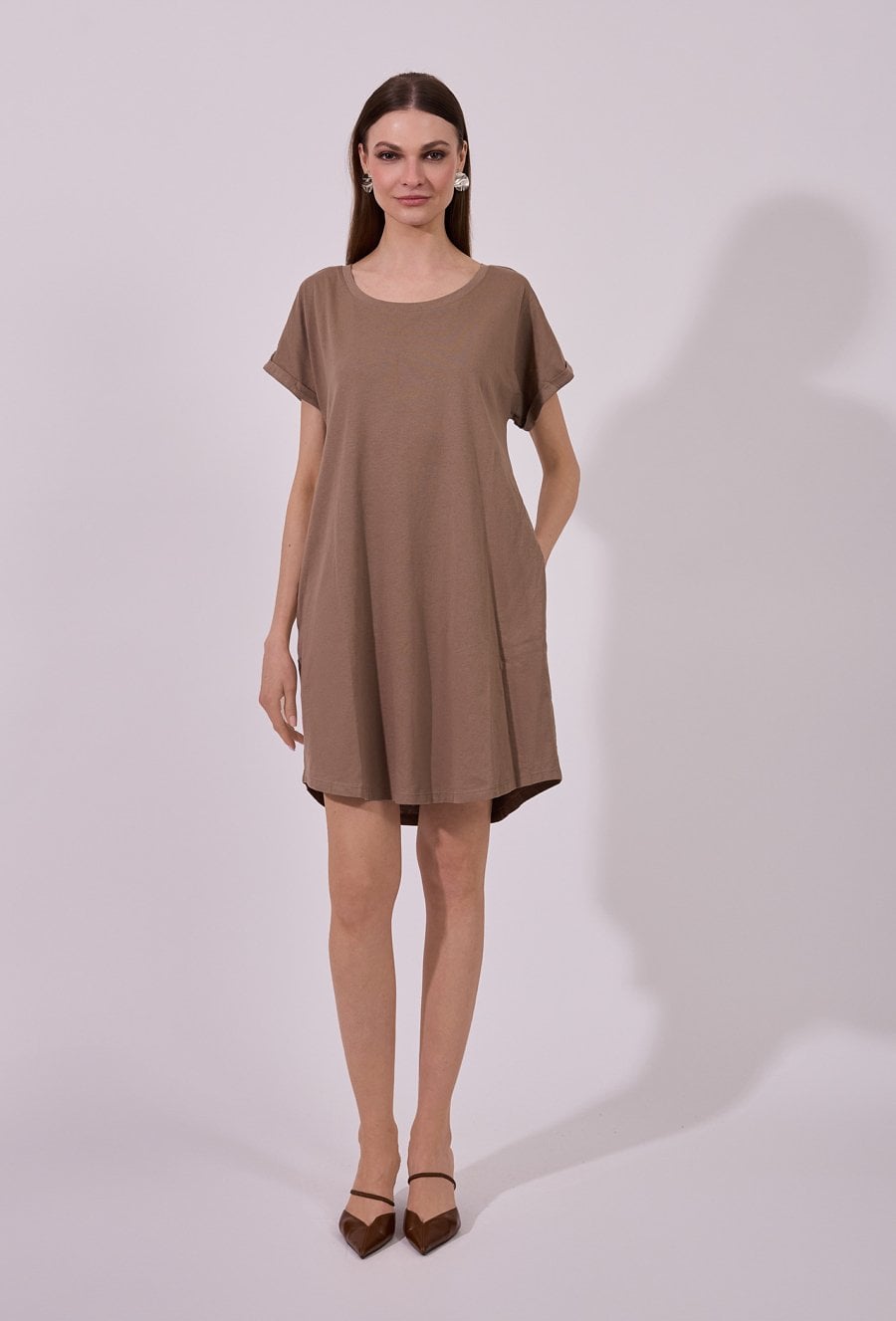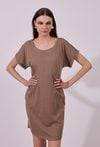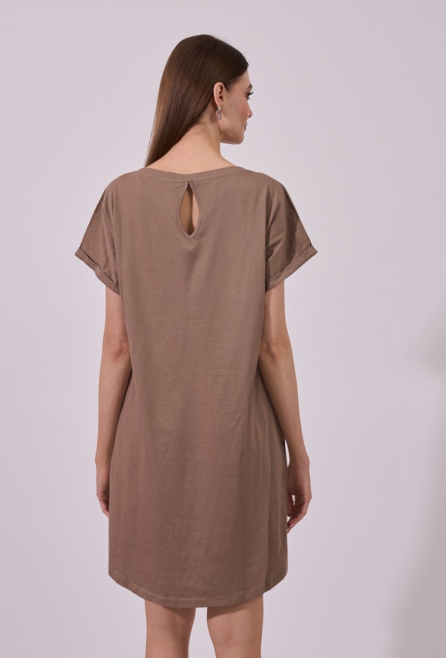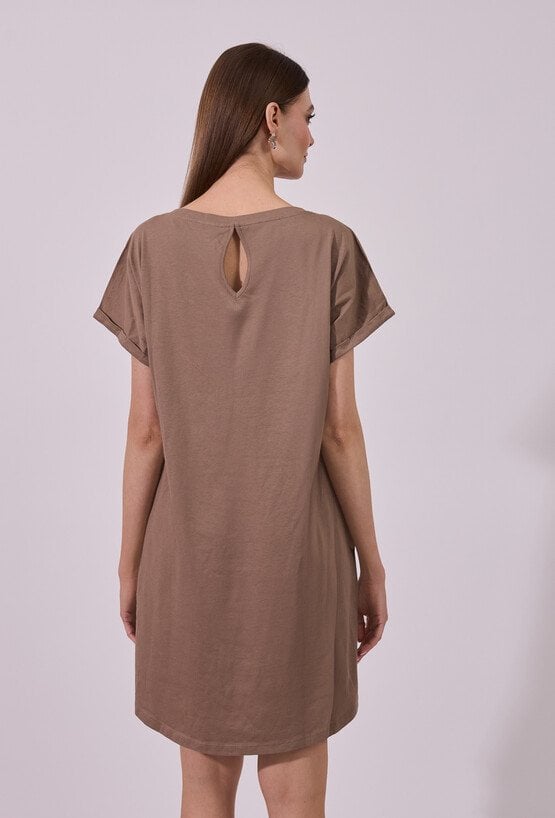 Sukienka damska o luźnym, swobodnym kroju mini z krótkim rękawem. Model z klasycznym, okrągłym dekoltem oraz podwiniętymi rękawami, które nadają całości casualowego charakteru. Minimalistyczny fason sprawia, że sukienka doskonale sprawdzi się w codziennych stylizacjach, gwarantując wygodę i ponadczasowy wygląd.