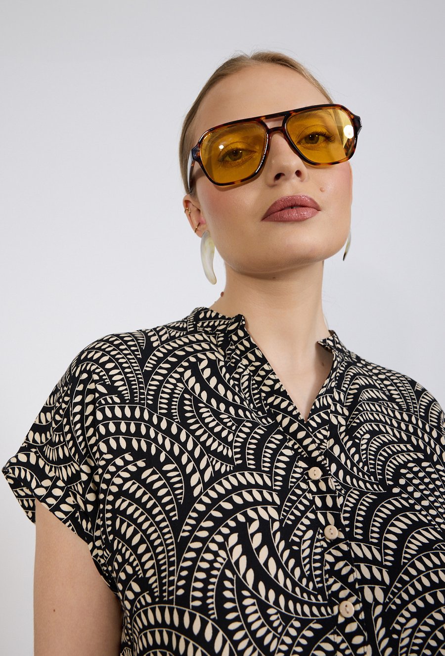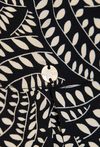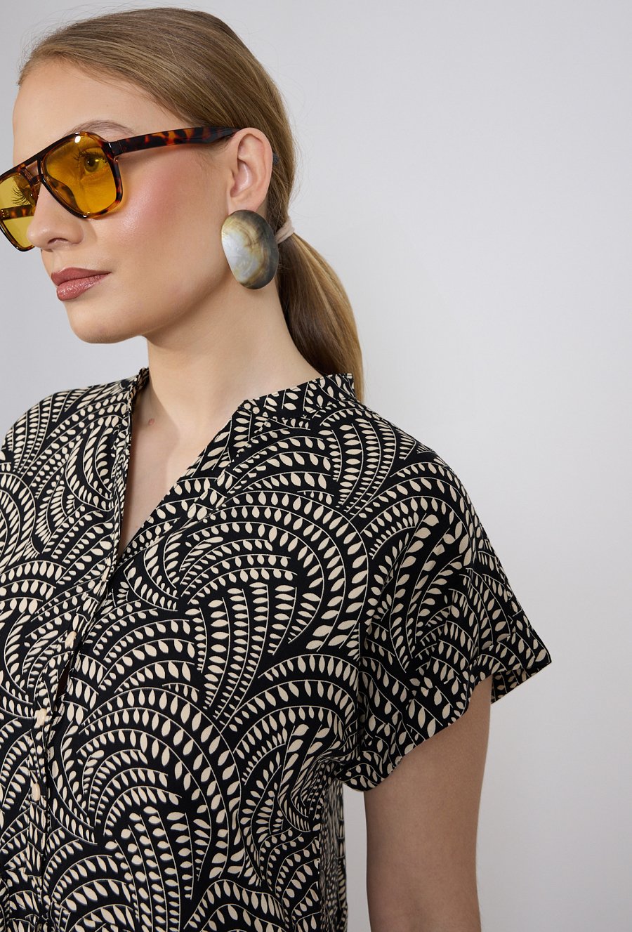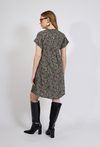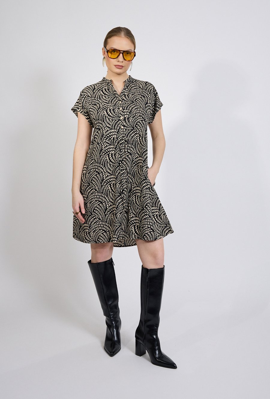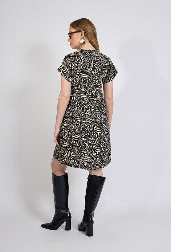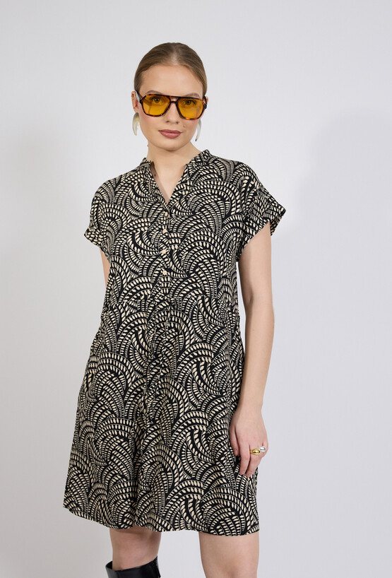 Sukienka damska o swobodnym, lekko rozkloszowanym kroju. Model o długości przed kolano z krótkim rękawem oraz dekoltem w kształcie litery V wykończonym subtelną stójką. Całość zdobi efektowny, graficzny wzór, który nadaje stylizacji nowoczesnego charakteru. Dodatkowym atutem są praktyczne kieszenie po bokach. Modelka na zdjęciu ma 177 cm wzrostu i prezentuje rozmiar 36.