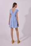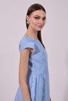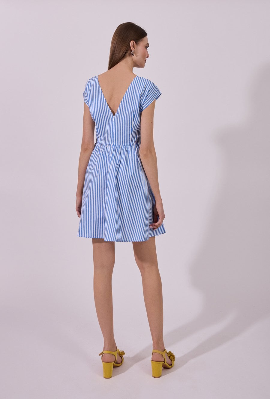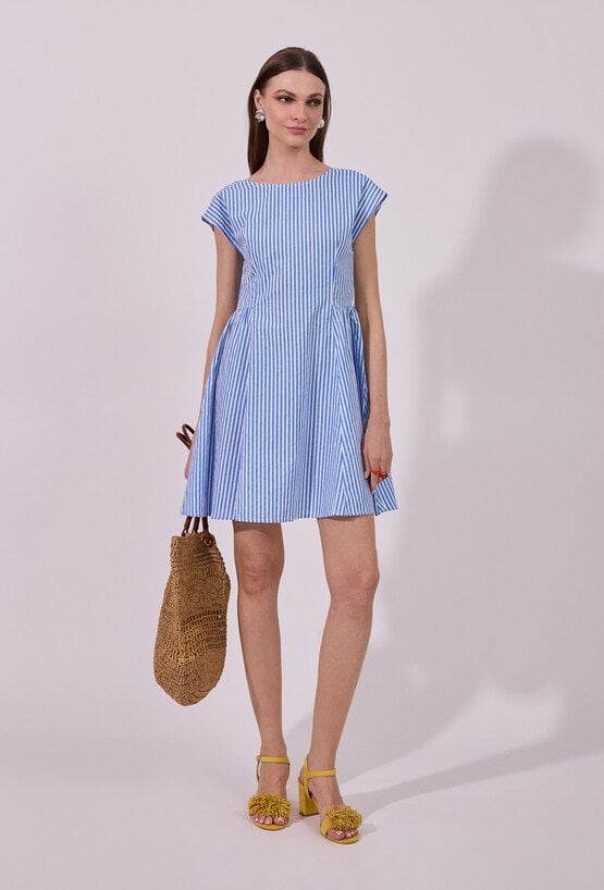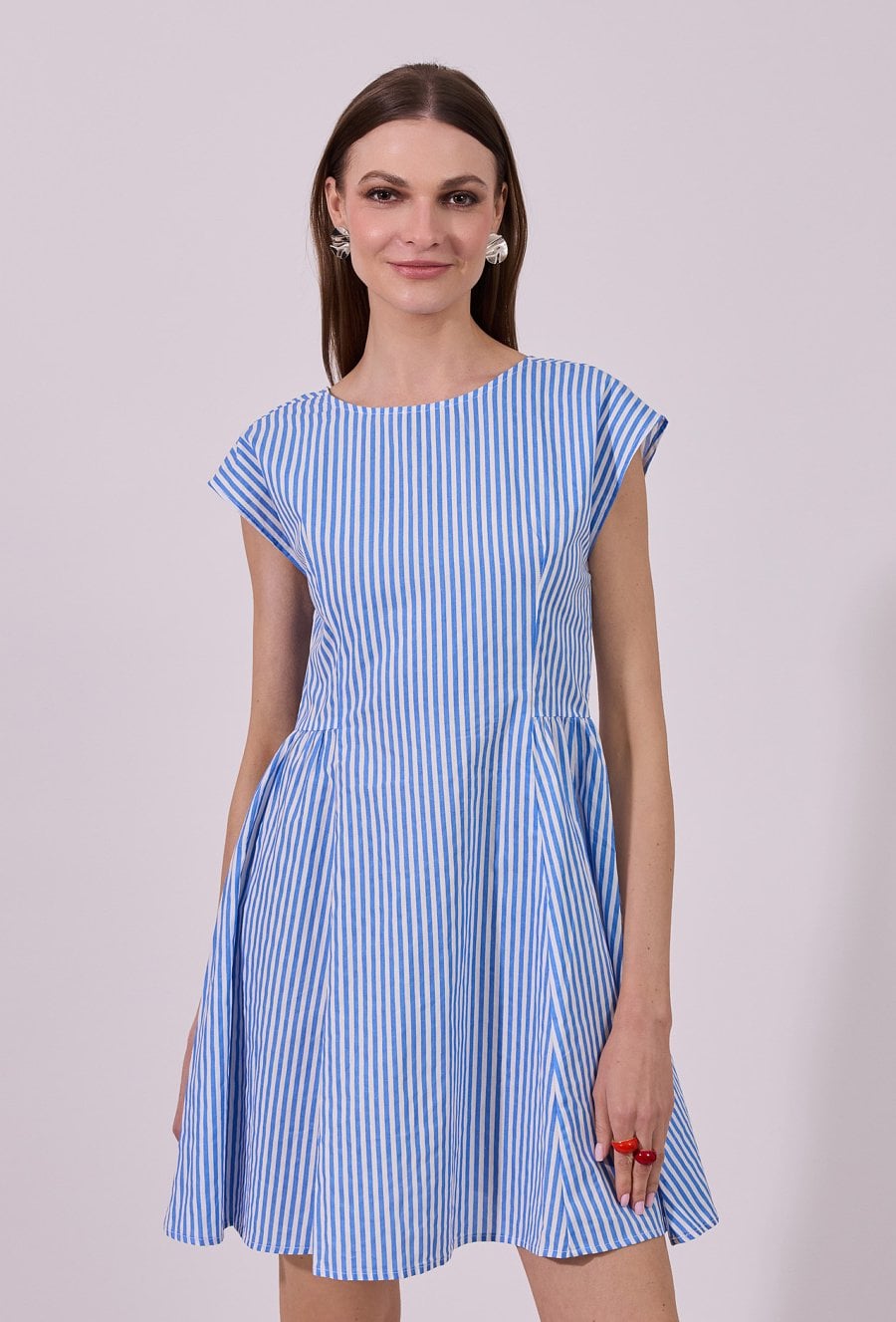 Sukienka damska o rozkloszowanym kroju mini z krótkim rękawem. Model z łódkowym dekoltem, który subtelnie podkreśla linię ramion. W talii delikatnie dopasowana, z rozkloszowanym dołem, pięknie układa się w ruchu. Całość zdobi klasyczny wzór w pionowe paski, który optycznie wysmukla sylwetkę. Modelka na zdjęciu ma 177 cm wzrostu i prezentuje rozmiar 36.