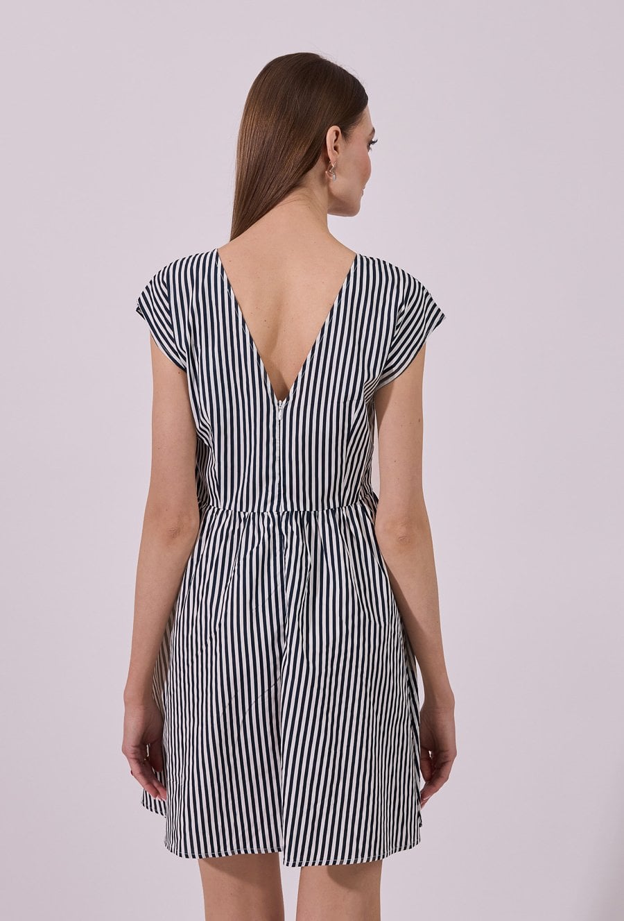 Sukienka damska o rozkloszowanym kroju mini z krótkim rękawem. Model z łódkowym dekoltem, który subtelnie podkreśla linię ramion. W talii delikatnie dopasowana, z rozkloszowanym dołem, pięknie układa się w ruchu. Całość zdobi klasyczny wzór w pionowe paski, który optycznie wysmukla sylwetkę. Modelka na zdjęciu ma 177 cm wzrostu i prezentuje rozmiar 36.