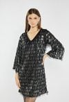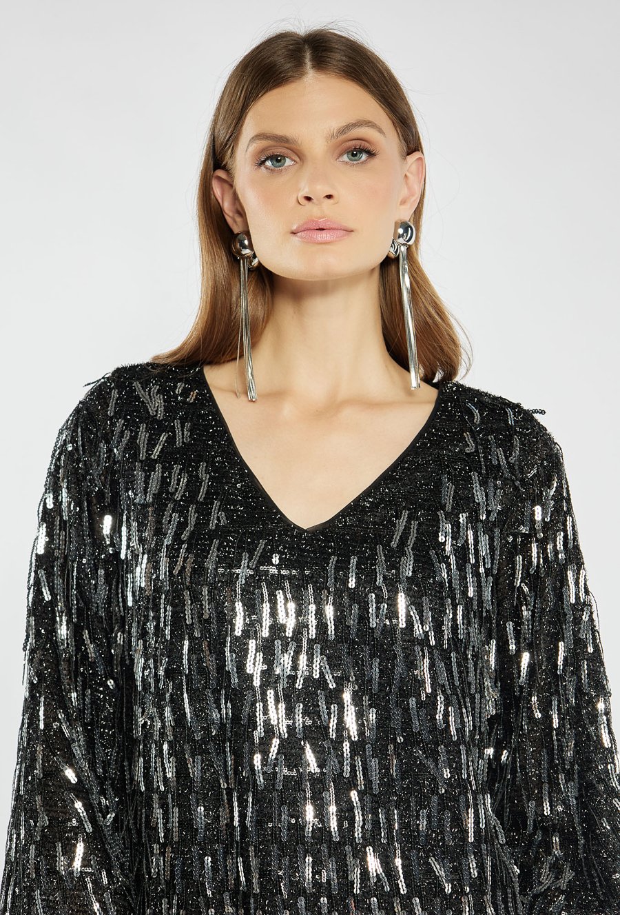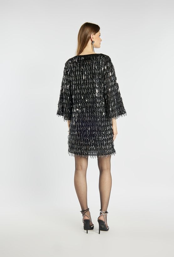 Olśniewająca sukienka o prostym kroju, cała pokryta mieniącymi się cekinami i frędzlami, które pięknie poruszają się w rytm każdego kroku. Dekolt w kształcie litery V subtelnie podkreśla kobiecość, a długość mini nadaje stylizacji lekkości i energii. Idealna propozycja na sylwestra, karnawał czy inne wieczorne wyjścia. Modelka na zdjęciu ma 177 cm wzrostu i prezentuje rozmiar 36.