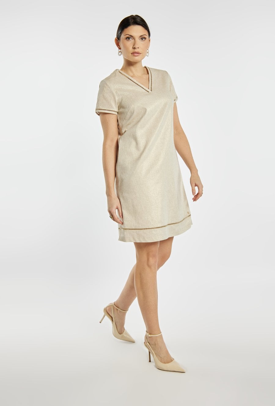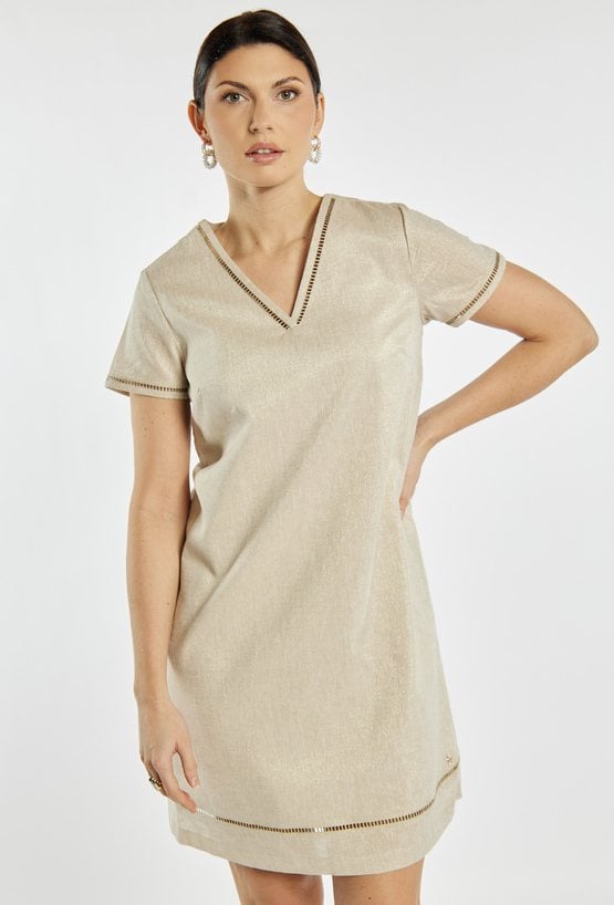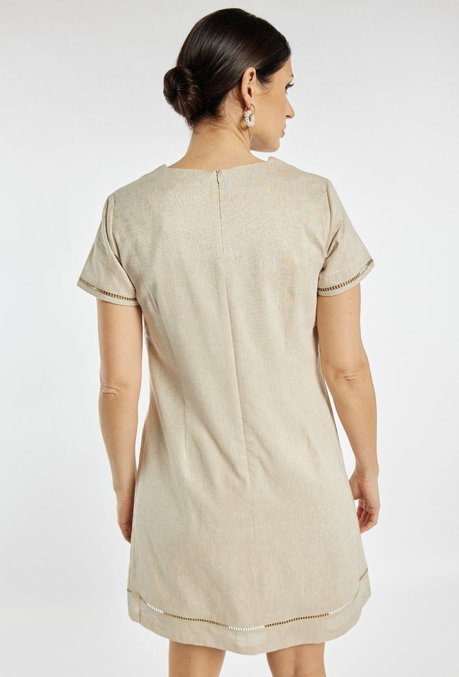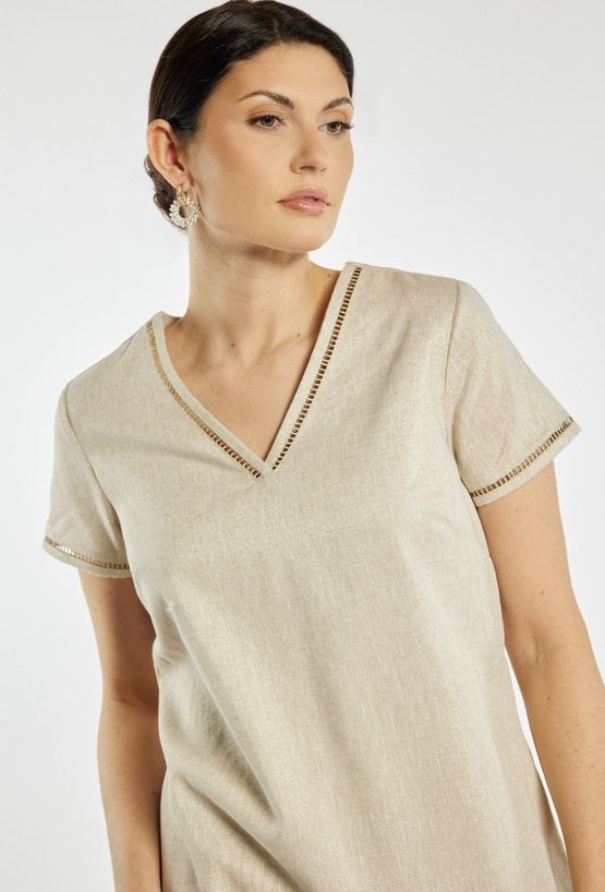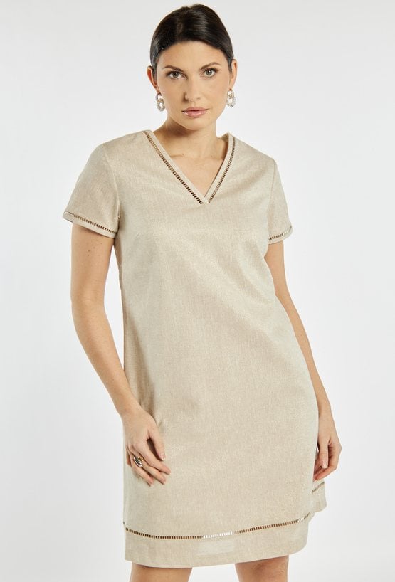 Elegancka sukienka damska mini z krótkim rękawem i dekoltem w kształcie litery V. Model wykonany z materiału z dodatkiem lnu wyróżnia się prostym krojem oraz subtelnymi zdobieniami przy rękawach i dekolcie. Sukienka doskonale sprawdzi się na komunię, letnie przyjęcia, spotkania oraz inne uroczystości. Modelka na zdjęciu ma 177 cm wzrostu i prezentuje rozmiar 36.