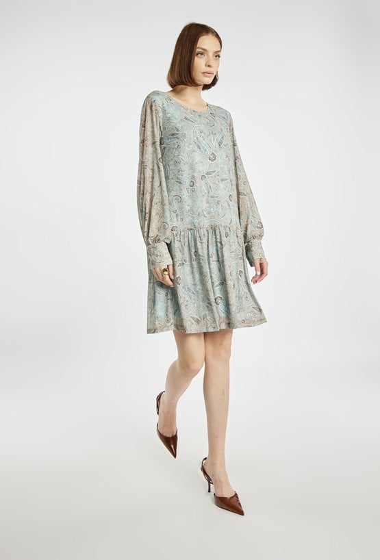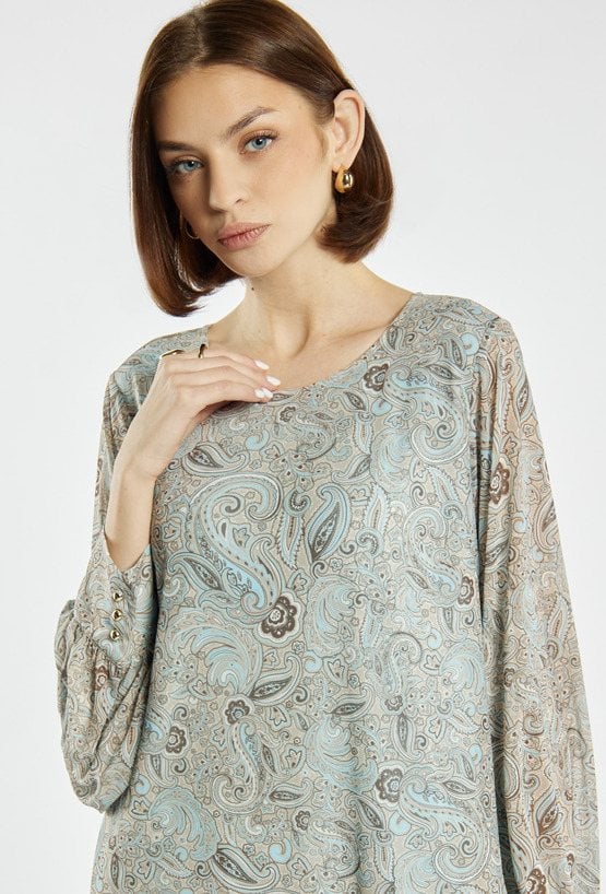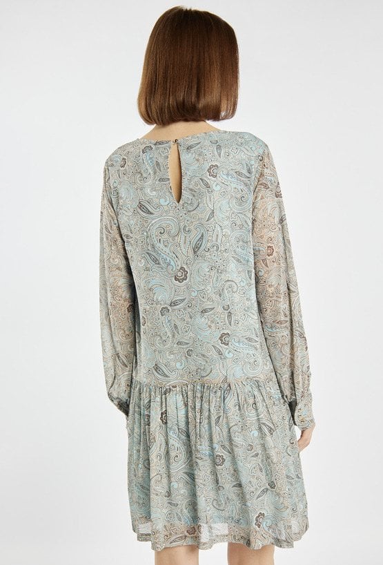 Sukienka z wyrazistym, abstrakcyjnym wzorem. Model z okrągłym dekoltem oraz rękawami o długości 3/4, zakończonymi luźnym wykończeniem. Długość przed kolano (mini) podkreśla nogi i nadaje stylizacji lekkości. Idealna na co dzień, spotkania lub wyjścia, zarówno w połączeniu ze szpilkami, jak i botkami. Modelka na zdjęciu ma 177 cm wzrostu i prezentuje rozmiar S.