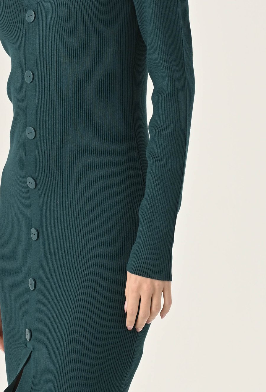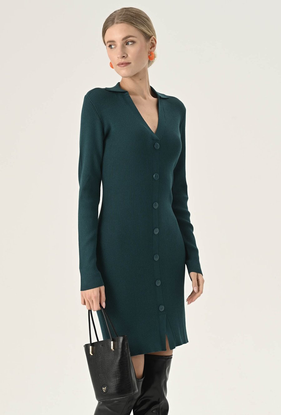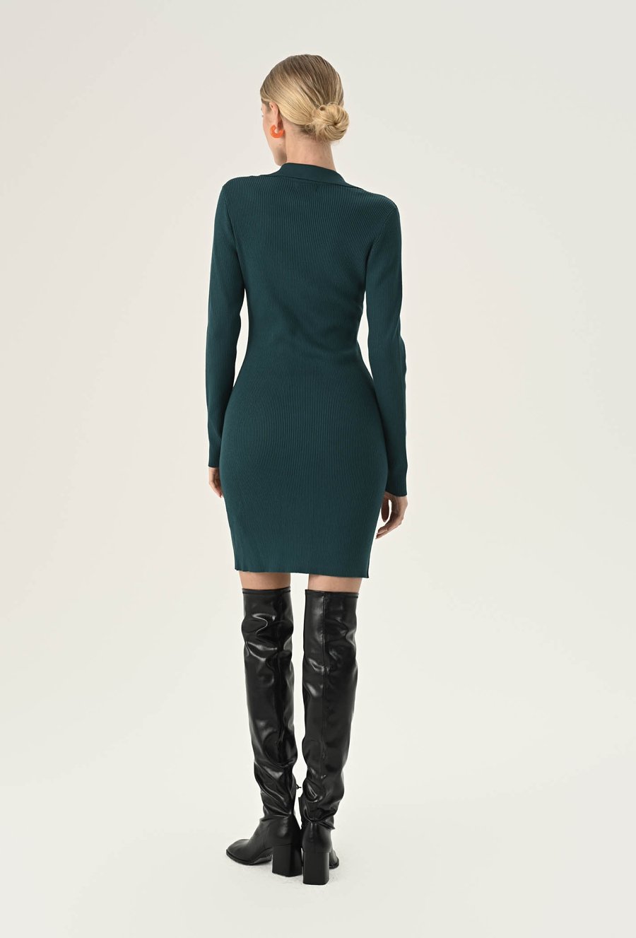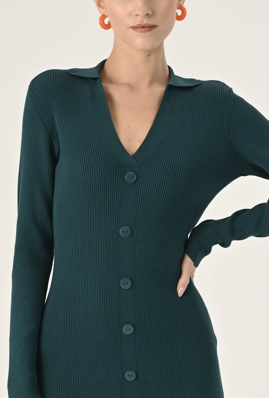 Stylowa sukienka z elastycznej, prążkowanej dzianiny, która podkreśla sylwetkę. Klasyczny dekolt V z kołnierzykiem dodaje elegancji, a dopasowany krój sprawdzi się zarówno na co dzień, jak i w biurowych stylizacjach. Komfortowa, kobieca i uniwersalna. Modelka na zdjęciu ma 174 cm wzrostu i nosi rozmiar 36/S.