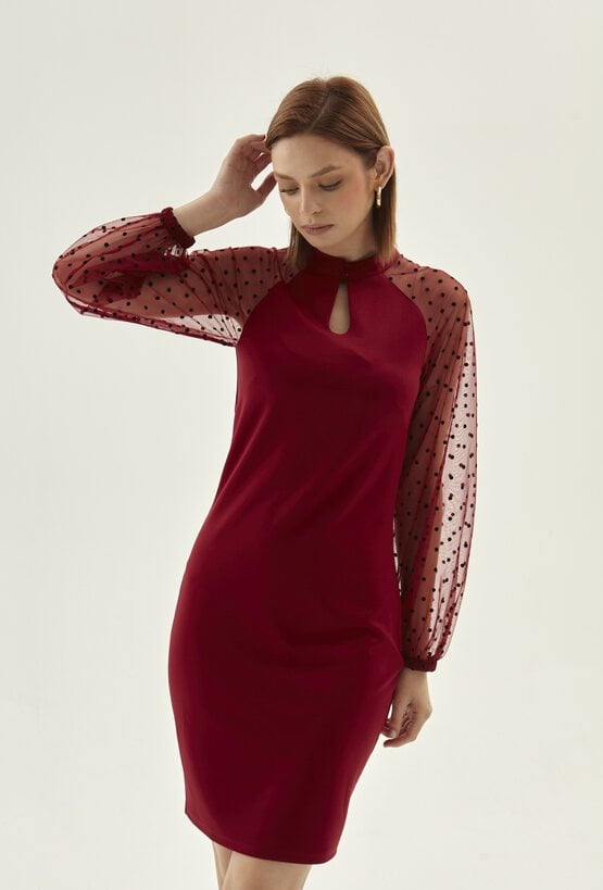 Elegancka sukienka w kolorze bordowym z ozdobnymi rękawami wykonanymi z siateczki w kropki. Sukienka posiada ozdobne wycięcie na dekolcie w kształcie łezki oraz zapinany na guziczki półgolf. Ten niezwykle elegancji i szykowny model idealnie sprawdzi się na wyjątkową okazję. Modelka na zdjęciu ma 172 cm wzrostu i prezentuje rozmiar 36.
