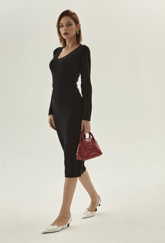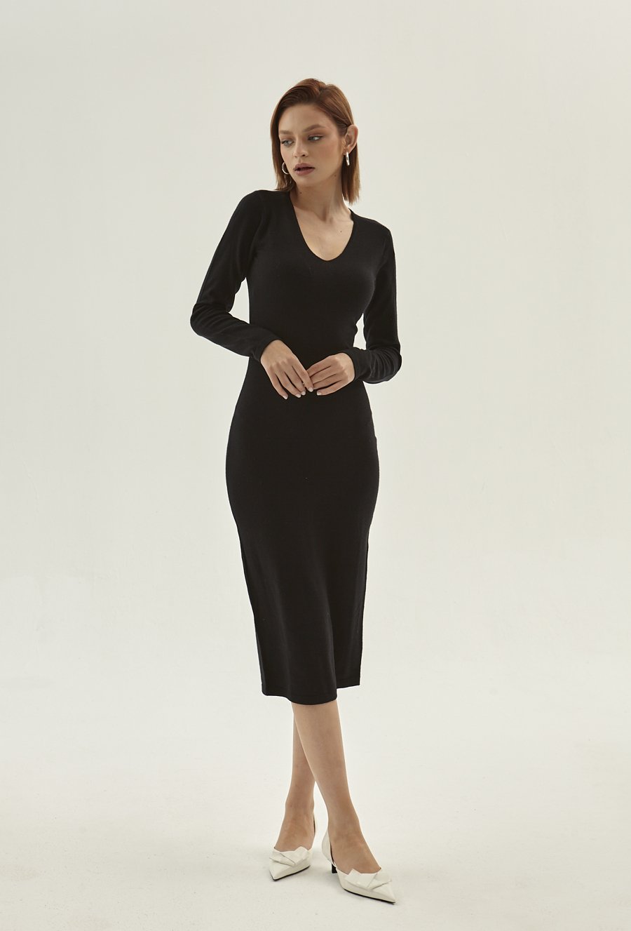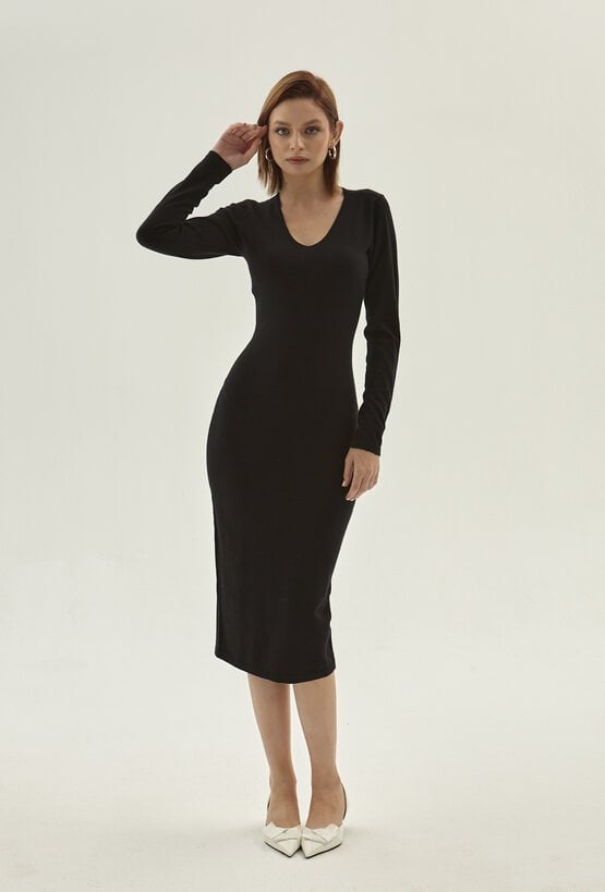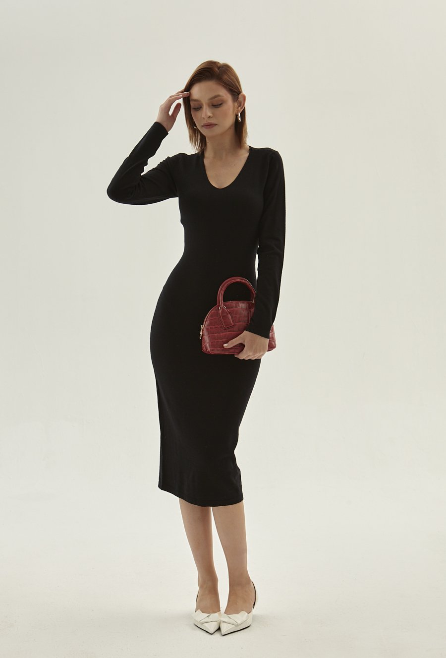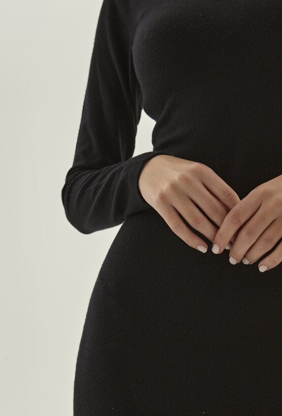 Czarna, dopasowana sukienka wykonana z przyjemnej w dotyku wiskozowej dzianiny. Długość poniżej kolan prezentuje się klasycznie. Posiada kobiecy dekolt, jednocześnie pięknie podkreśla sylwetkę. Modelka na zdjęciu ma 175 cm wzrostu i prezentuje rozmiar 36.