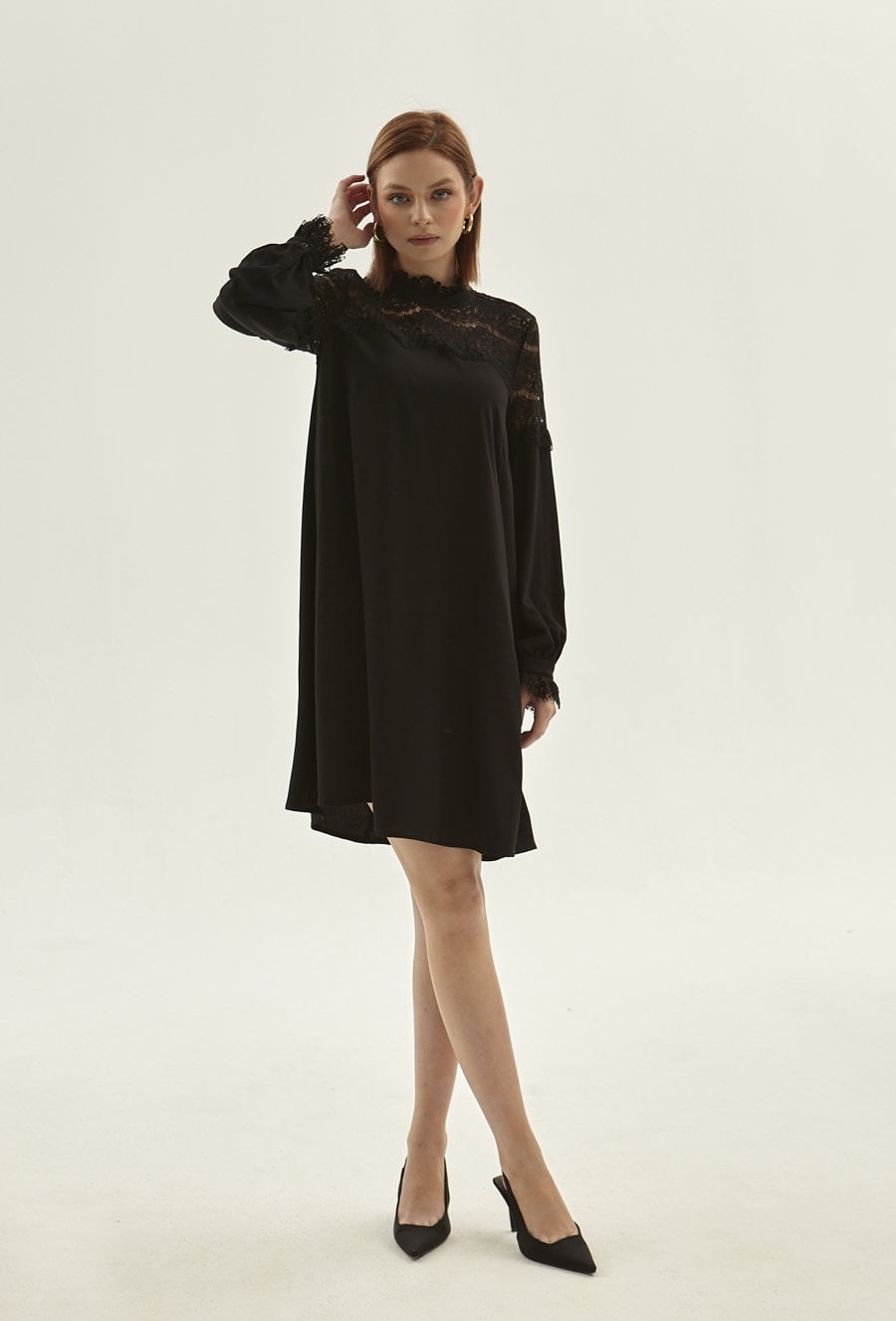 Czarna sukienka z koronkowym panelem to gwarancja doskonałej stylizacji. Absolutnie wytworna i zmysłowa, idealnie sprawdzi się na wyjątkowe okazje . Luźny fason, pozwoli poczuć się swobodnie, koronkowe panele na dekolcie i rękawach dodają jej szlachetności. W tej sukience wygląda się świetnie. Modelka na zdjęciu ma 172 cm wzrostu i prezentuje rozmiar 36.