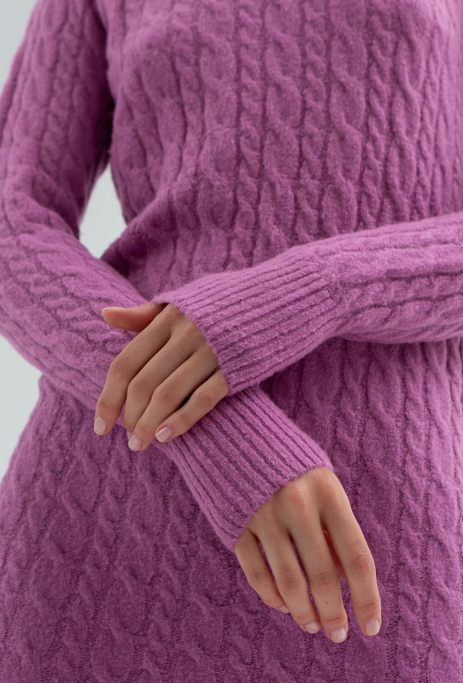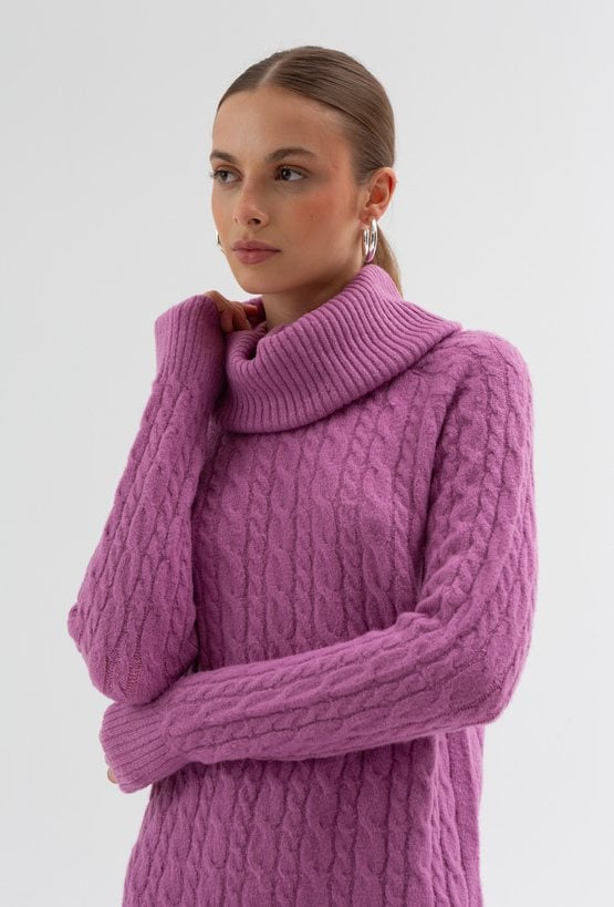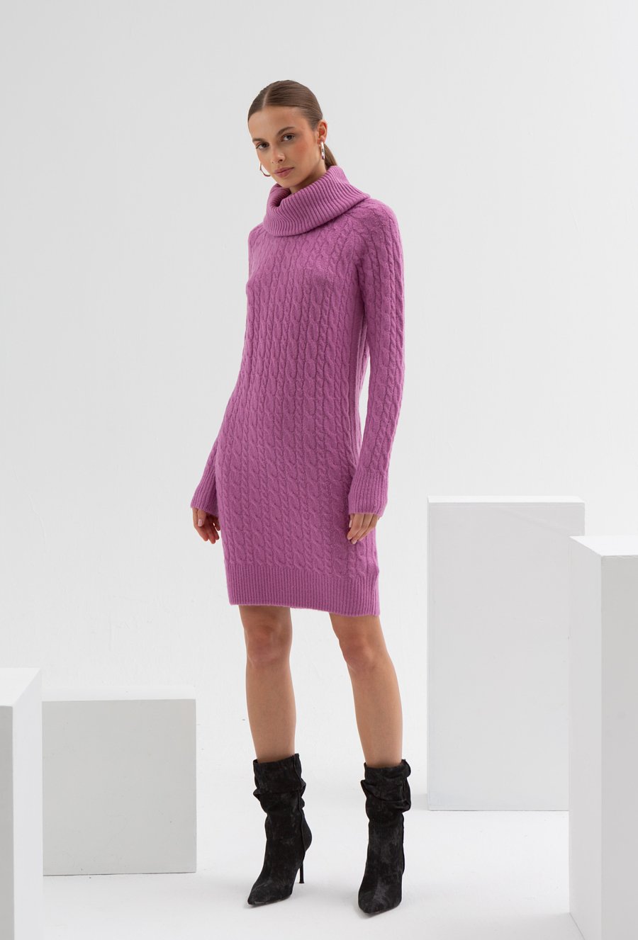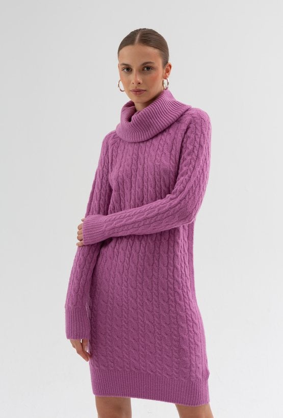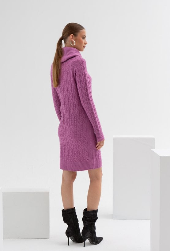 Sukienka w kolorze jasnego wrzosu wykonana z miękkiej i przyjemnej w dotyku dzianiny. Ma dopasowany fason z szerokim golfem, długość przed kolna. Sukienka ma długie rękawy. Ten model prezentuje się bardzo kobieco, bedzie doskonałą propozycją na chłodne jesienne dni. Noś ją z kozakami lub szpilkami. Modelka na zdjęciu ma 178 cm wzrostu i prezentuje rozmiar 36.