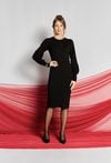 Dopasowana sukienka damska wykonana z wiskozy. Sukienka o długości lekko za kolano, z półokrągłym dekoltem i długimi, ażurowymi rękawami, które nadają jej lekkości i wyjątkowego charakteru. Idealna na eleganckie okazje, podkreśla sylwetkę i zapewnia komfort noszenia. Modelka na zdjęciu ma 177 cm wzrostu i prezentuje rozmiar 36.