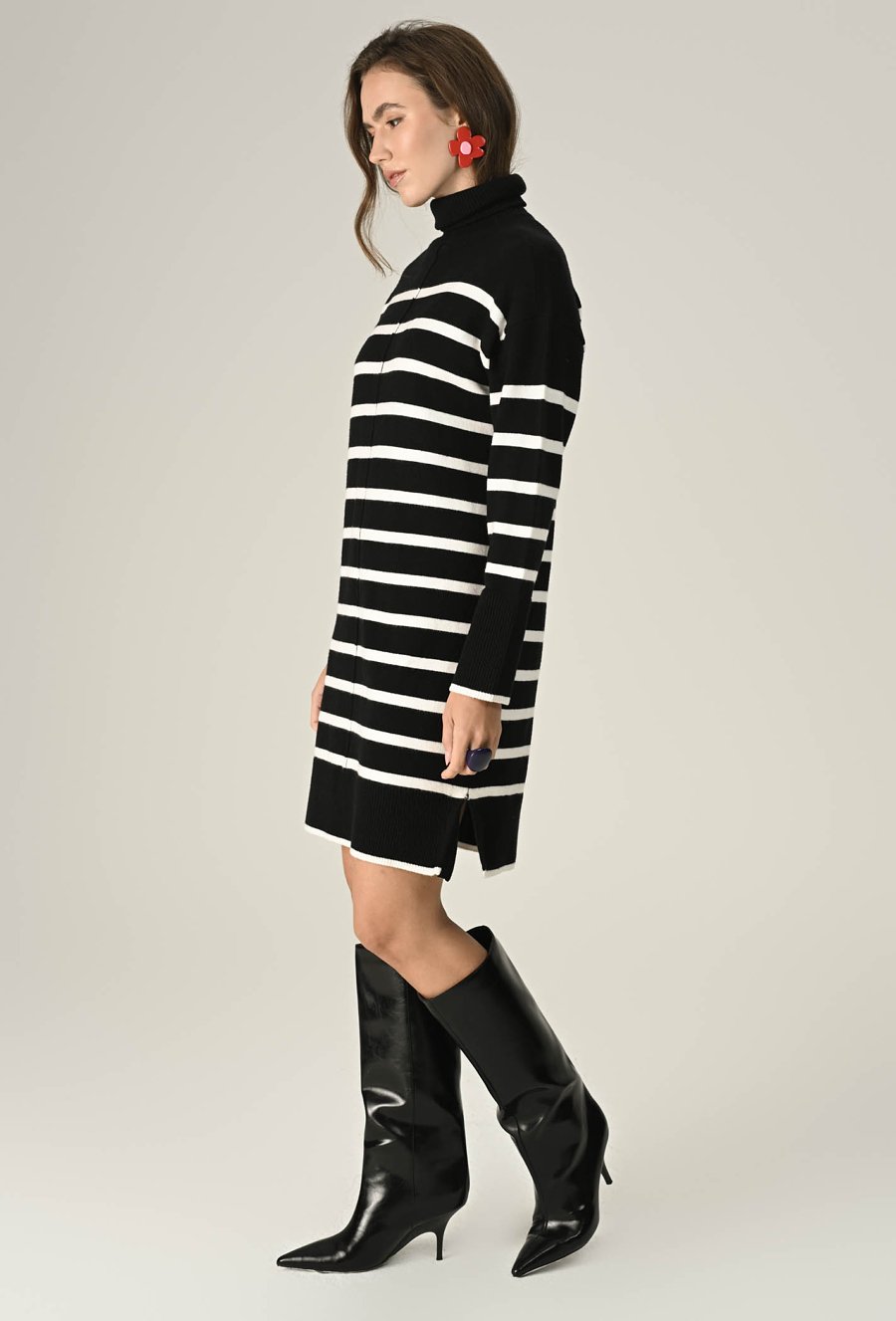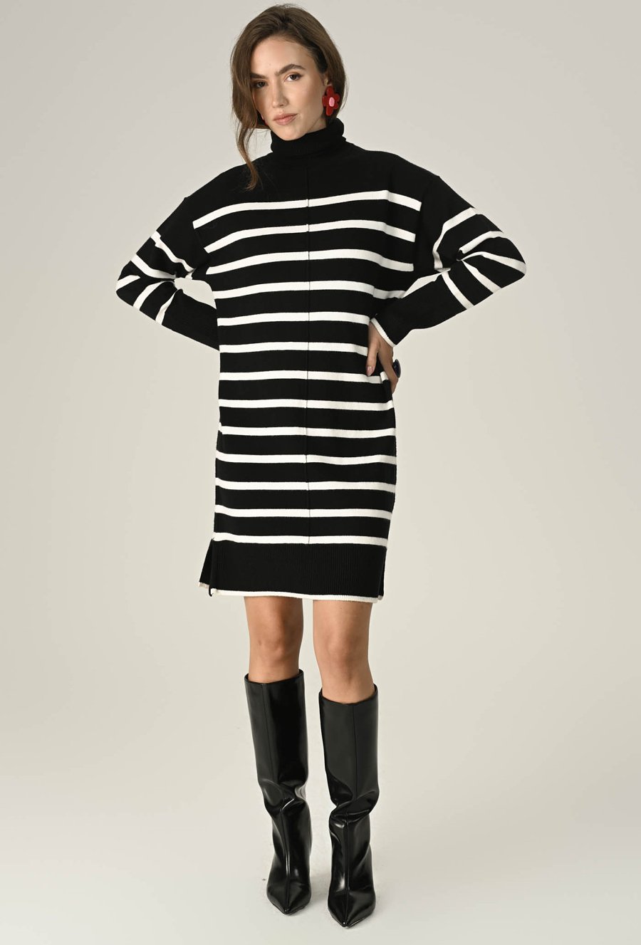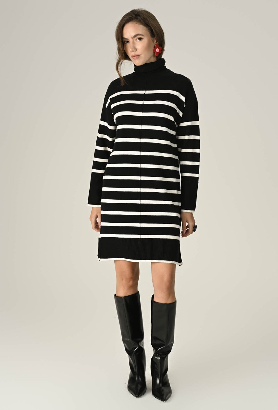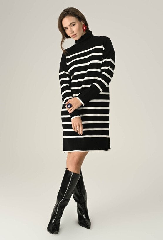 Stylowa sukienka swetrowa z miękkiej, przyjemnej w dotyku przędzy to idealny wybór na chłodniejsze dni. Klasyczny fason z golfem otula ciepłem, a ponadczasowy wzór w pasy dodaje charakteru i sprawia, że stylizacja wygląda świeżo i nowocześnie. Długość midi i dopasowany krój podkreślają sylwetkę, zapewniając jednocześnie komfort noszenia. Modelka na zdjęciu ma 174 cm wzrostu i prezentuje rozmiar 36.
