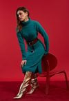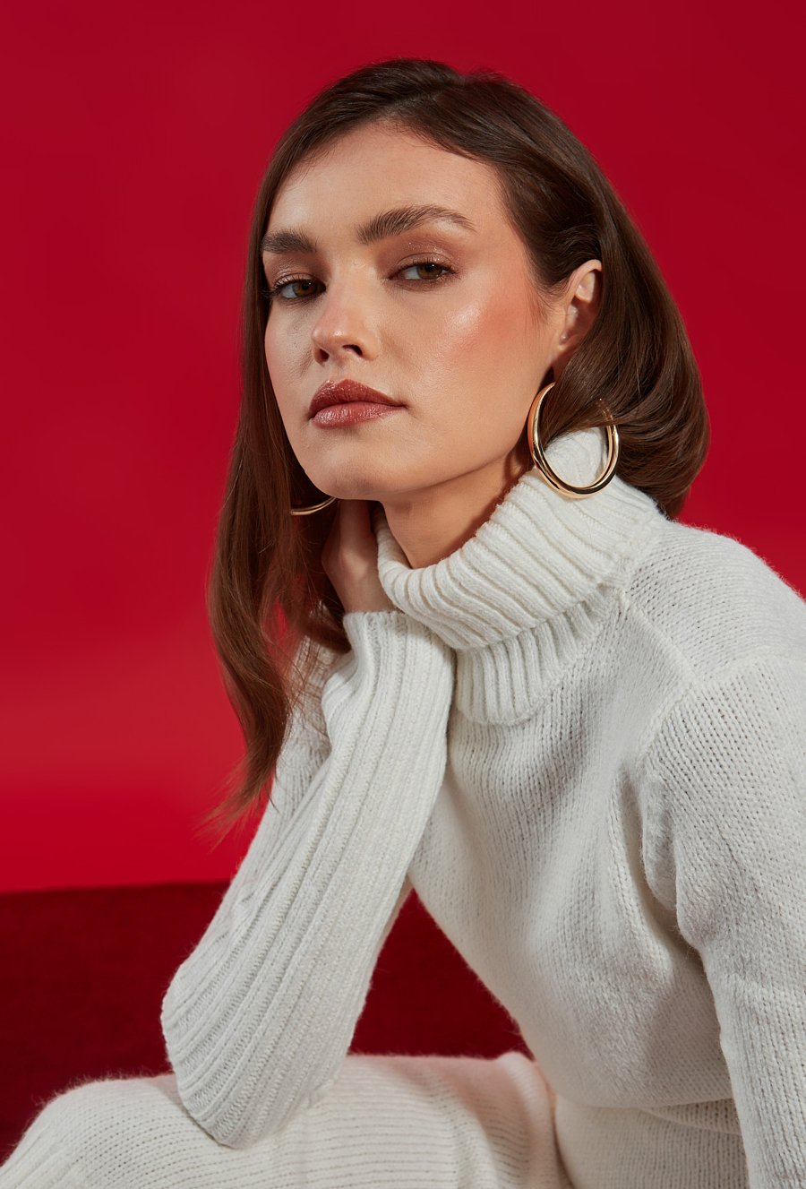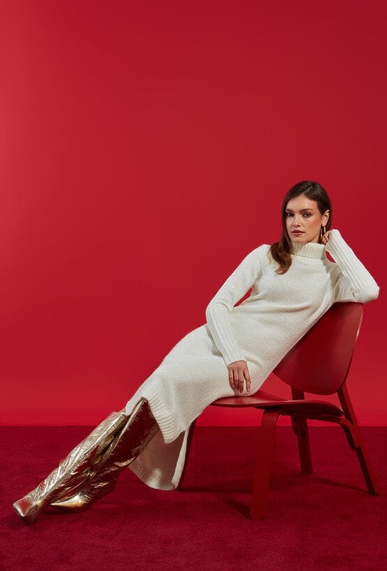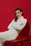 Długa sukienka w kolorze śmietanki, będzie doskonałym wyborem na chłodne dni. duży golf i mięsista dzianina sprawia, ze nie straszne będą nam chłody. Ma dopasowany fason z półgolfem. Sukienka na długość za kolana i prezentuje się bardzo kobieco. Noś ją z kozakami lub szpilkami. Modelka na zdjęciu ma 171 cm wzrostu i prezentuje rozmiar S.