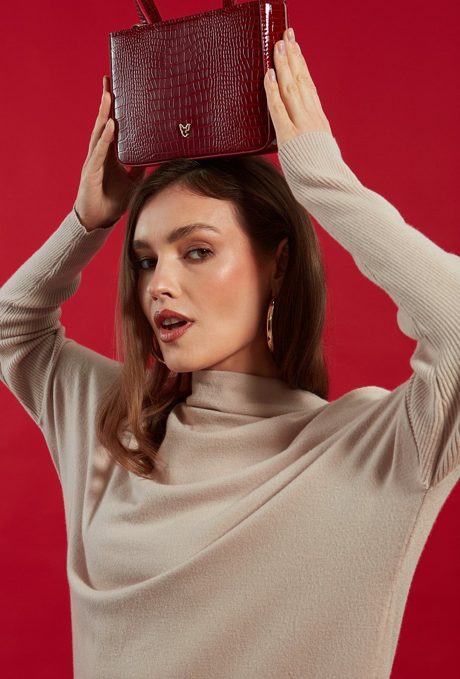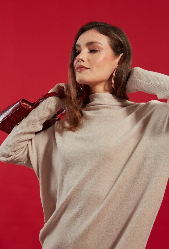 Beżowa sukienka z szerokim golfem wykonana z miękkiej i przyjemnej w dotyku dzianiny z dodatkiem wiskozy . Ma dopasowany fason, długość przed kolana i prezentuje się bardzo kobieco. Będzie doskonałą propozycją na chłodne jesienne dni. Noś ją z kozakami lub szpilkami. Modelka na zdjęciu ma 172 cm wzrostu i prezentuje rozmiar S.