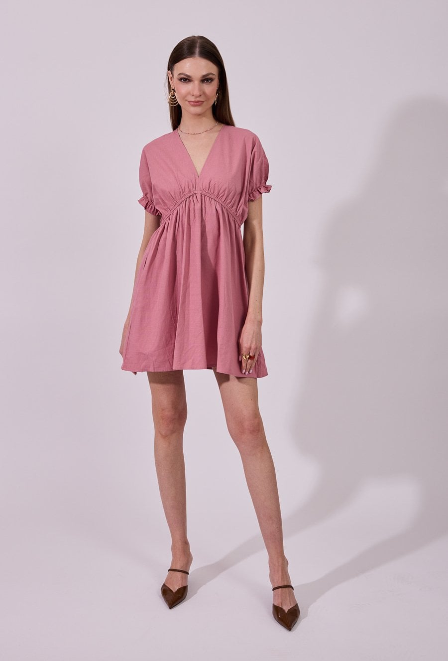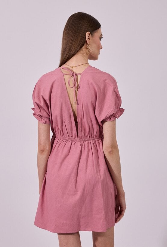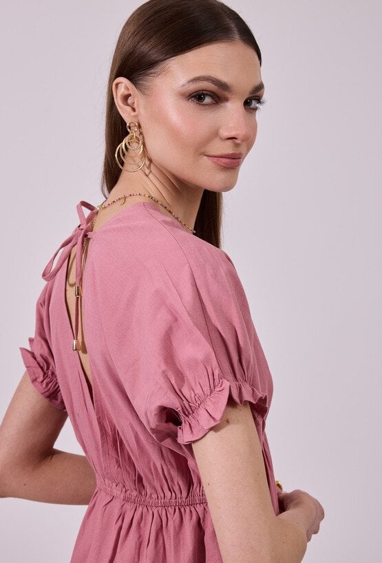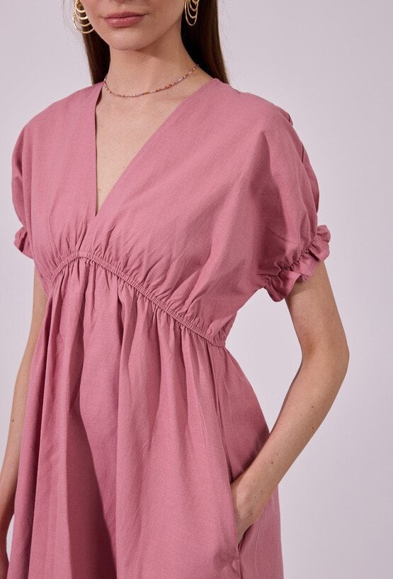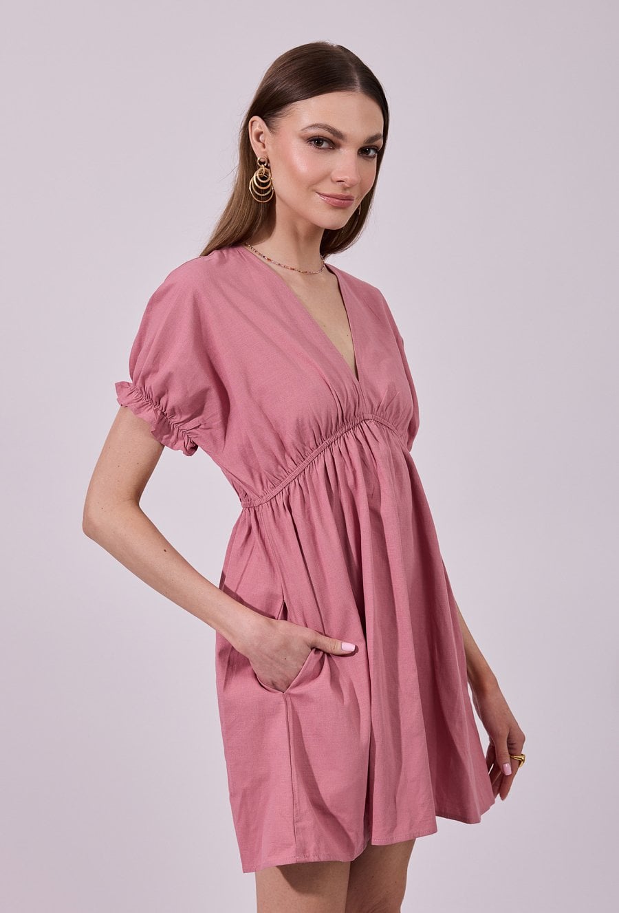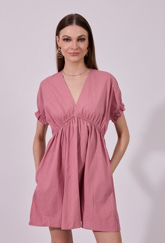 Sukienka damska o luźnym, rozkloszowanym kroju mini z krótkim rękawem. Model z dekoltem w kształcie litery V oraz odcięciem pod biustem, które nadaje całości lekkości i podkreśla sylwetkę. Sukienka idealnie sprawdzi się w codziennych, letnich stylizacjach. Modelka na zdjęciu ma 177 cm wzrostu i prezentuje rozmiar S.